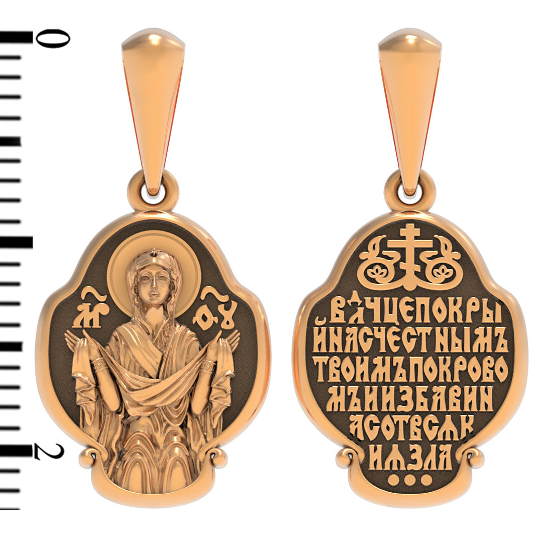На лицевой части образка изображена икона Покров Пресвятой Богородицы. Праздник Покрова Божией Матери является воспоминанием чуда, которое произошло во Влахнернской церкви 1 (14) октября 910 года: Пресвятая Богородица явилась верующим над алтарем храма и распростерла над ними Свое покрывало. В этот день Божья Матерь открыла людям, что Она является Ходатаицей за них перед Богом. Богородица простирает Свой молитвенный покров над всеми православными христианами и умоляет Сына Своего о даровании вечного спасения каждому человеку.