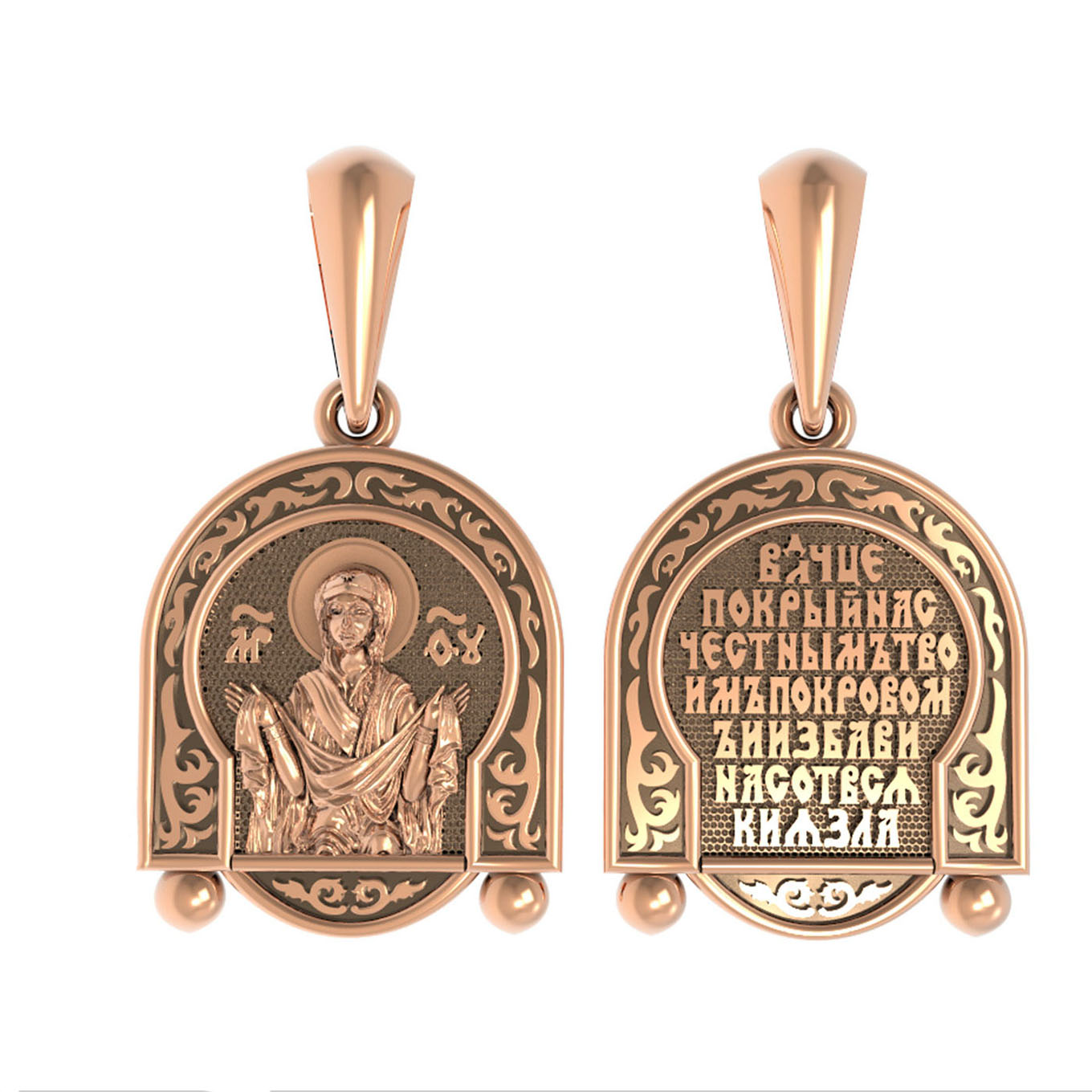 На лицевой части образка изображена икона Покров Пресвятой Богородицы. Праздник Покрова Божией Матери является воспоминанием чуда, которое произошло во Влахнернской церкви 1 (14) октября 910 года: Пресвятая Богородица явилась верующим над алтарем храма и распростерла над ними Свое покрывало. В этот день Божья Матерь открыла людям, что Она является Ходатаицей за них перед Богом. Богородица простирает Свой молитвенный покров над всеми православными христианами и умоляет Сына Своего о даровании вечного спасения каждому человеку.