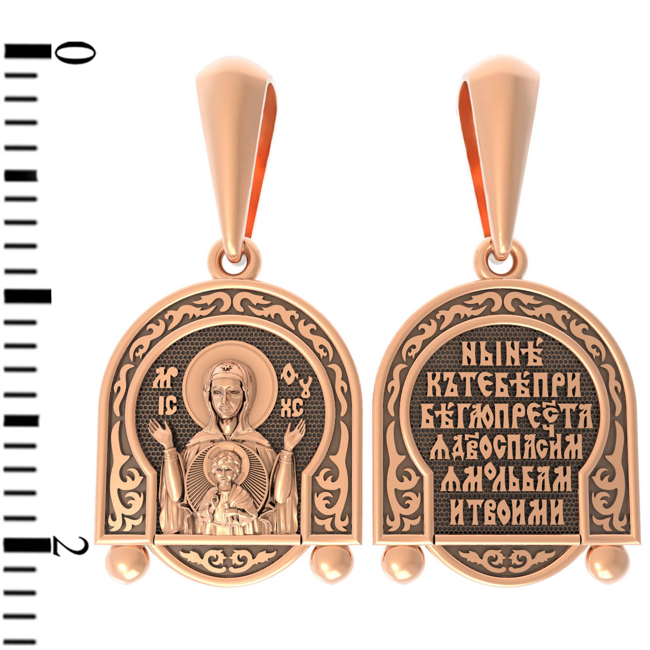 В центр образка помещен образ Божией Матери «Знамение», прославившийся многими чудесами в Новгороде в XII веке. Икона эта чтится как одна из самых великих святынь Русской земли. Молитвенно воздетые руки Богородицы означают заступничество за людей пред Богом. Рядом с Ней, на фоне круглого щита, — благословляющий Божественный Младенец — Спас-Эммануил.