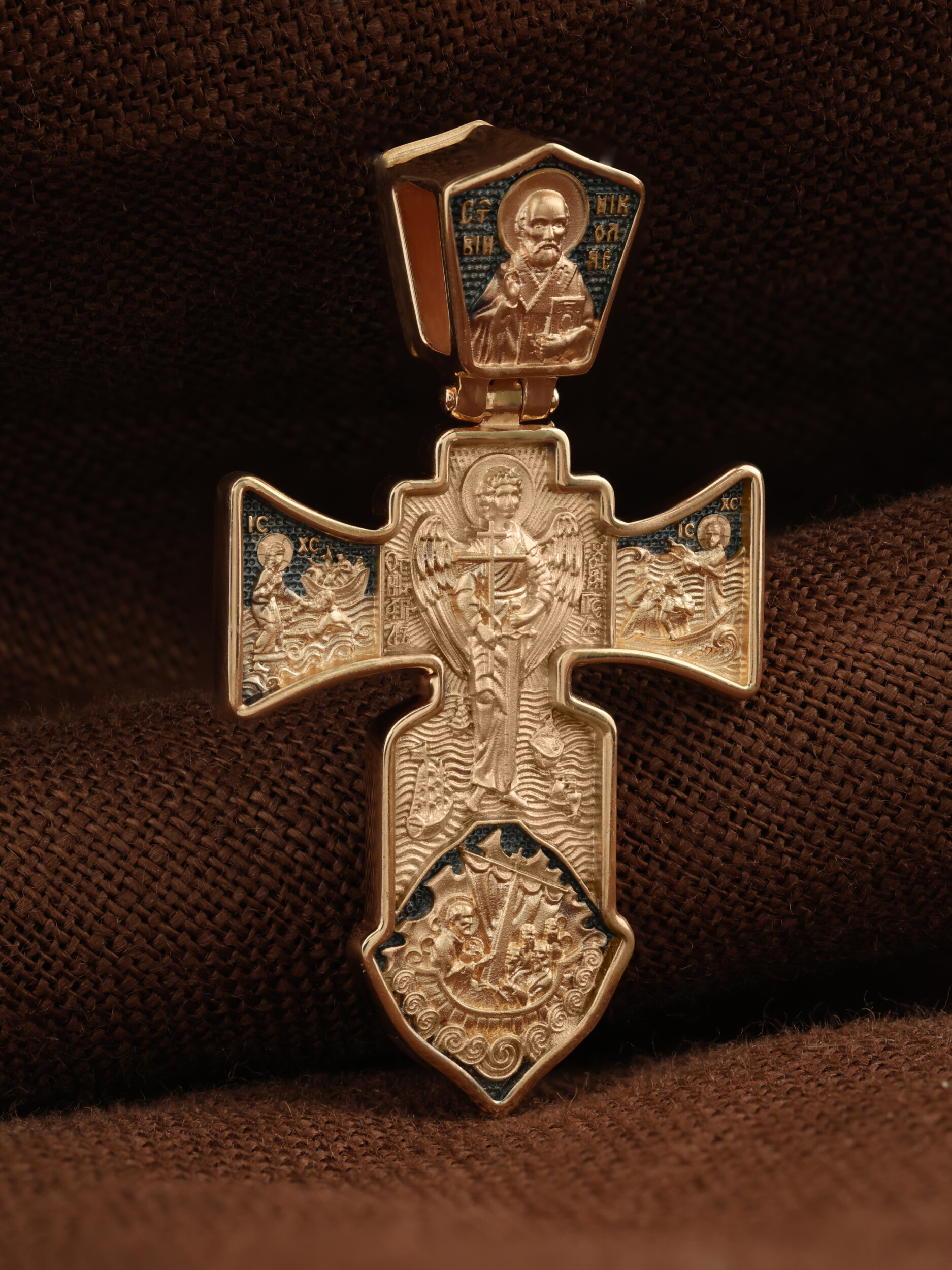 Оборот Морского креста весь посвящен охранению и спасению путешествующих по морю. В центре — могучая фигура Ангела Хранителя с крестом и мечом. Он стоит на волнах. Это образ Ангела Хранителя, стража душ человеческих как на море, так и в буре житейских страстей и искушений.