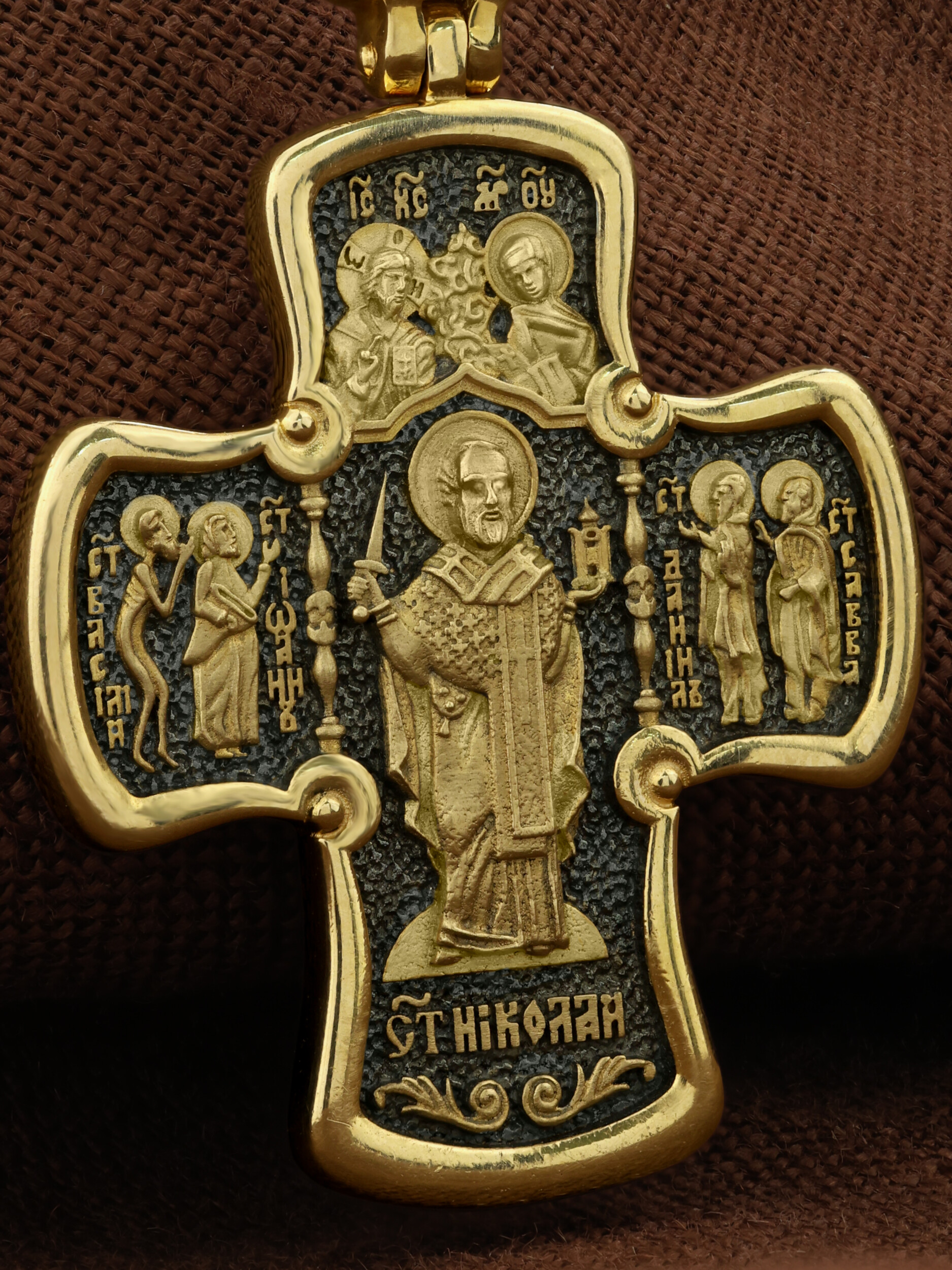 На обороте креста помещена икона самого почитаемого на Руси Святого — Николая Чудотворца (втор. пол. III в.).В руках Они держат знаки епископского достоинства. Чудотворец получил омофор и Евангелие лично из рук Богородицы и Спасителя как защитник и проповедник веры. С двух сторон от Святителя Николая помещены образы великих московских святых, прославившихся чудесами на всю Россию. Слева стоят Христа ради юродивые XVI века: Василий Блаженный, в честь которого назван самый знаменитый русский собор на Красной площади в Москве, и Иоанн Большой Колпак, блаженный, который похоронен в этом храме вместе с Василием Блаженным. Слева — преподобные чудотворцы Даниил Московский, младший сын Александра Невского, и Савва Сторожевский. Оба святых были основателями великих русских монастырей XIV века — Свято-Данилова в Москве и Саввино-Сторожевского в Звенигороде.