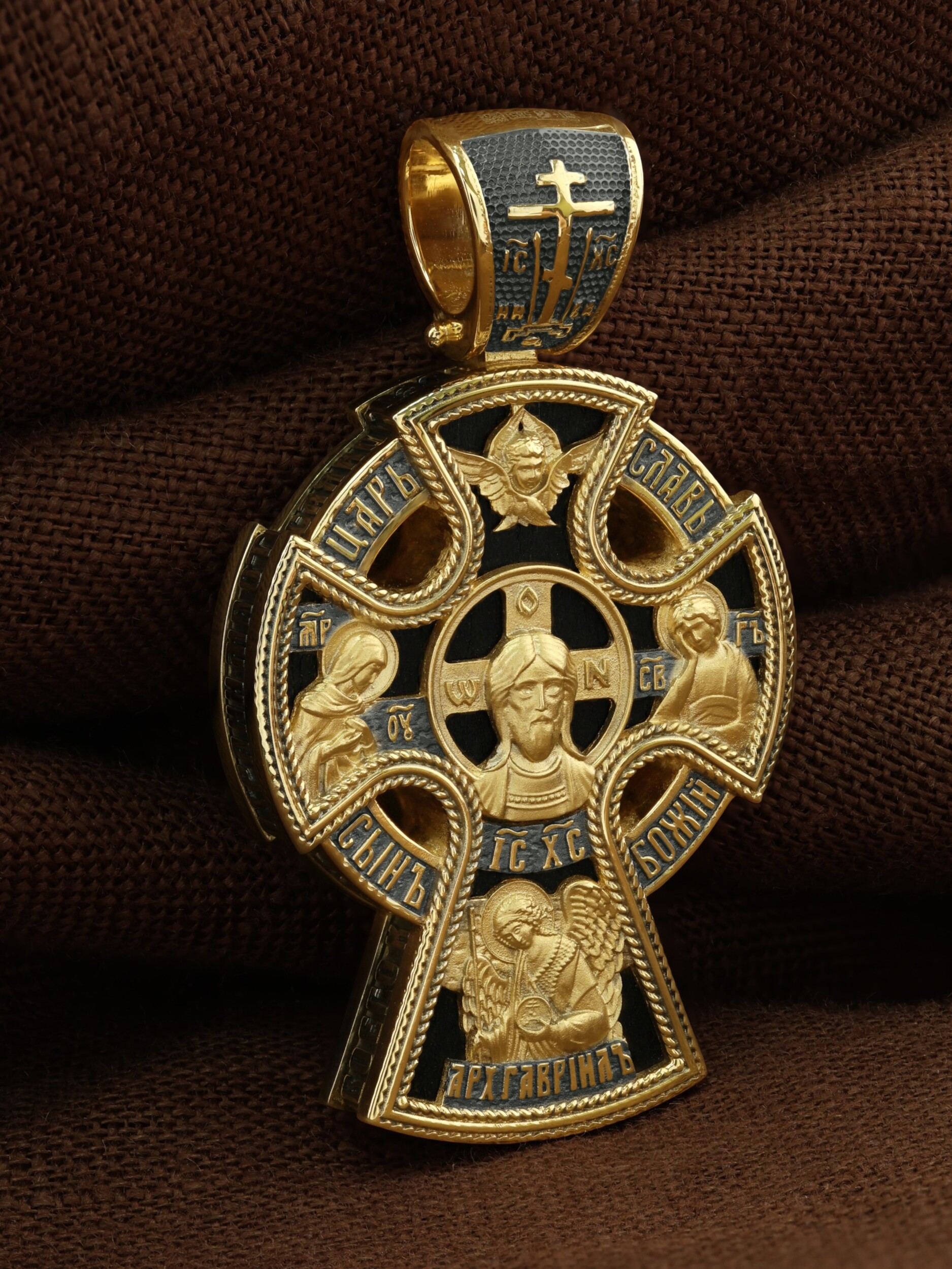 Крест объединяет в одной фигуре два христианских символа — круг-нимб и крест. Крест подобной формы был распространён в Новгородских землях в XIII—XVI веках. В центре лицевой стороны креста размещен образ Господа и Спасителя нашего Иисуса Христа — Господь Вседержитель или Пантократор (от греч. всевластный, всесильный). Именование Иисуса «Вседержителем» указывает, с одной стороны, на Его Божественную природу: «Аз есмь Альфа и Омега, начало и конец, говорит Господь, Который есть и был и грядет, Вседержитель» (Откр. 1: 8). С другой стороны, такое именование связано и с человеческой природой Христа, искупившего крестной жертвой людские грехи и обновившего тем самым человеческую природу. Крест сопровождается каноническими надписями: «Царь Славы» и «Сын Божий», что означает божественную природу Иисуса Христа, которые размещены по кругу. Слева от образа помещен лик Пречистой Богородицы, скорой помощницы и заступницы рода Христианского. Справа изображен апостол и евангелист Иоанн Богослов, один из ближайших учеников Иисуса Христа. Выше образа размещено изображение шестикрылого Серафима, ниже — Ар¬хан¬гела Гав¬ри¬ила. На кулонном кольце помещено изображение Креста «Голгофа», на котором был распят Господь и Спаситель наш Иисус Христос.