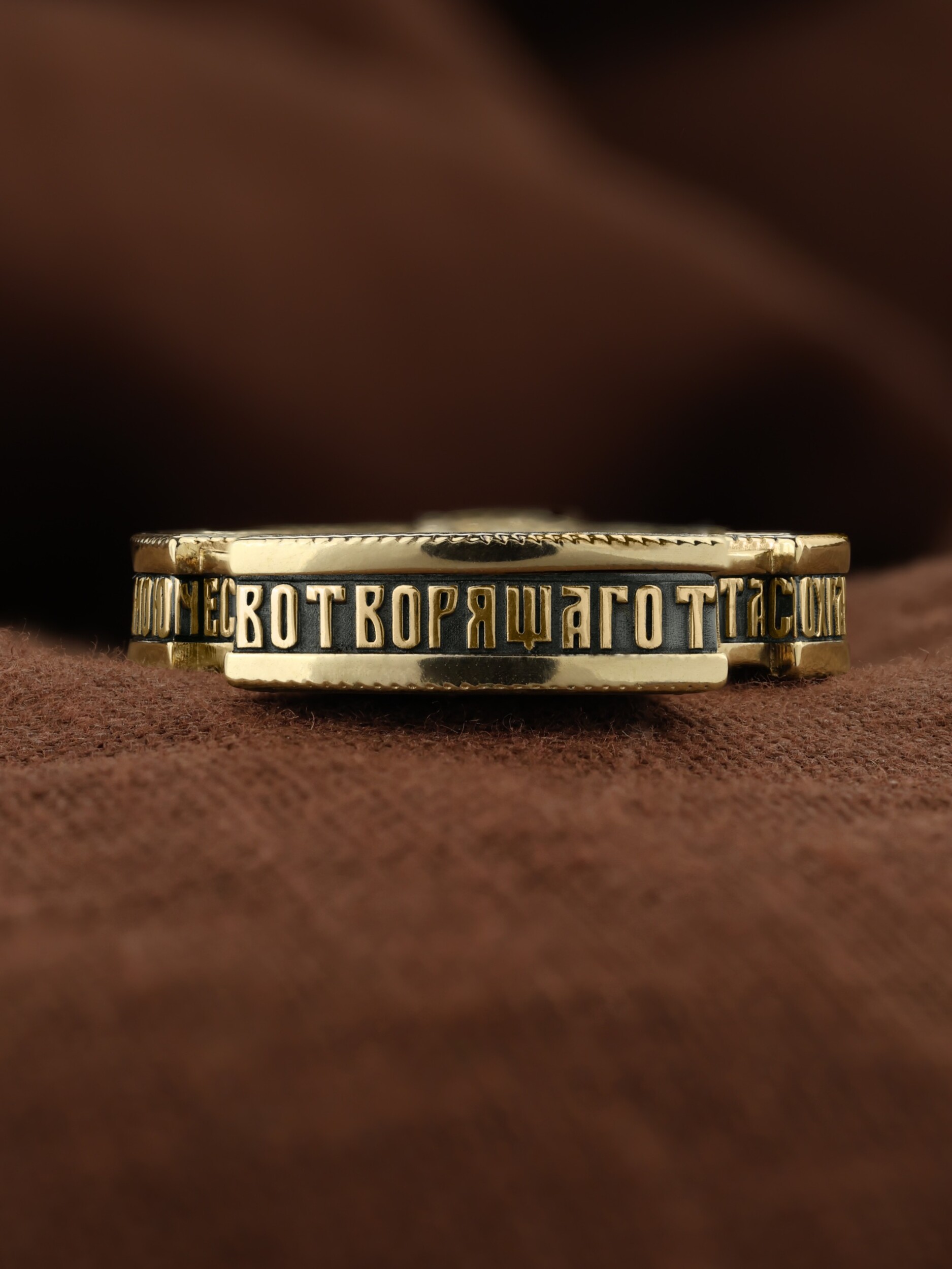 На оборотной стороне креста изображен Святитель Николай Чудотворец, архиепископ Мир Ликийских. Он является одним из самых почитаемых святых в православном мире. Вся жизнь святого Николая — это служение Богу. Из¬бран¬ник Бо¬жий Ни¬ко¬лай стал вершиной всех доб¬ро¬де¬те¬лей, под¬ня¬той до рай¬ской вы¬со¬ты. Чудес его исчислить невозможно. Николай Чудотворец подавал многим исцеления в болезнях и телесных недугах. Обогащал бедствующих в крайней нищете, подавал голодным пищу и всем являлся во всякой нужде готовым помощником, скорым предстателем и защитником. Помогал людям в бедах, спасал от потопления, освобождал из плена и избавлял от смерти. По кругу Креста размещена молитва: «Слава Тебе Боже наш».
