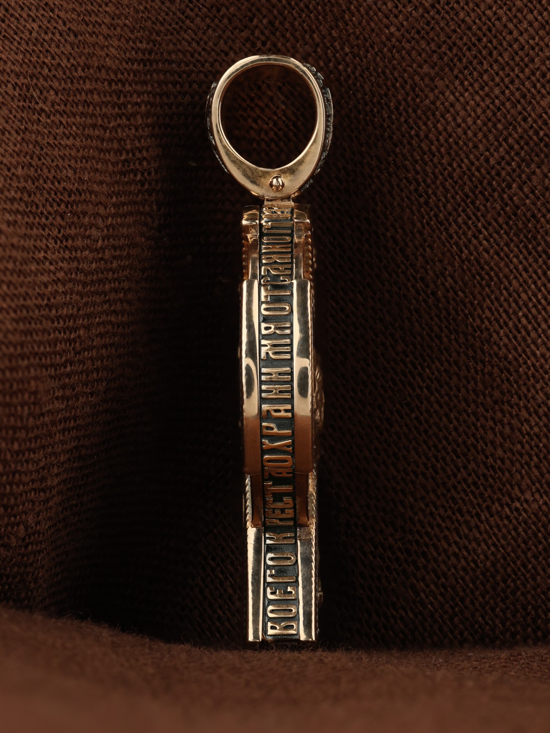 Крест объединяет в одной фигуре два христианских символа — круг-нимб и крест. Крест подобной формы был распространён в Новгородских землях в XIII—XVI веках. В центре лицевой стороны креста размещен образ Господа и Спасителя нашего Иисуса Христа — Господь Вседержитель или Пантократор (от греч. всевластный, всесильный). Именование Иисуса «Вседержителем» указывает, с одной стороны, на Его Божественную природу: «Аз есмь Альфа и Омега, начало и конец, говорит Господь, Который есть и был и грядет, Вседержитель» (Откр. 1: 8). С другой стороны, такое именование связано и с человеческой природой Христа, искупившего крестной жертвой людские грехи и обновившего тем самым человеческую природу. Крест сопровождается каноническими надписями: «Царь Славы» и «Сын Божий», что означает божественную природу Иисуса Христа, которые размещены по кругу. Слева от образа помещен лик Пречистой Богородицы, скорой помощницы и заступницы рода Христианского. Справа изображен апостол и евангелист Иоанн Богослов, один из ближайших учеников Иисуса Христа. Выше образа размещено изображение шестикрылого Серафима, ниже — Ар¬хан¬гела Гав¬ри¬ила. На кулонном кольце помещено изображение Креста «Голгофа», на котором был распят Господь и Спаситель наш Иисус Христос.