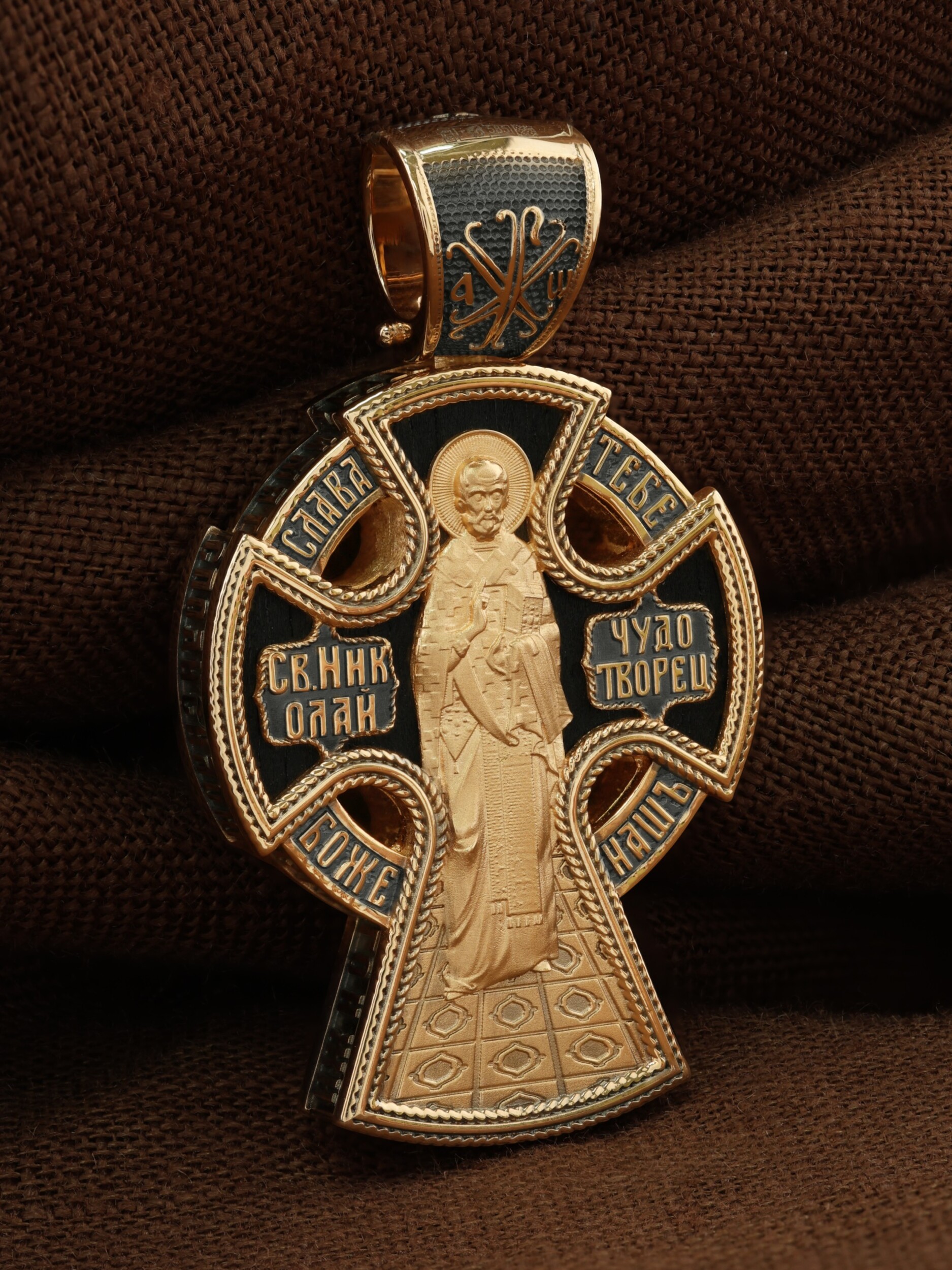 На оборотной стороне креста изображен Святитель Николай Чудотворец, архиепископ Мир Ликийских. Он является одним из самых почитаемых святых в православном мире. Вся жизнь святого Николая — это служение Богу. Из¬бран¬ник Бо¬жий Ни¬ко¬лай стал вершиной всех доб¬ро¬де¬те¬лей, под¬ня¬той до рай¬ской вы¬со¬ты. Чудес его исчислить невозможно. Николай Чудотворец подавал многим исцеления в болезнях и телесных недугах. Обогащал бедствующих в крайней нищете, подавал голодным пищу и всем являлся во всякой нужде готовым помощником, скорым предстателем и защитником. Помогал людям в бедах, спасал от потопления, освобождал из плена и избавлял от смерти. По кругу Креста размещена молитва: «Слава Тебе Боже наш».