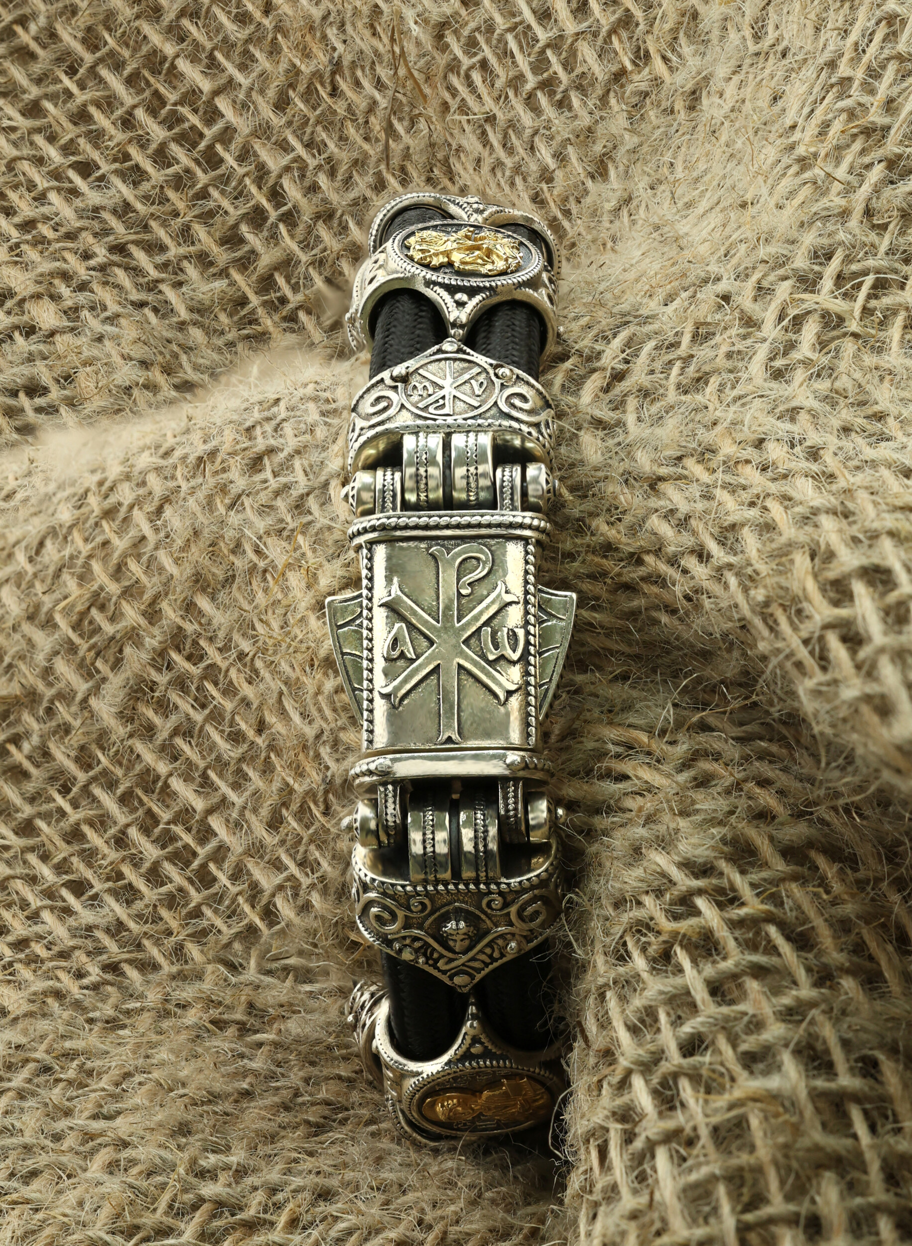 Браслет из серебра и золота c ониксом и шёлковым шнурком