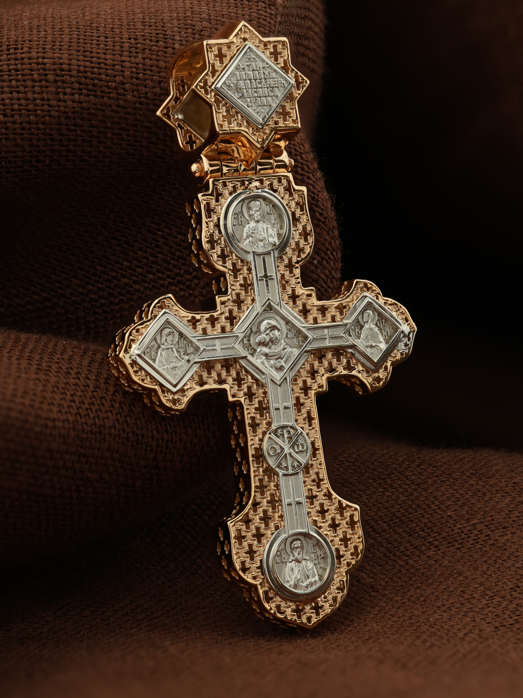 На лицевой стороне креста изображено Распятие Господа и Спасителя нашего Иисуса Христа. Крест- символ спасения и искупления рода человеческого, знамение победы над смертью и адом. Иисус Христос, как искупительная жертва освобождения человечества от власти греха, умер крестной смертью и в третий день воскрес. На верхней табличке, выше головы Иисуса, расположена надпись, составленная Понтием Пилатом — «IНЦI». Она означает «Иисус Назорей, Царь Иудейский». Над перекладиной написано сокращенно имя Спасителя «IC» «XC» — Иисус Христос. Ниже перекладины написано слово «НИКА» (греч. — Победитель). Слева от Распятия помещен лик Пречистой Богородицы, скорой помощницы и заступницы рода Христианского. Слева изображен апостол и евангелист Иоанн Богослов, один из ближайших учеников Иисуса Христа. Над Распятием изображение Этимасии (греч. — готовность) — престола, уготованного для второго пришествия Господа Иисуса Христа, грядущего вершить Суд над живыми и мертвыми (Пс.IX,5−8). Ниже Распятия размещен образ Святителя Спиридона Тримифунтского. На лицевой стороне кулонного кольца изображен Ангел Хранитель, а на оборотной стороне — слова молитвы: «Господи помилуй. Спаси и сохрани».