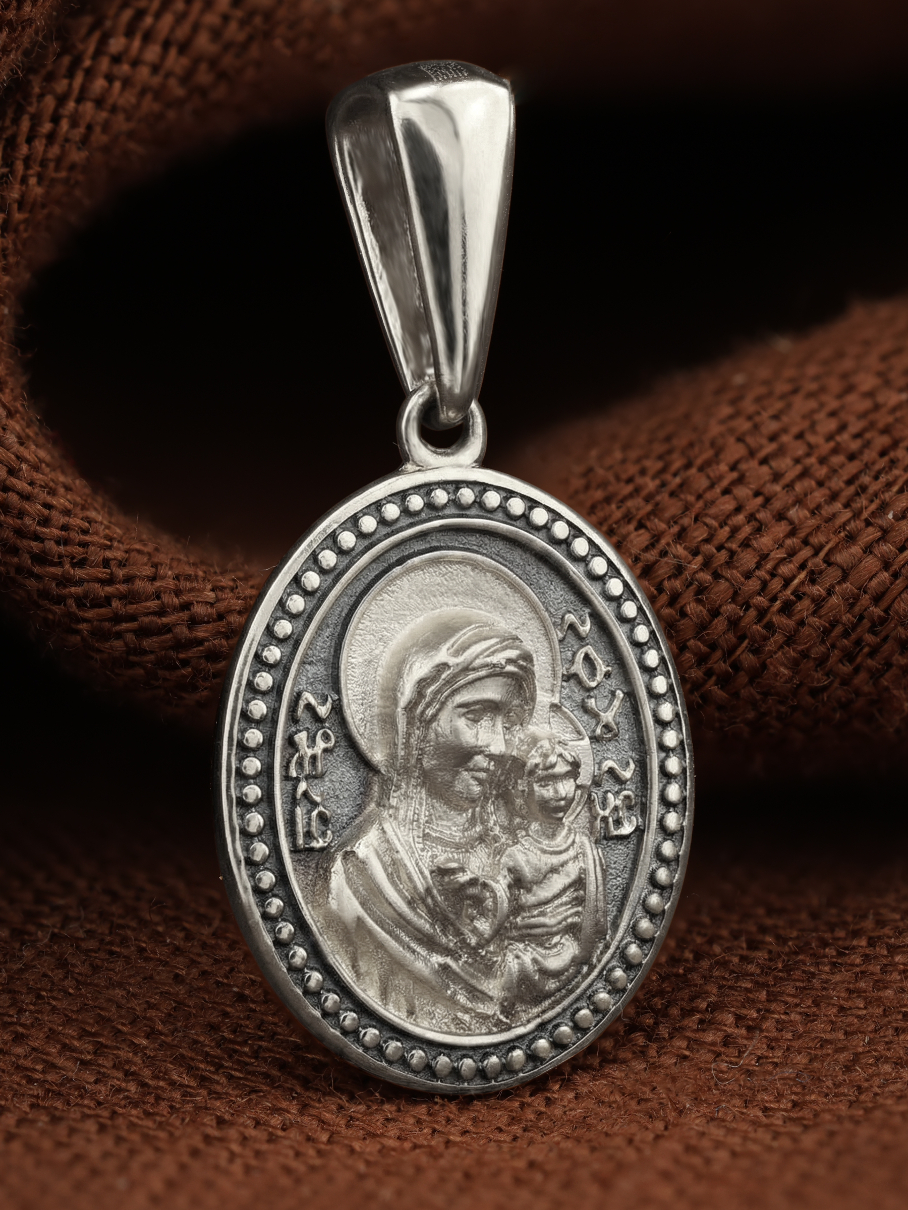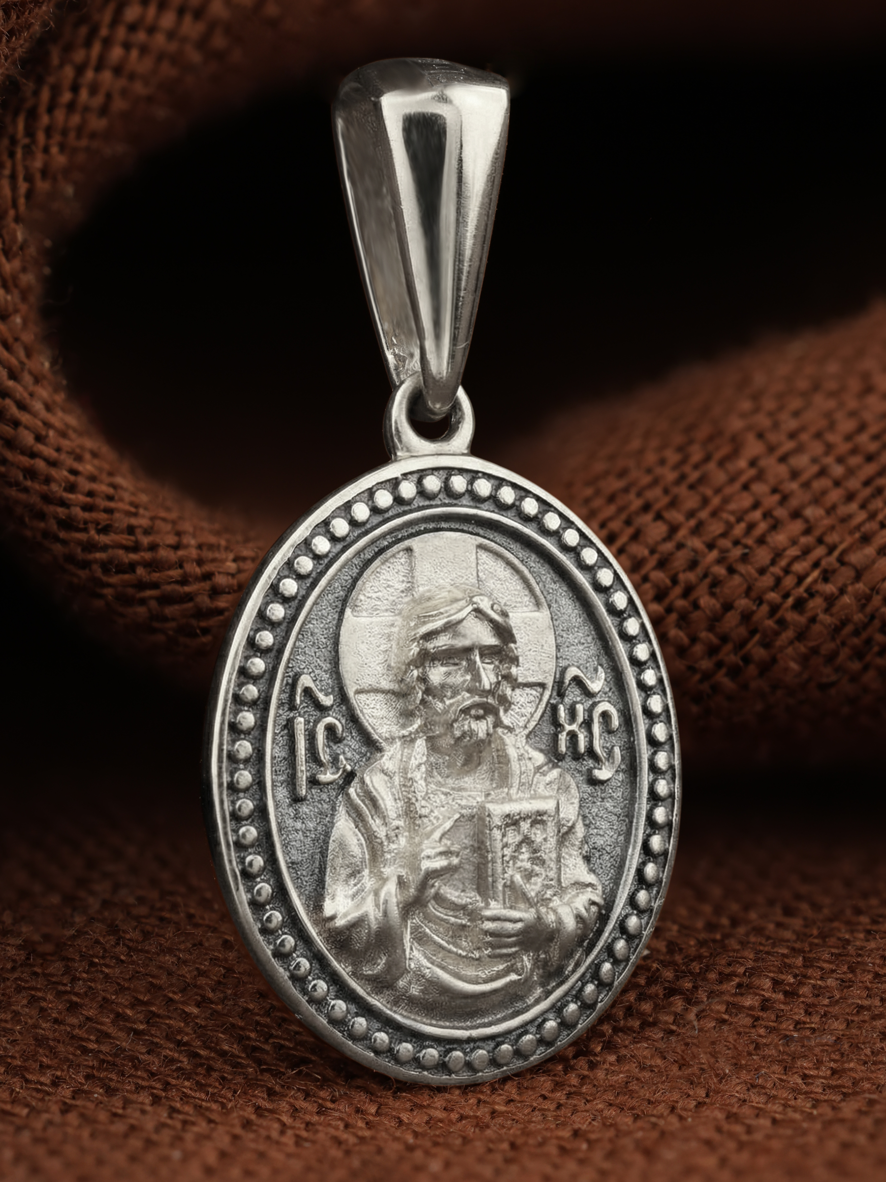 На лицевой части образка изображен Спас Вседержитель или Пантократор (от греч. «панратос» — всевластный, всесильный) — центральный образ в иконографии Христа, представляющий Его как Небесного Царя и Судию. Господь правой рукой благословляет, а в левой держит Книгу Жизни, в которой для каждого человека есть своя страница.