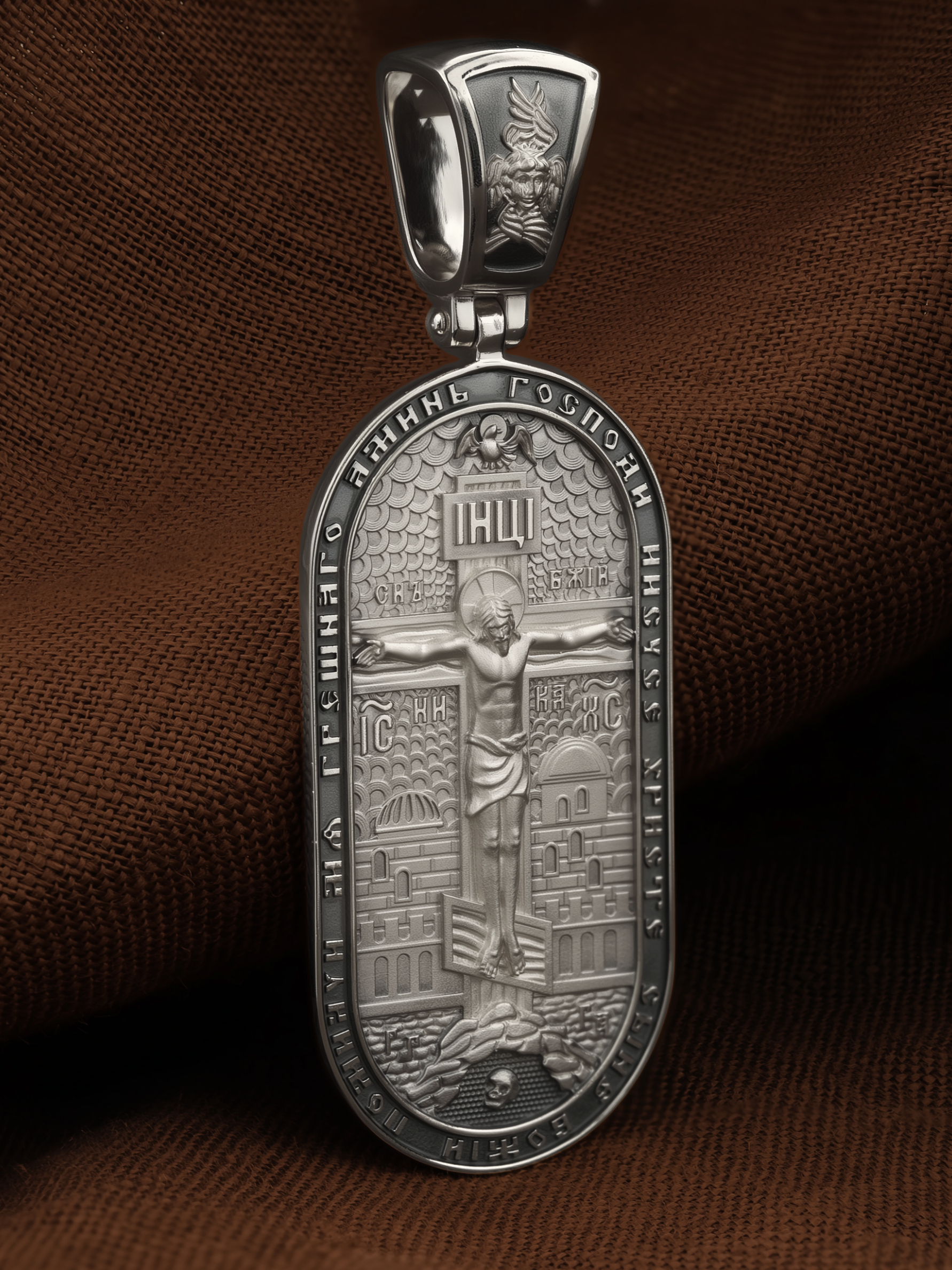 Центральную часть лицевой стороны занимает Распятие Христа — образ жертвы, принесенной Господом за грехи людей. Именно ко Христу, сошедшему на землю ради нашего спасения, возносятся все молитвы. Рядом с Его образом помещены слова — «НИКА» (греч. — Победитель) и «СЫН БОЖИЙ». Эти слова характеризуют Господа как Великого Архиерея, победителя смерти. Также Распятие сопровождается надписями, олицетворяющими Христа — это святое имя Христа «IC» (Иисус) «ХС» (Христос). Верхняя перекладина символизирует собой табличку с надписью «IHЦI» — Иисус Назарянин Царь Иудейский. Возвышение, на котором стоит Крест, символизирует гору Голгофу, на которой произошло Распятие. У подножия Креста изображают прах Адама, обозначенный черепом. На кулонном кольце изображен шестикрылый Серафим — самый приближенный к Господу Ангел. По контуру образка написана молитва: «Господи Иисусе Христе, Сыне Божий, помилуй мя грешного. Аминь»