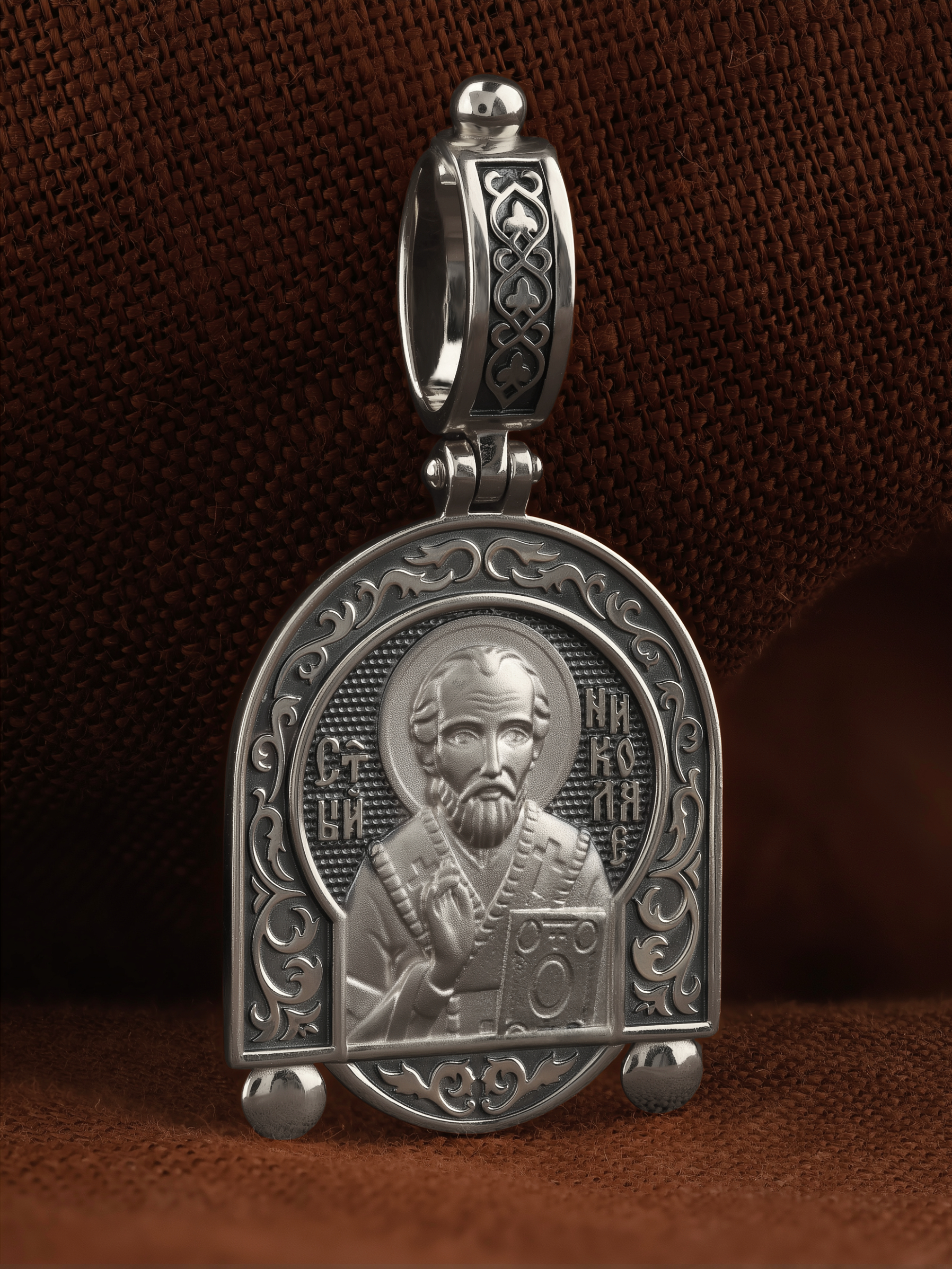 На лицевой стороне образка изображен Святитель Николай архиепископ Мир Ликийских, Чудотворец. Он является одним из самых почитаемых святых в православном мире. Святитель Николай родился во второй половине III века в Малой Азии в Ликийском городе Патары. С рождения Божий Угодник проявлял необыкновенные дарования. Сохранилось Предание, что во время крещения он, никем не поддерживаемый, простоял в купели три часа. Приняв сан священника, святитель Николай стал проводить еще более строгую подвижническую жизнь. Избранник Божий Николай стал вершиной всех добродетелей, поднятой до райской высоты. С кем из величайших праведников не сравнялся он образом духов­ной красоты, кому из них не последовал в своих деяниях и чудотворениях? Вся жизнь святого Николая — это служение Богу. Много великих и преславных чудес сотворил великий Святитель Николай Угодник. Он помогал сущим в бедах, укрощал штормы, спасал от потопления и выносил на сушу из глубины морской, освобождал из плена и приносил освобожденных домой, избавлял от уз и темницы, защищал от посечения мечом, освобождал от смерти и подавал многим различные исцеления: слепым — прозрение, хромым — хождение, глухим — слух, немым — дар слова.