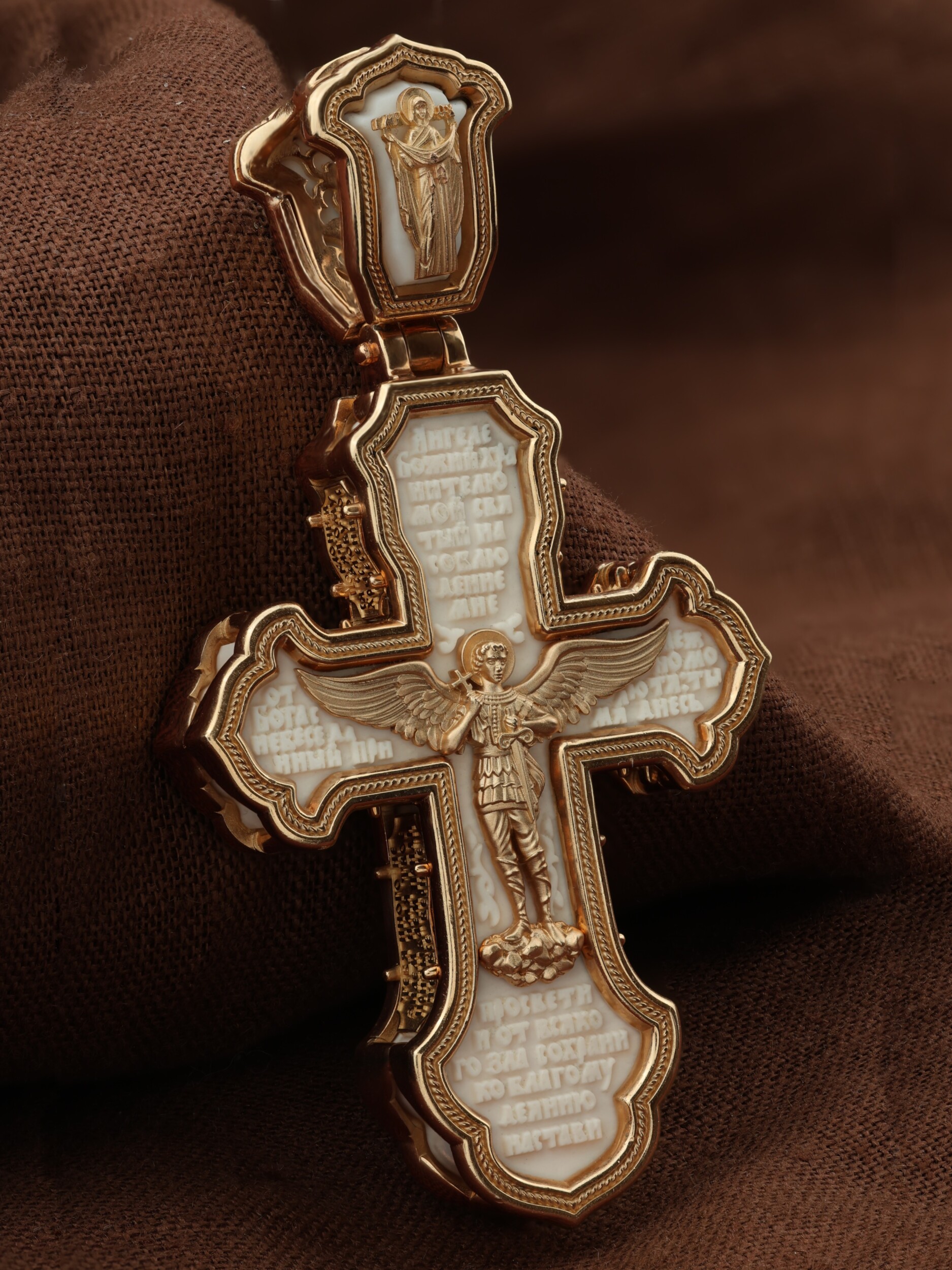В центре оборотной стороне креста изображен Святой Агнгел-Хранитель в виде юноши держащего в правой руке крест, а в левой — мечь. Агнгел-Хранитель — это Ангел приставляемый Богом к человеку при крещении для охраны и помощи в добрых делах. Он невидимо находится при человеке на протяжении всей его жизни, если человек сохраняет в себе любовь к Богу и истинную веру перед Ним. По сторонам от изображения помещена молитва: «Ангеле Божий, хранителю мой святый, на соблюдение мне от Бога с небесе данный! Прилежно молю тя: ты мя днесь просвети, и от всякаго зла сохрани, ко благому деянию настави…». На кулонном кольце изображена икона Божией Матери «Покров Пресвятой Богородицы».