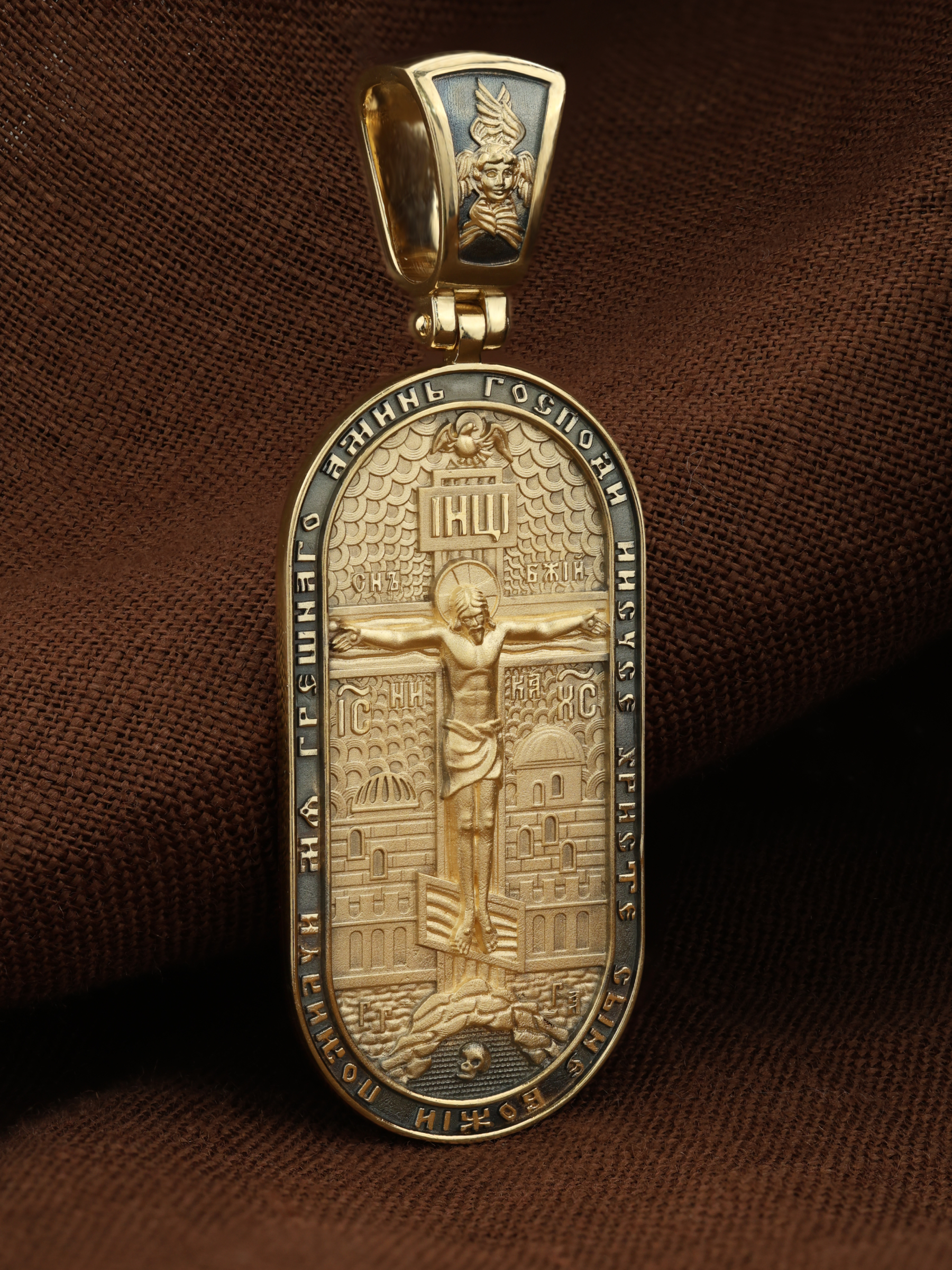 Центральную часть лицевой стороны занимает Распятие Христа — образ жертвы, принесенной Господом за грехи людей. Именно ко Христу, сошедшему на землю ради нашего спасения, возносятся все молитвы. Рядом с Его образом помещены слова — «НИКА» (греч. — Победитель) и «СЫН БОЖИЙ». Эти слова характеризуют Господа как Великого Архиерея, победителя смерти. Также Распятие сопровождается надписями, олицетворяющими Христа — это святое имя Христа «IC» (Иисус) «ХС» (Христос). Верхняя перекладина символизирует собой табличку с надписью «IHЦI» — Иисус Назарянин Царь Иудейский. Возвышение, на котором стоит Крест, символизирует гору Голгофу, на которой произошло Распятие. У подножия Креста изображают прах Адама, обозначенный черепом. На кулонном кольце изображен шестикрылый Серафим — самый приближенный к Господу Ангел. По контуру образка написана молитва: «Господи Иисусе Христе, Сыне Божий, помилуй мя грешного. Аминь»