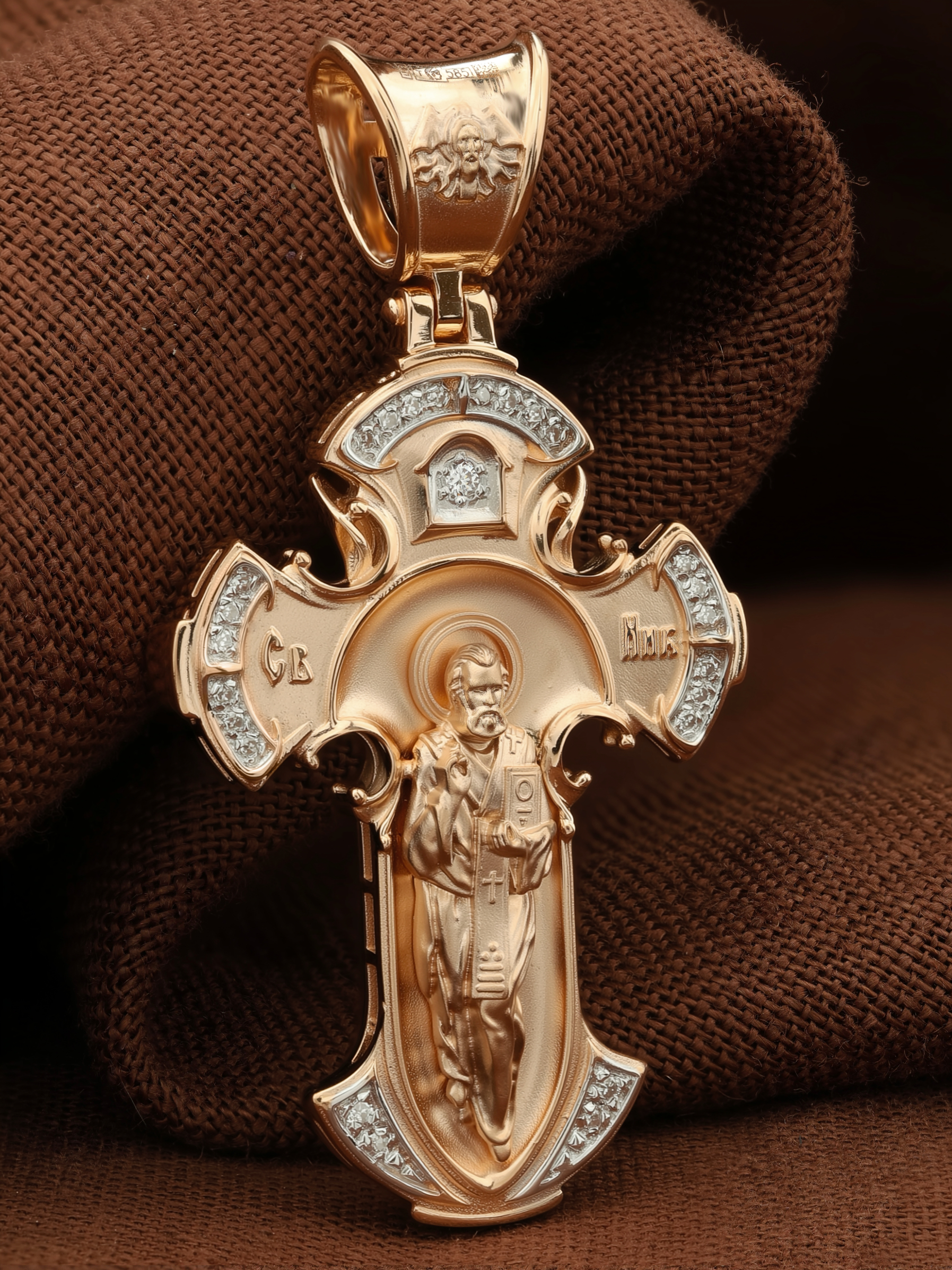 Оборотную сторону креста возглавляет икона святителя Николая Чудотворца. На кулонном кольце помещено изображение Спаса Нерукотворного — образ Спасителя, который Он запечатлел на плате и передал для исцеления больному проказой царю Эдессы. ему придается победное и защитное значение.