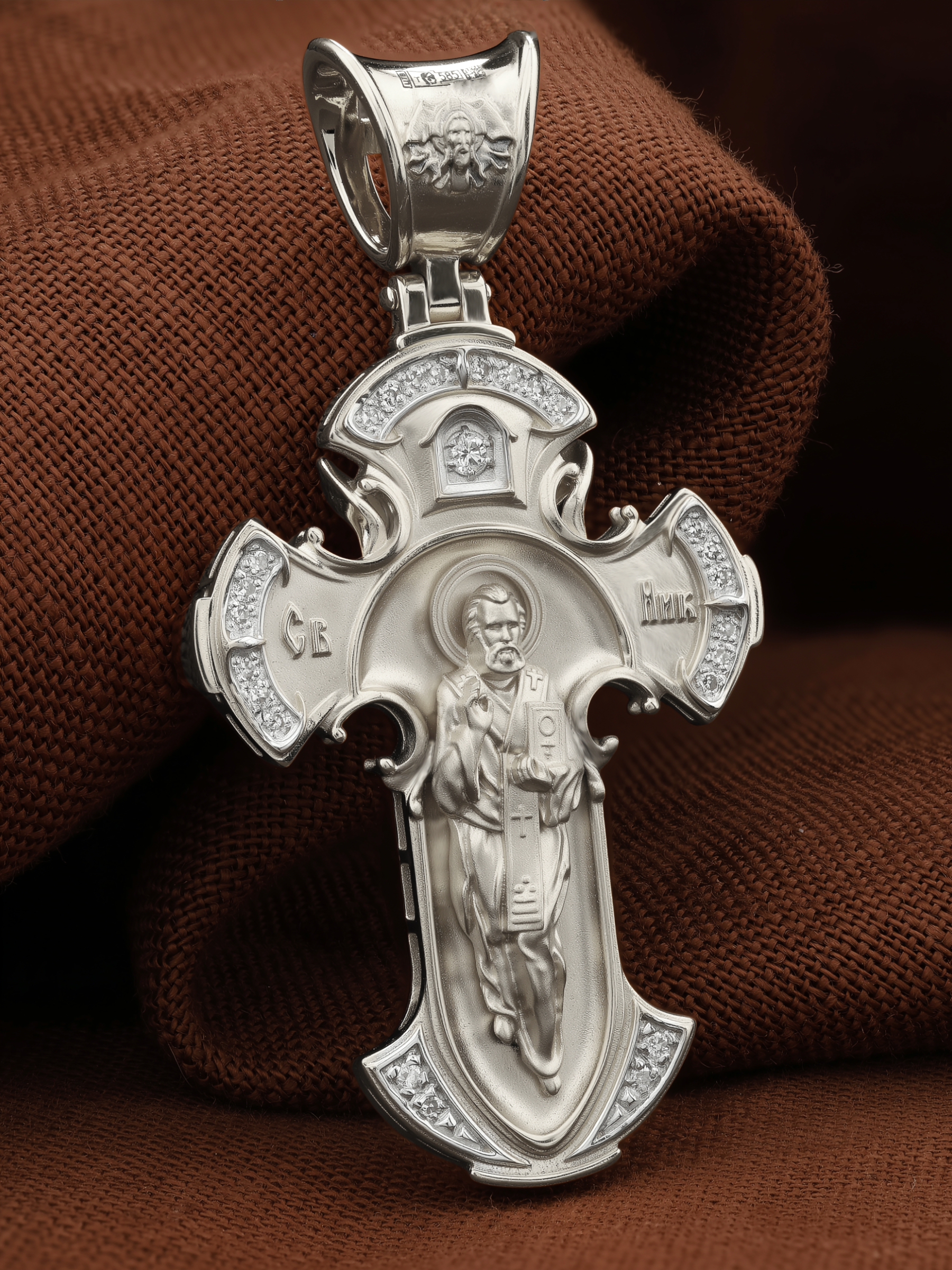 Оборотную сторону креста возглавляет икона святителя Николая Чудотворца. На кулонном кольце помещено изображение Спаса Нерукотворного — образ Спасителя, который Он запечатлел на плате и передал для исцеления больному проказой царю Эдессы. ему придается победное и защитное значение.
