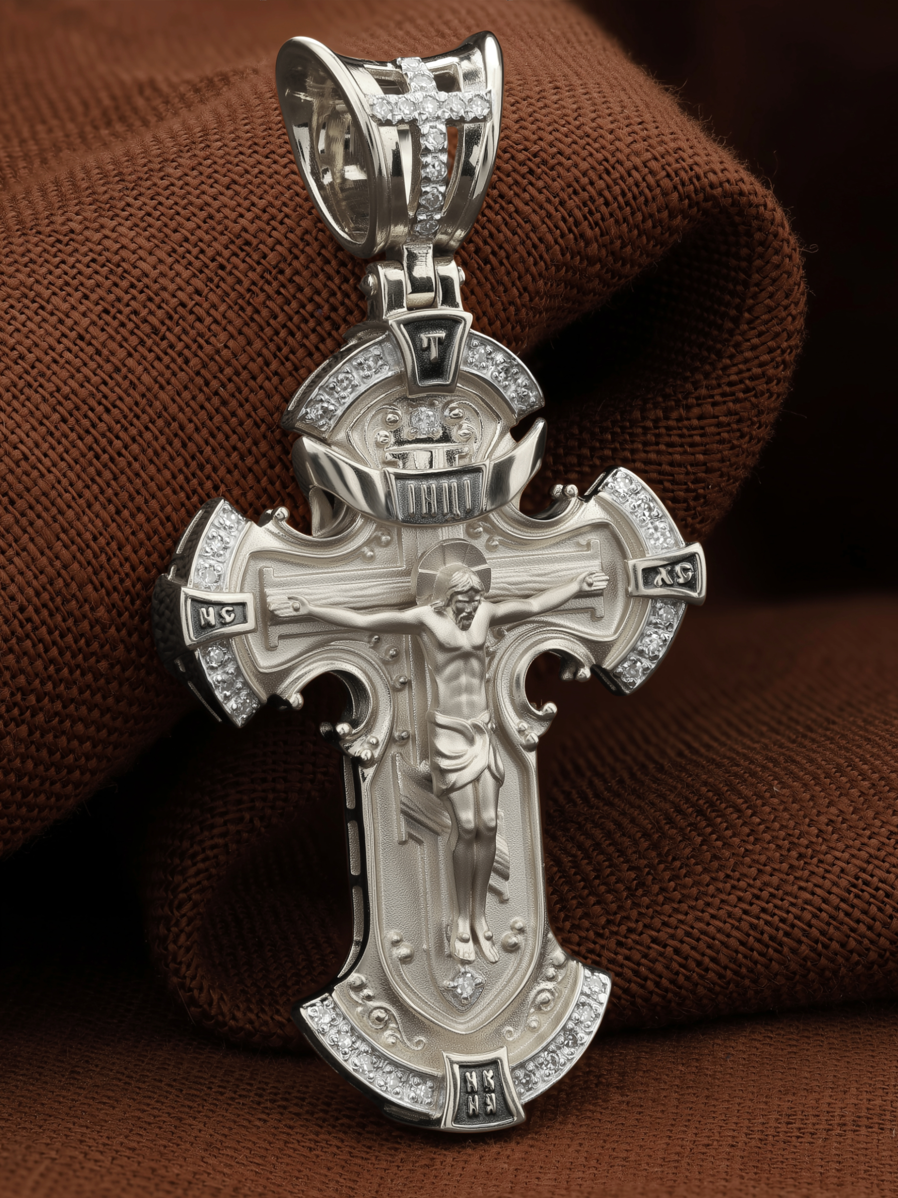 На лицевой стороне креста изображено Распятие Иисуса Христа на Голгофском Кресте, верхняя перекладина которого символизирует титло — табличку, на которой, согласно Евангелию, было начертано: Иисус Назорей Царь Иудейский (IНЦI). Справа и слева от Распятия изображены символы «IС ХС» — святое имя Христа. Внизу креста написано слово «НИКА», что значит «победитель». В верхней части креста обозначена буква «Т», которая символизирует одно из орудий страданий Господа — трость.