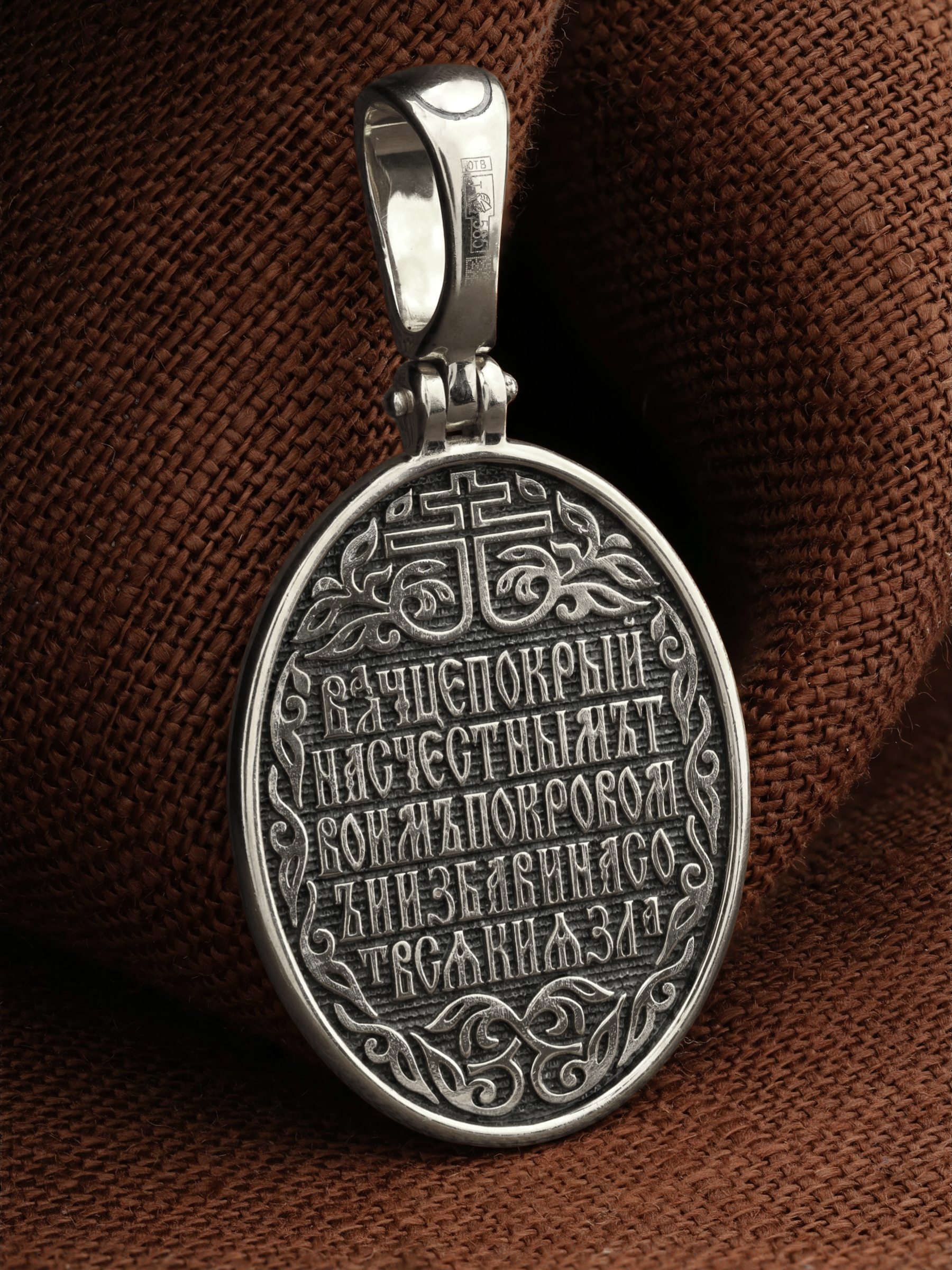 На обороте образка написано: «Владычице, покрой нас Честным Твоим покровом и избави нас от всякия зла».