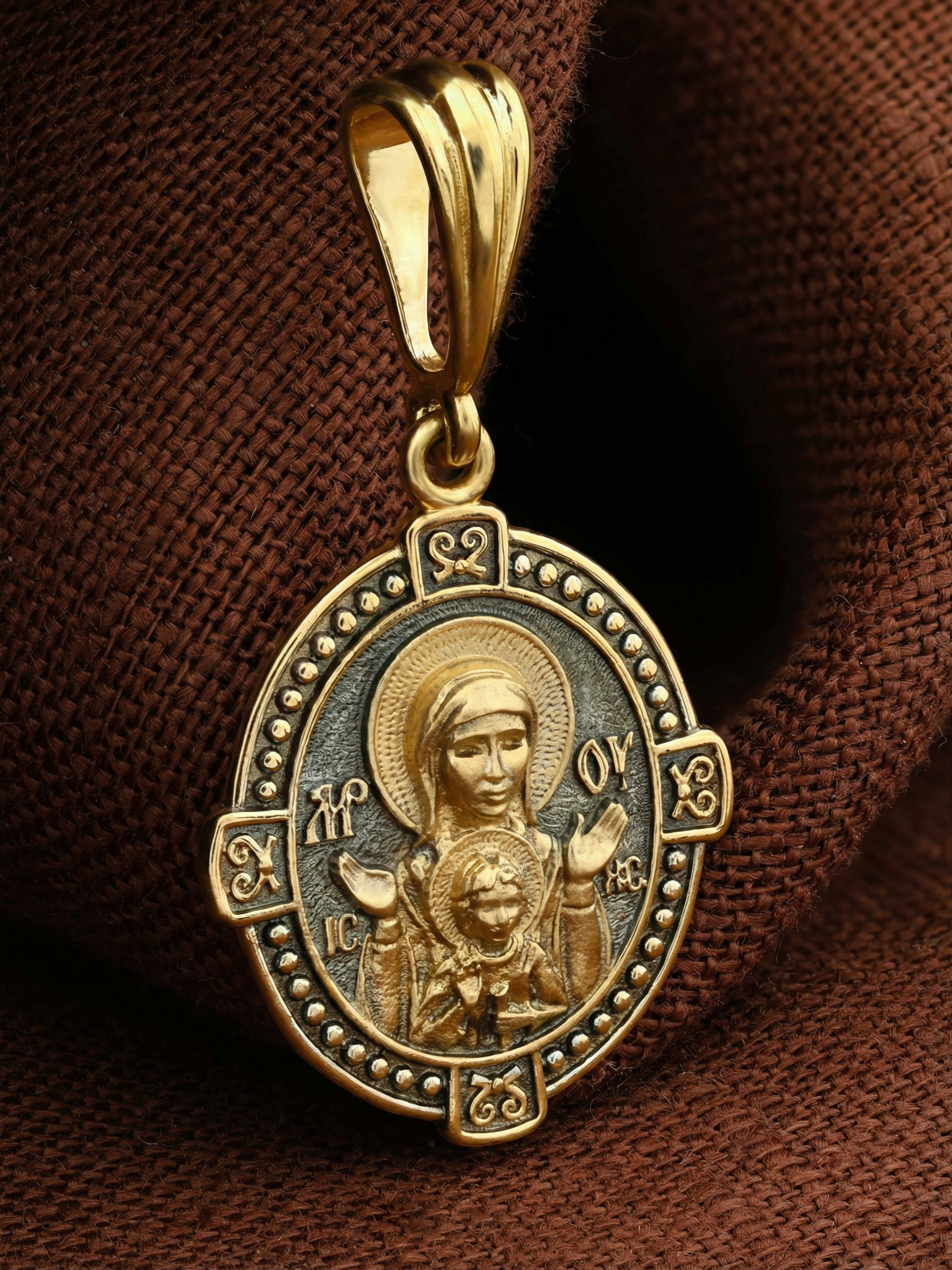 В центр образка помещен образ Божией Матери «Знамение», прославившийся многими чудесами в Новгороде в XII веке. Икона эта чтится как одна из самых великих святынь Русской земли. Молитвенно воздетые руки Богородицы означают заступничество за людей пред Богом. Рядом с Ней, на фоне круглого щита, — благословляющий Божественный Младенец — Спас-Эммануил.
