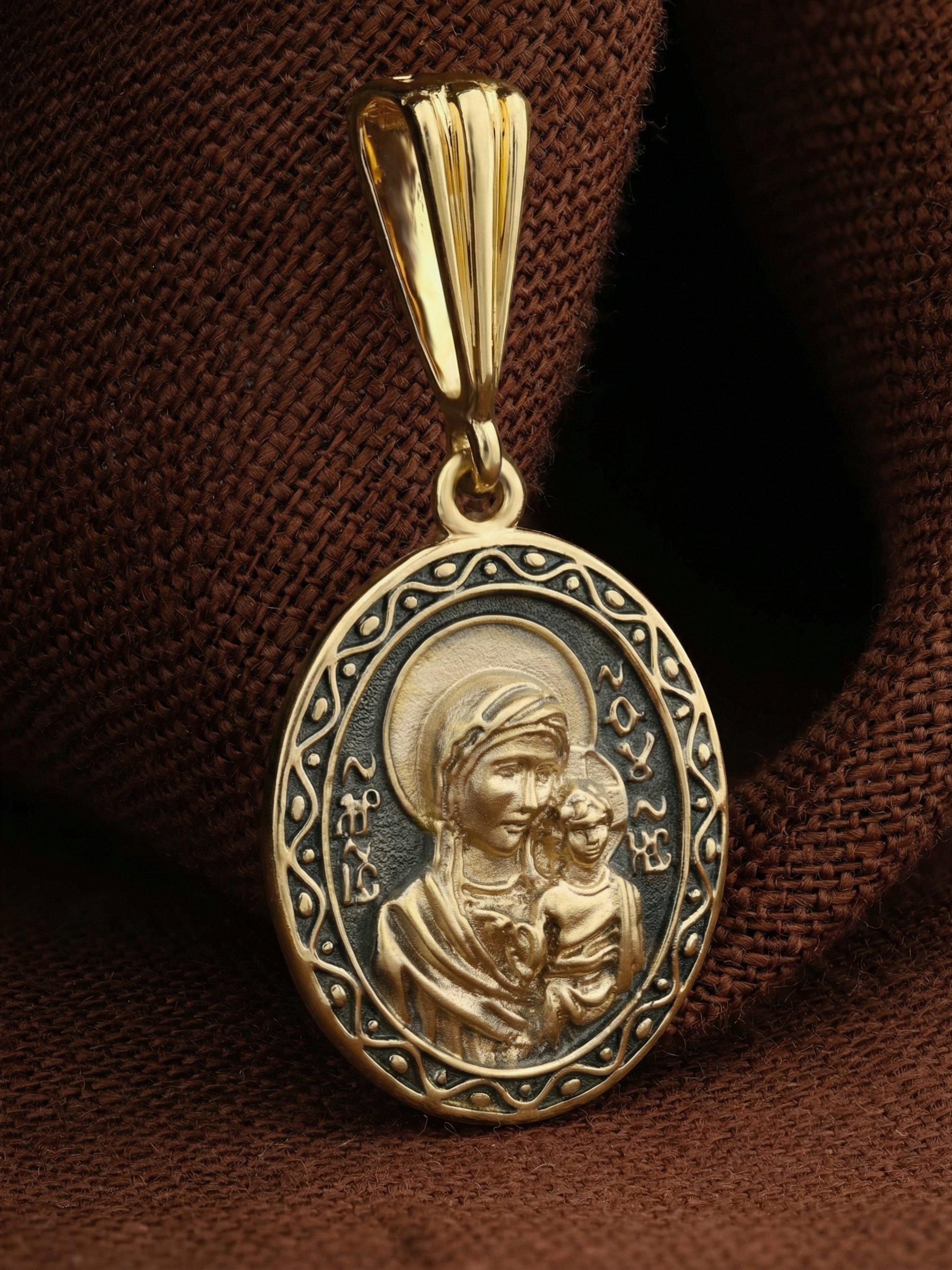 На лицевой части образка изображен Спас Вседержитель или Пантократор (от греч. «панкратос"— всевластный, всесильный) — центральный образ в иконографии Христа, представляющий Его как Небесного Царя и Судию. Господь правой рукой благословляет, а в левой держит Книгу Жизни, в которой для каждого человека есть своя страница.