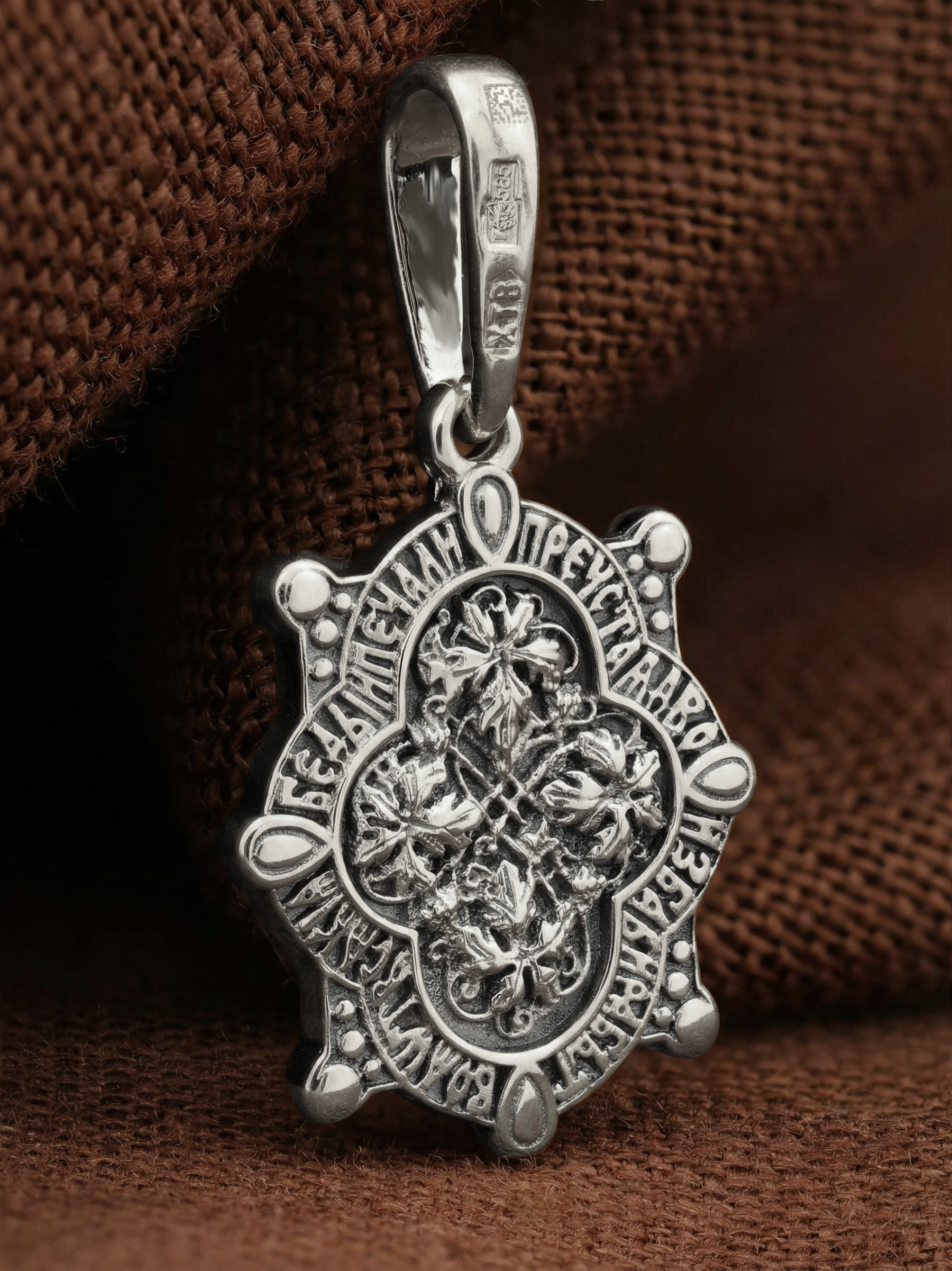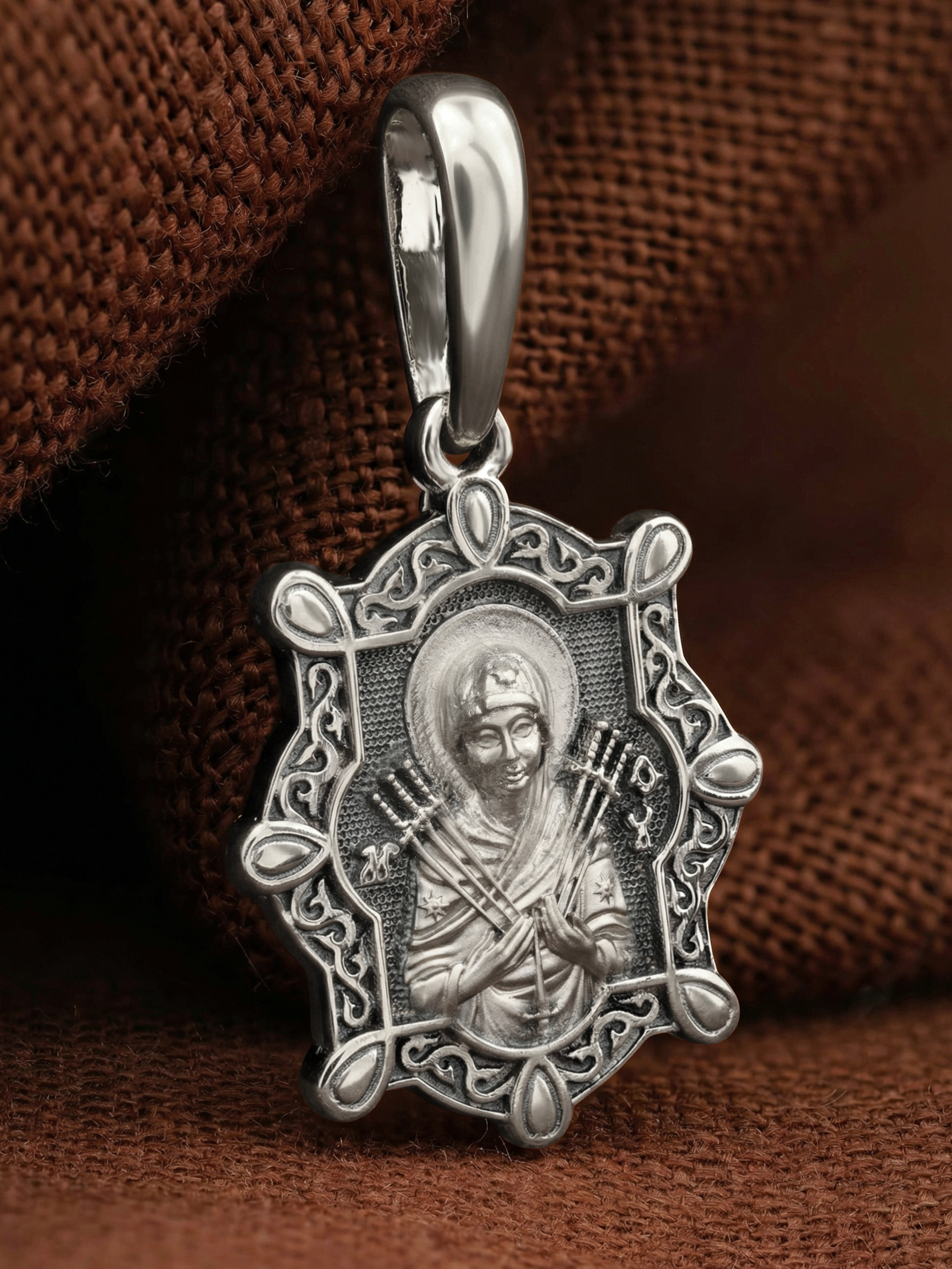 На лицевой стороне образка изображена икона Пресвятой Богородицы «Семистрельная» — одна из самых чудотворных икон на Руси. На протяжении многих веков христиане взывали к Царице Небесной через эту икону, если в стране начинались войны или мятежи.