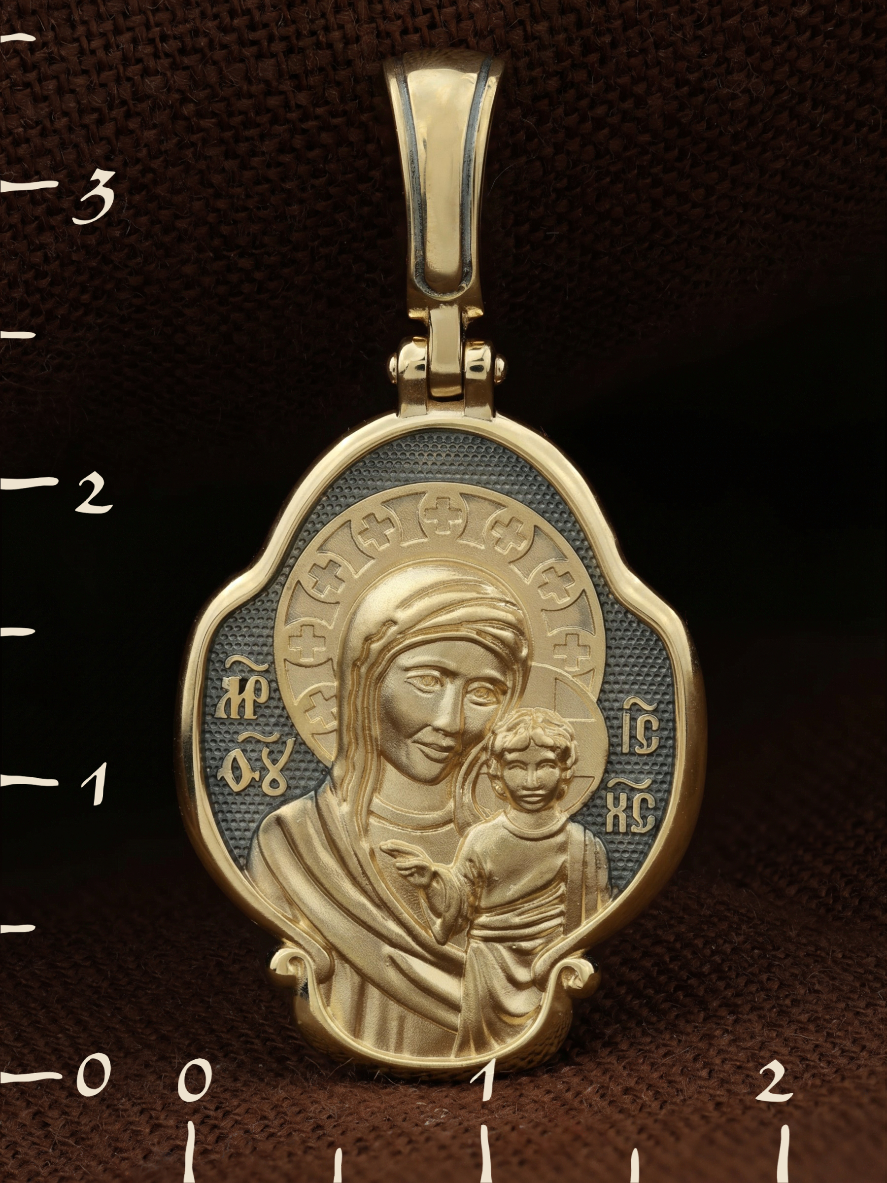 На лицевой части образка изображена Казанская икона Божией Матери — одна из самых почитаемых в России чудотворных икон Богородицы. Богословское значение Казанской иконы — указать верующим истинный Путь к спасению, который лежит через Христа. Только Божия Матерь имеет настолько сильное дерзновение к Спасителю, что может ходатайствовать перед Ним за всех верных. Именно этот образ дарится новой повенчанной паре, как хранитель очага и семейная реликвия. Молитва перед Казанской иконой Божьей Матери помогает во всех сложных случаях жизни, в болезнях, во всех печалях, невзгодах, скорбях. Уникальная история появления, чудеса, случившиеся по молитвам православных людей возле образа — все это делает Казанскую Богородицу особенной, среди тысяч других икон.
