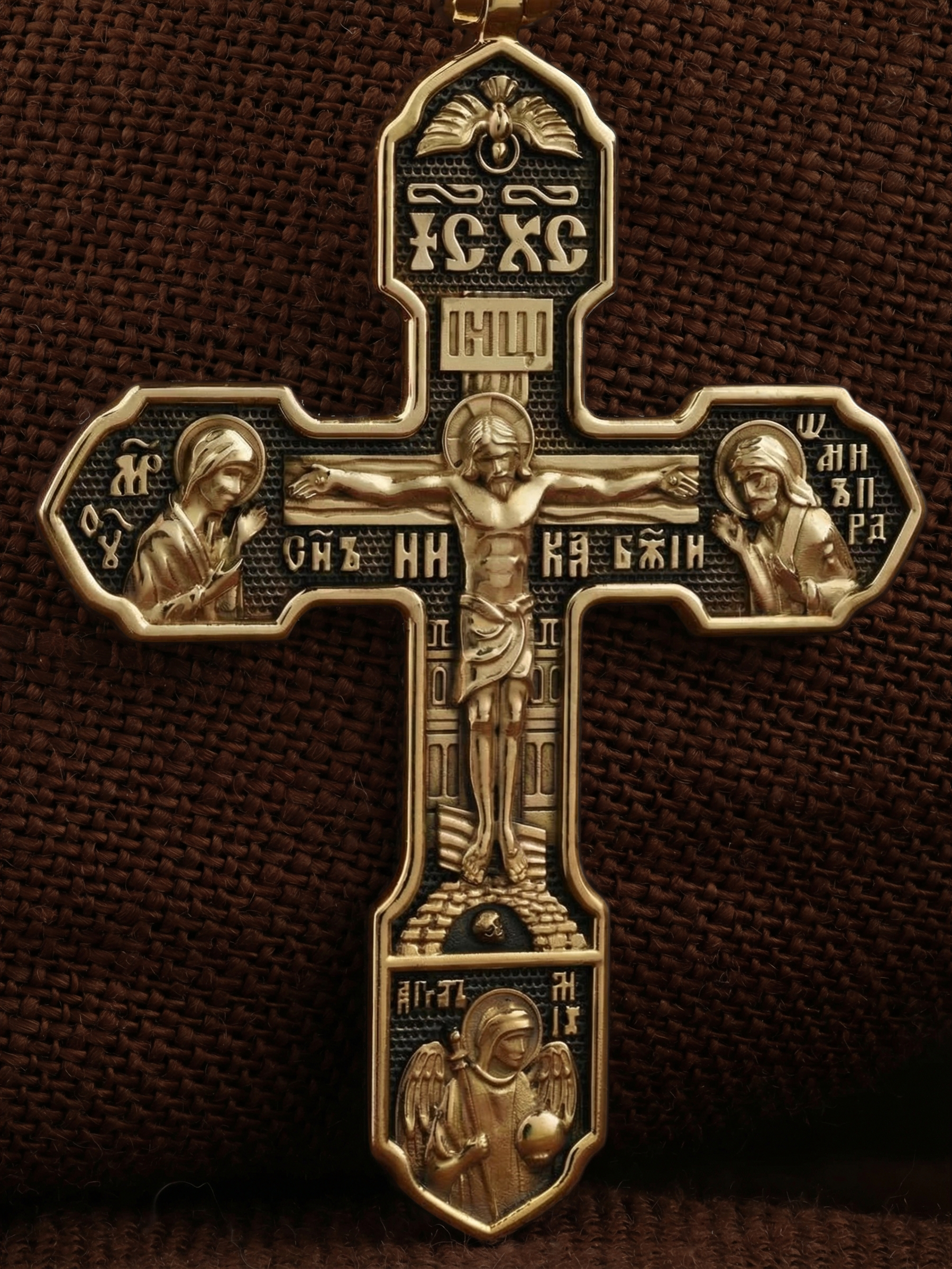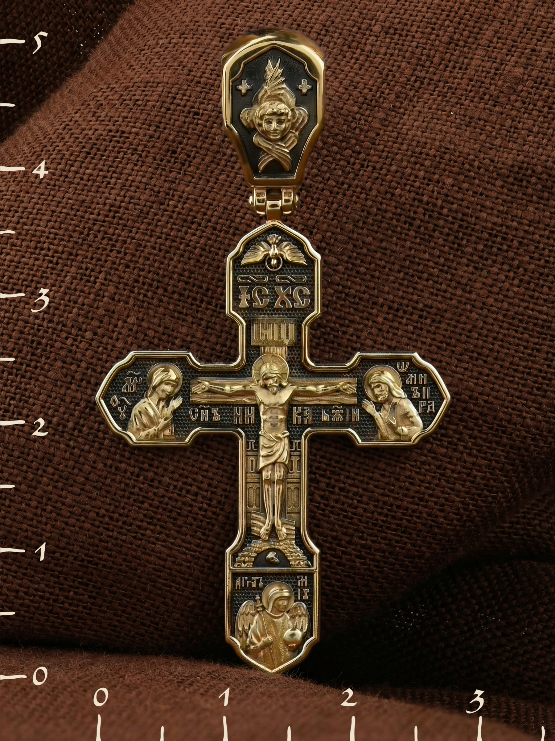 На лицевой стороне изображено Распятие Господа Иисуса Христа, над вершиной которого помещены титлы Его святого имени — «ИС ХС». Под основной перекладиной надписи — «НИКА», что в переводе с греческого означает «победитель», и словосочетание «СЫН БОЖИЙ», что означает божественную природу Иисуса Христа. С двух сторон Христу предстоят Пресвятая Богородица и св. Андрей Первозванный. Внизу — образ Архангела Михаила, могучего защитника от злых сил. Это он низверг дьявола и встал во главе ангелов для борьбы с бесовскими силами. Его имя означает «Кто яко Бог?».