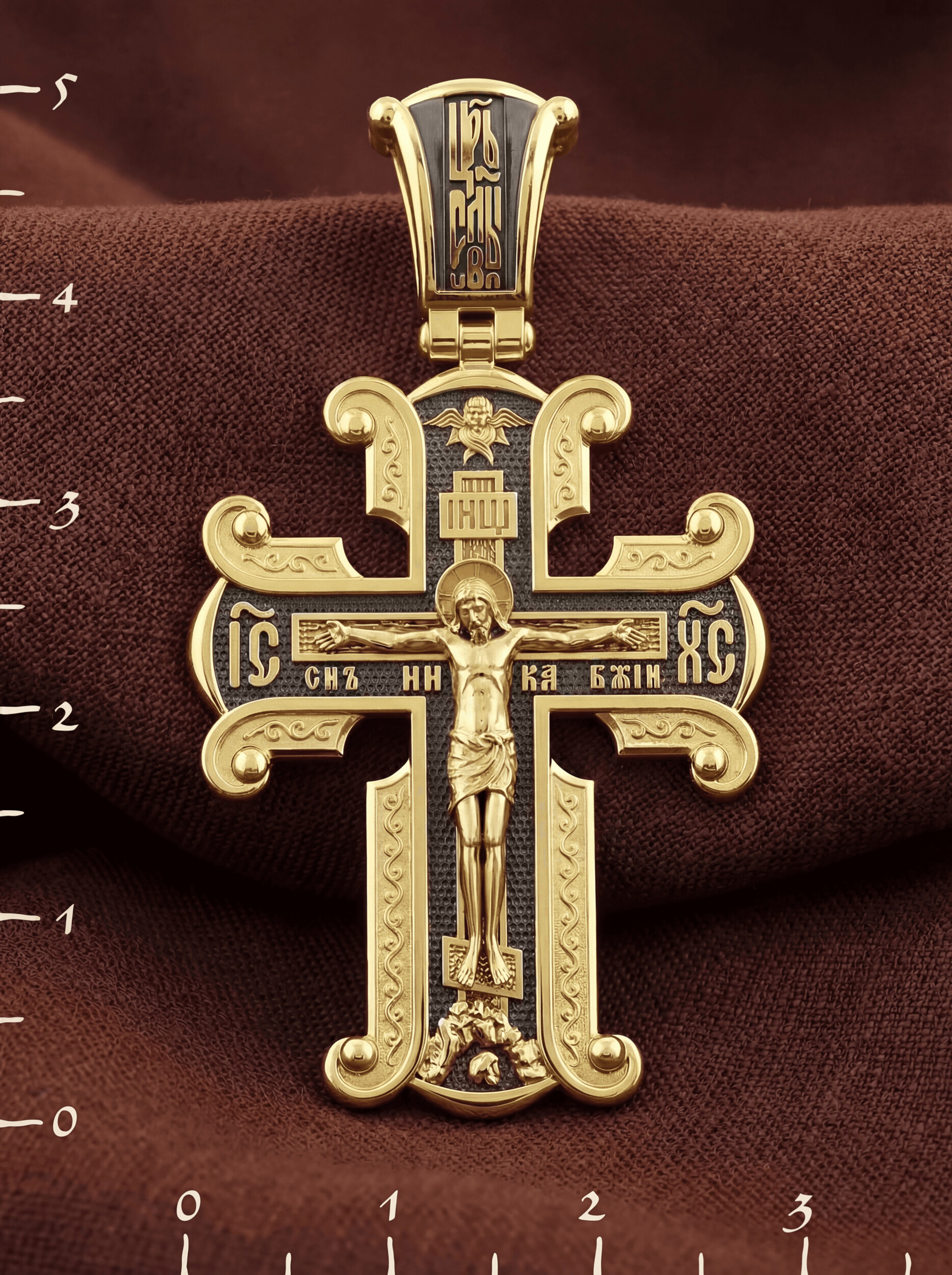 На лицевой стороне необычной формы нательного креста мы видим распятие Господне. Сам крест украшен плетением полурастительной тематики и золотым ободком, заканчивающимся завитками. На кулонном кольце с лицевой стороны надпись — Царь Славы. Под ней — шестикрылый огненный серафим, и буквы «IНЦI», означающие Иисус Назорей Царь Иудейский. С обеих сторон горизонтальной перекладины надписи — монограмма Святого имени Христа — «ИС ХС», а под ней — «НИКА» (Победитель) и «Сын Божий». В подножии мы видим изображенную гору Голгофу в виде скалистой горки с Главой Адамовой в пещере.