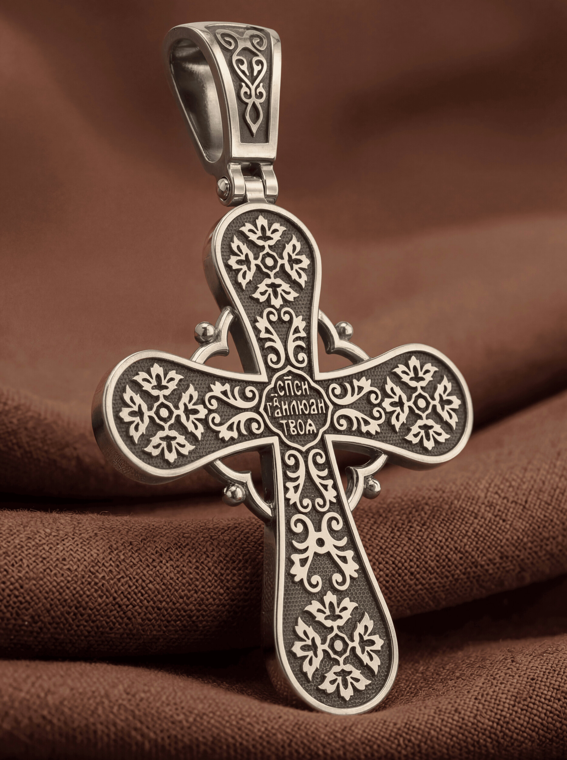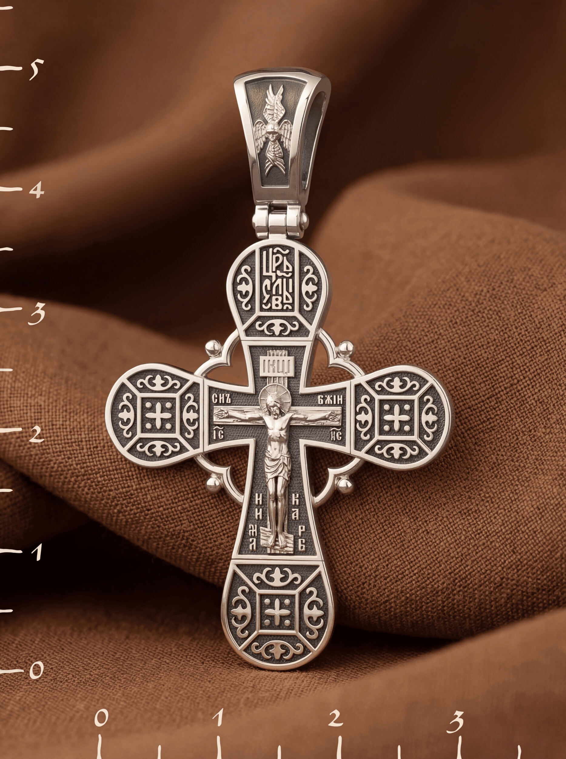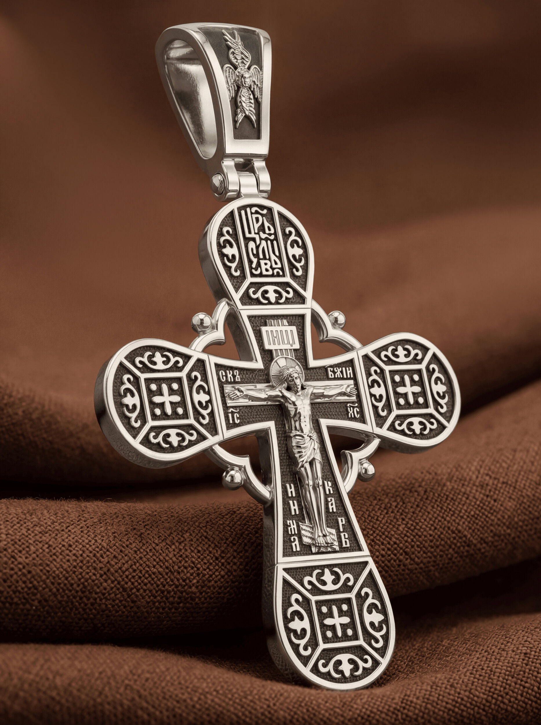 На лицевой стороне креста изображено Распятие Иисуса Христа. Позади Его изображена иерусалимская стена, знак того, что Господь был распят вне стен города. Но вместе с тем стена знаменует и Небесный Иерусалим, путь в который открылся для человечества через Голгофу: «МЛРБ», «Место Лобное Рай Бысть» — написано у ее основания. Рядом с Его образом помещены слова «Царь Славы». Эти слова характеризуют Господа как Великого Архиерея, победителя смерти. Верхняя перекладина символизирует титло — табличку, на которой, согласно Евангелию, было начертано: «Иисус Назорей Царь Иудейский» (IНЦI). Также Распятие сопровождается надписями, олицетворяющими Христа. Это святое имя Христа «IC» (Иисус) «ХС» (Христос), и словосочетание «Сын Божий», а так же написан тропарь Животворящему Кресту: «Кресту Твоему поклоняемся, Владыко, и святое воскресение Твое славим». Распятие стоит на горе камней, символизирующих Голгофу, в основании которой различается череп. Это голова Адама.