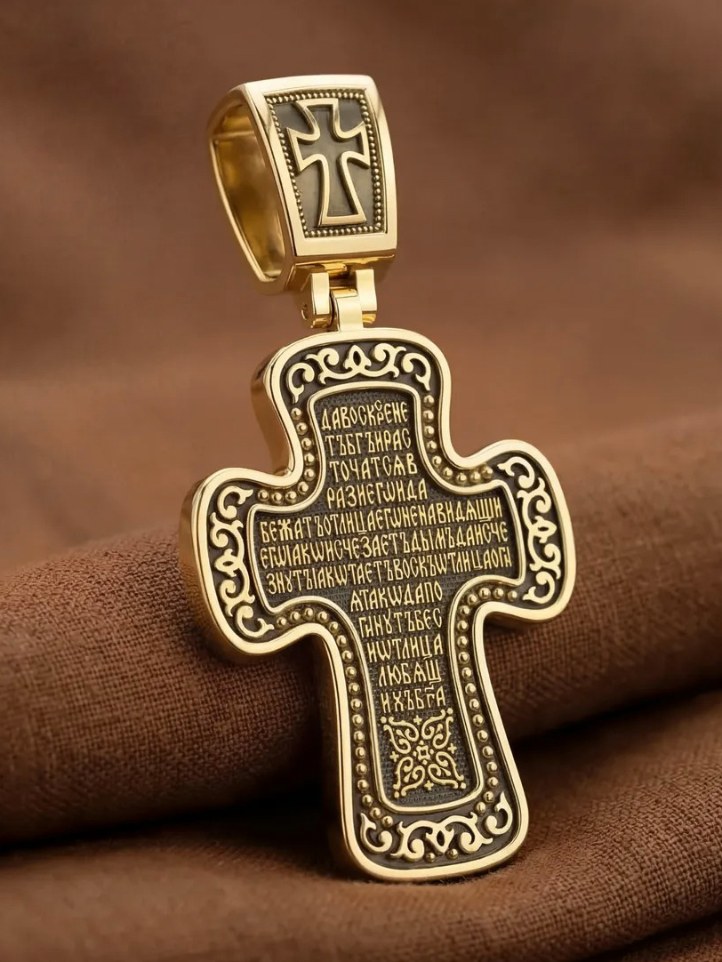 Распятие сопровождается каноническими надписями. Это святое имя Христа, которое принято писать на иконах сокращенно — «ИС ХС», словосочетание «СЫН БОЖИЙ», что означает божественную природу Иисуса Христа. Рядом с Его образом помещены слова «Царь Славы». Над головой Господа на поперечной перекладине аббревиатура «IНЦI», что символизирует табличку, которая была прибита к Кресту, с надписью «Иисус Назорей Царь Иудейский». На кулонном кольце помещено изображение Серафима.