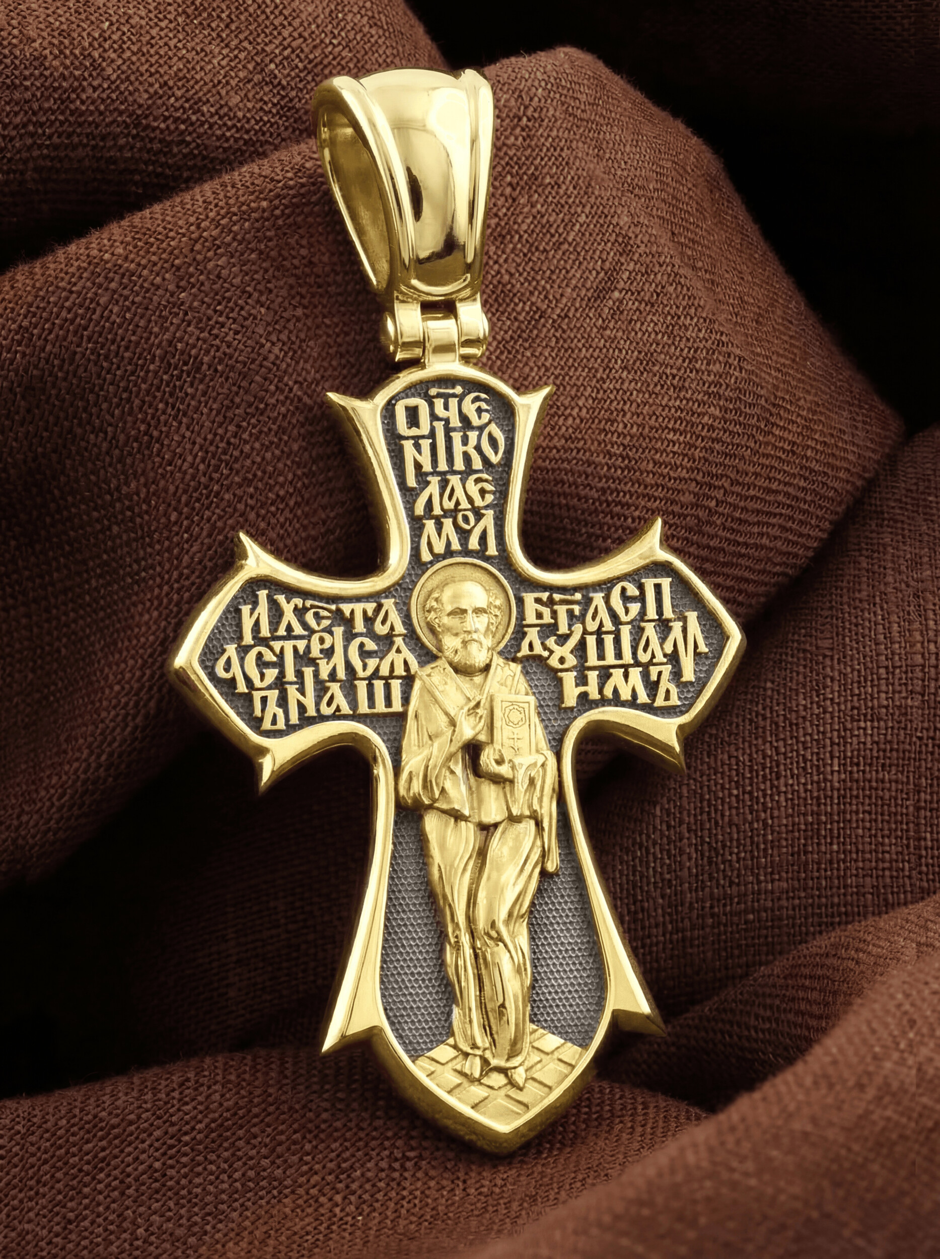 Оборотную сторону креста возглавляет икона святителя Николая Чудотворца. Живший в III веке епископ Ликийского города Миры — самый почитаемый святой не только в России, но и во всем мире. Николай Чудотворец, помощник в делах, защитник путешествующих, покровитель учащихся, утешитель обиженных и нуждающихся, целитель самых страшных и тяжелых недугов, предстатель и молитвенник за людей перед Богом. Вокруг него написана молитва: «Отче Николае, моли Христа Бога спастися душам нашим».