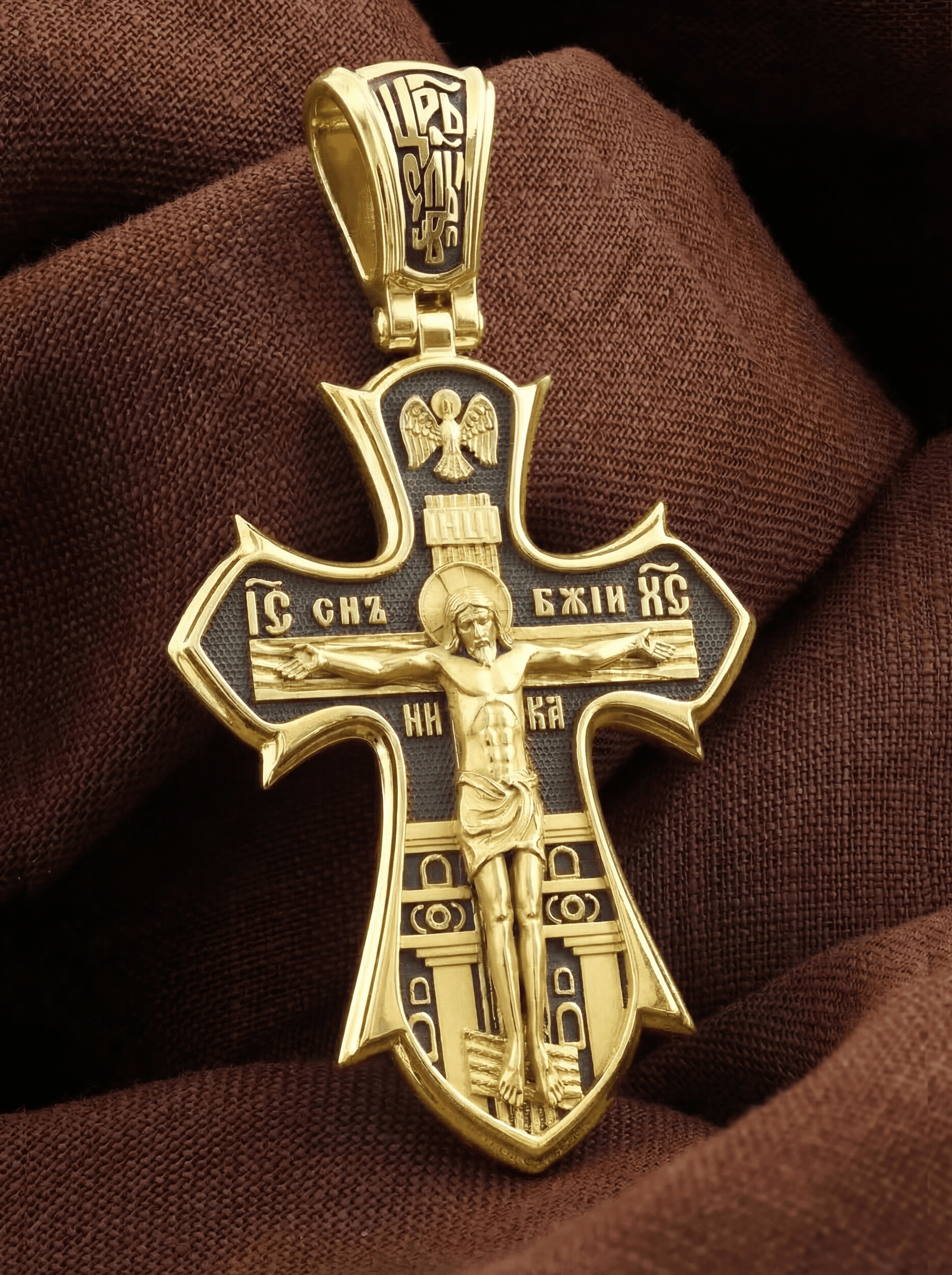 На лицевой стороне креста изображено Распятие Иисуса Христа. Господь представлен свободно покоящимся на кресте с простертыми руками и как бы обнимающим всю Вселенную. Он — Спаситель, искупивший грехи мира, «поправший смертию смерть» и призывающий к Себе «все концы земли». Поэтому рядом с Его образом помещены слова — «НИКА» и «Царь Славы». Эти слова характеризуют Господа как Великого Архиерея, победителя смерти. Верхняя перекладина символизирует титло — табличку, на которой, согласно Евангелию, было начертано: Иисус Назорей Царь Иудейский (IНЦI). Также Распятие сопровождается надписями, олицетворяющими Христа. Это святое имя Христа «IC» (Иисус) «ХС» (Христос), и словосочетание «СЫН БОЖИЙ».