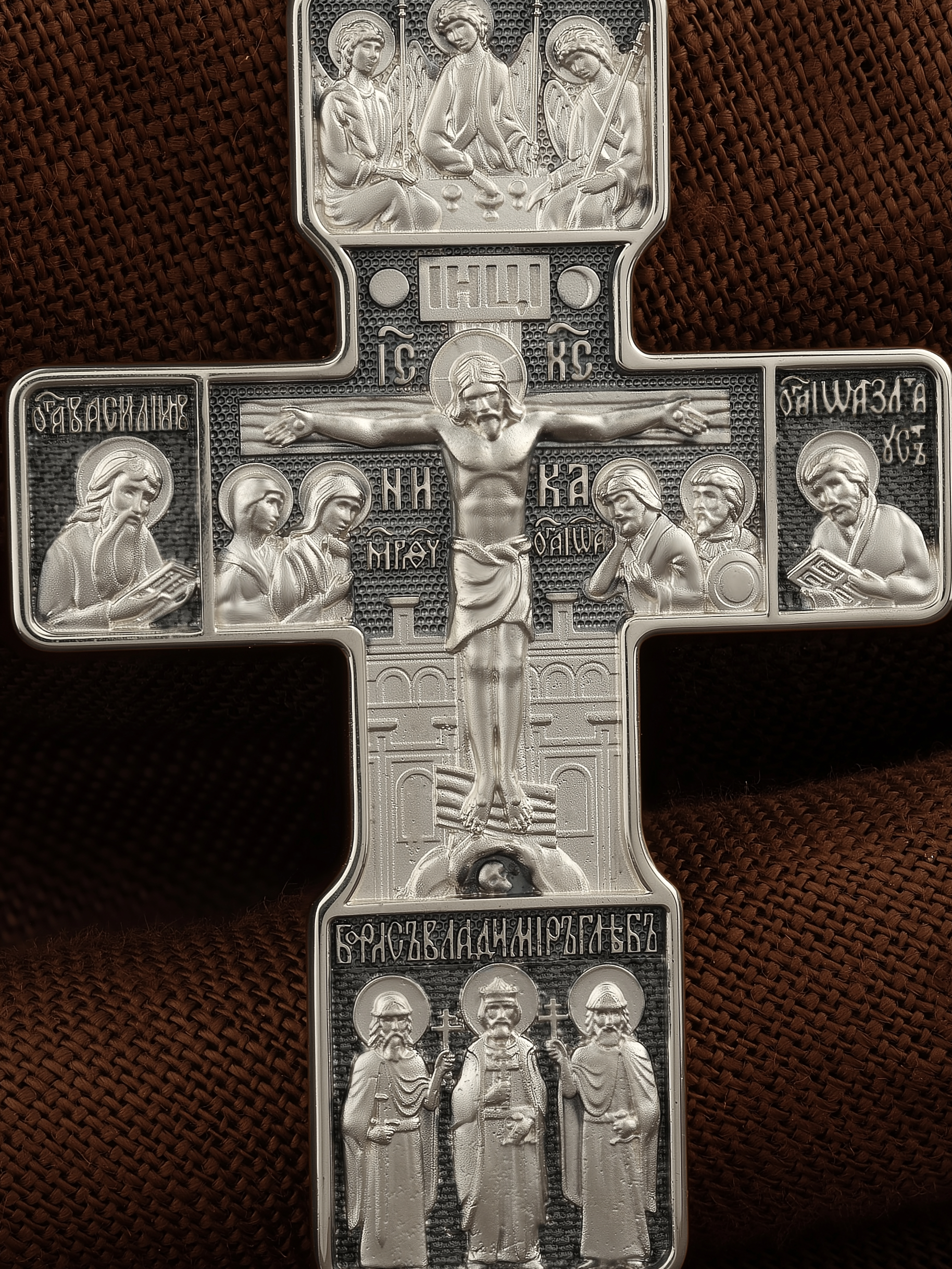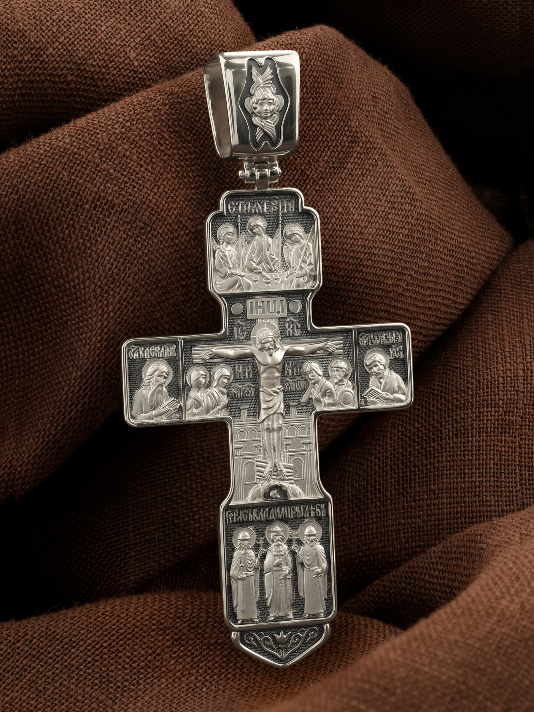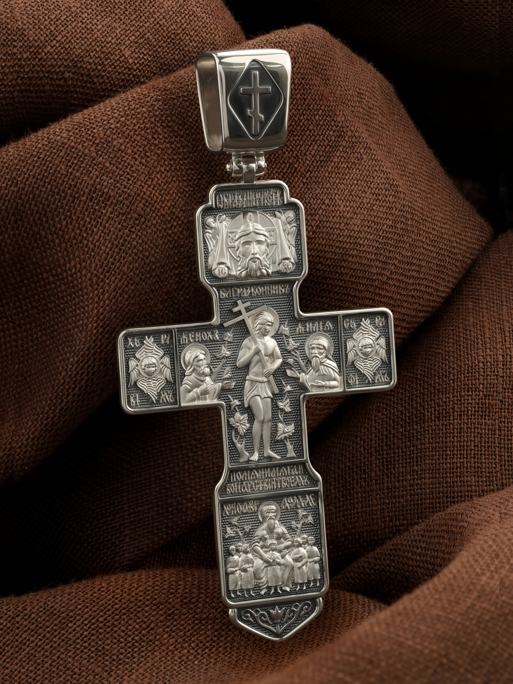 В нижней части креста изображены образы первых русских святых князей-мучеников — Бориса (князь ростовский) и Глеба (князь муромский) и святого равноапостольного князя Владимира. Страстотерпцам Борису и Глебу молятся об умиротворении Отечества, о добром нраве властей и правителей, о сохранении от междоусобицы, о даровании мужества перед лицом смертельной опасности. С Борисом и Глебом неразрывно связан образ их отца — святого равноапостольного князя Владимира, который также почитается как защитник и покровитель Русской Земли и Церкви. В молитвах его называют «отец русский» или «отец всея Руси».