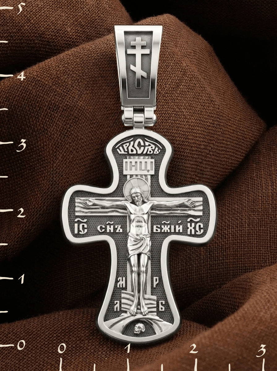 Основой композиции лицевой стороны креста является Распятие Иисуса Христа. С обеих сторон горизонтальной перекладины надписи: монограмма святого имени Христа — «ИС ХС», а под ней «Сын Божий». Над головой Господа на поперечной перекладине аббревиатура «IНЦI», что символизирует «Иисус Назорей Царь Иудейский». Венчает лицевую сторону креста надпись «Царь Славы». В подножии мы видим изображенную гору Голгофу в виде скалистой горки, а так же буквы «МЛ» «РБ», которые означают: «Место Лобное Рай Бысть». Крест стоит на горе камней, символизирующих Голгофу, в основании которой различается череп. Это голова Адама.