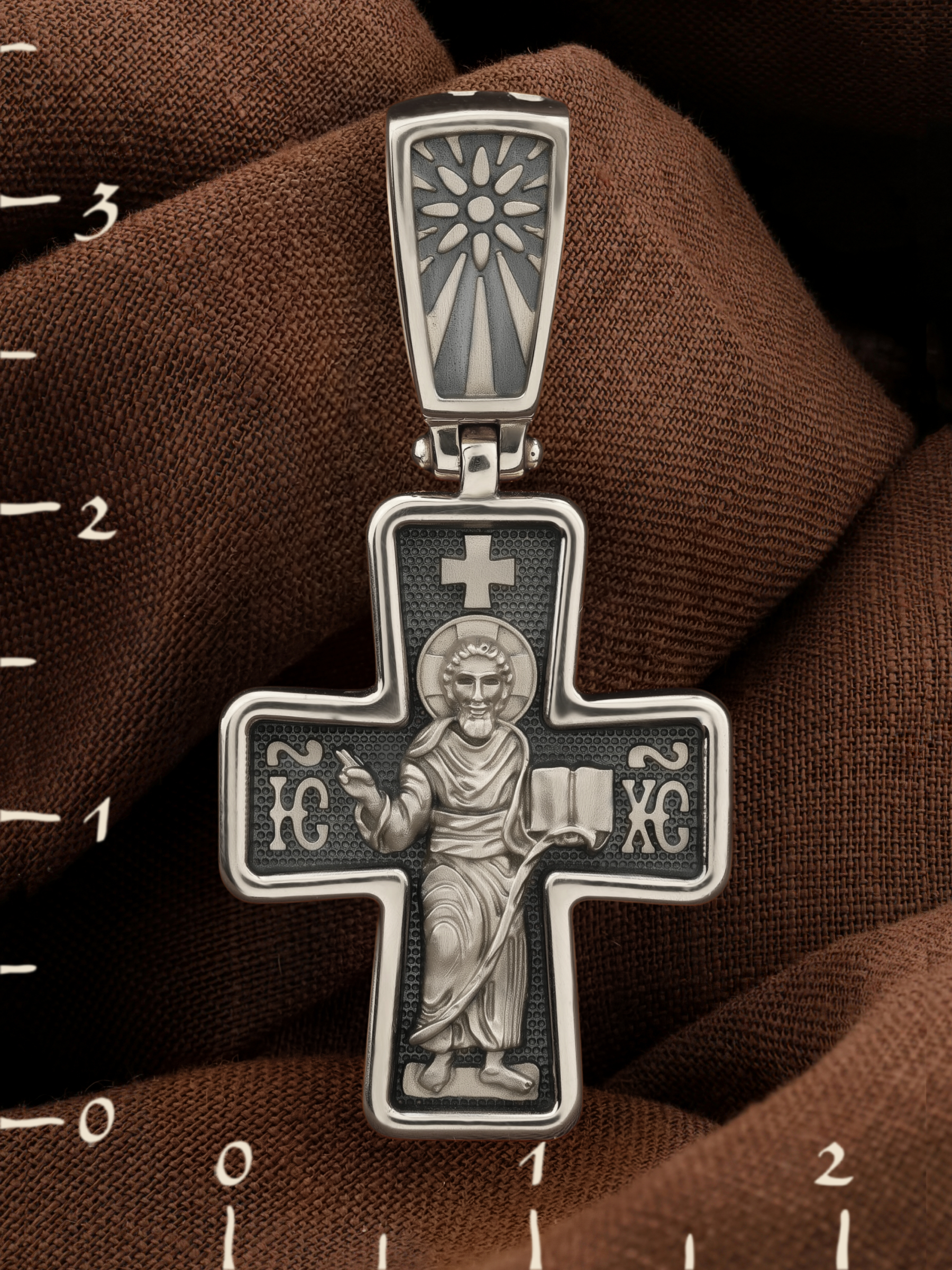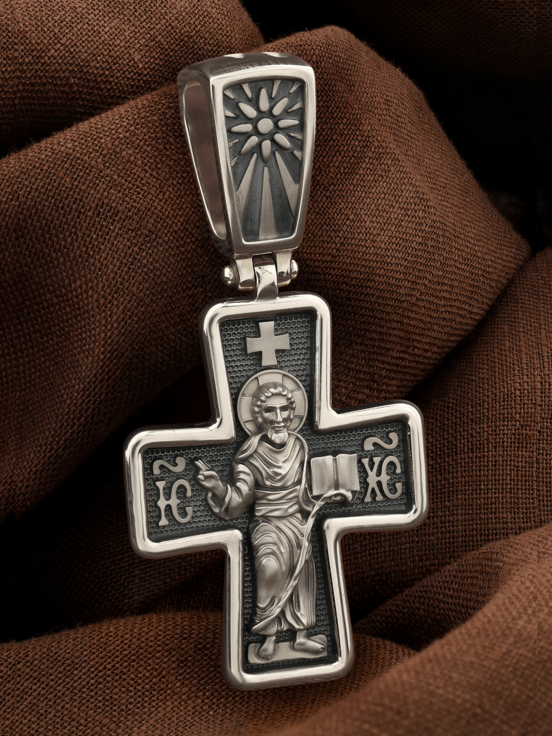 На лицевой стороне креста изображена икона Господа и Спасителя нашего Иисуса Христа  — Господь Вседержитель или Пантократор. Он представлен как Царь Небесный и будущий Судия мира. Именование Иисуса «Вседержителем» указывает, с одной стороны, на Его Божественную природу: «Аз есмь Альфа и Омега, начало и конец, говорит Господь, Который есть и был и грядет, Вседержитель» (Откр. 1: 8). С другой стороны, такое именование связано и с человеческой природой Христа, искупившего крестной жертвой людские грехи и обновившего тем самым человеческую природу. Правой рукой Он благословляет, а левой держит Книгу. Она символизирует Евангелие — благую весть, принесенную Христом всему миру. Указывая на раскрытое Евангелие и одновременно благословляя, Иисус недвусмысленно указывает нам путь к спасению души.