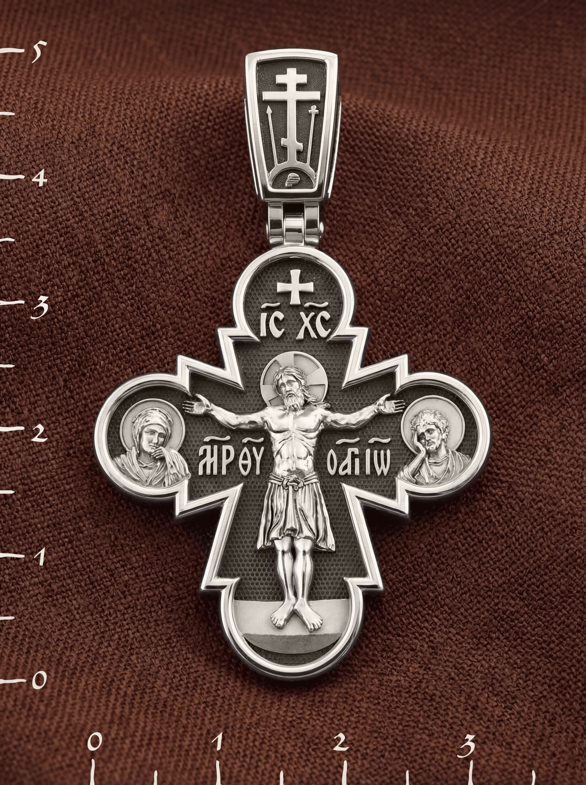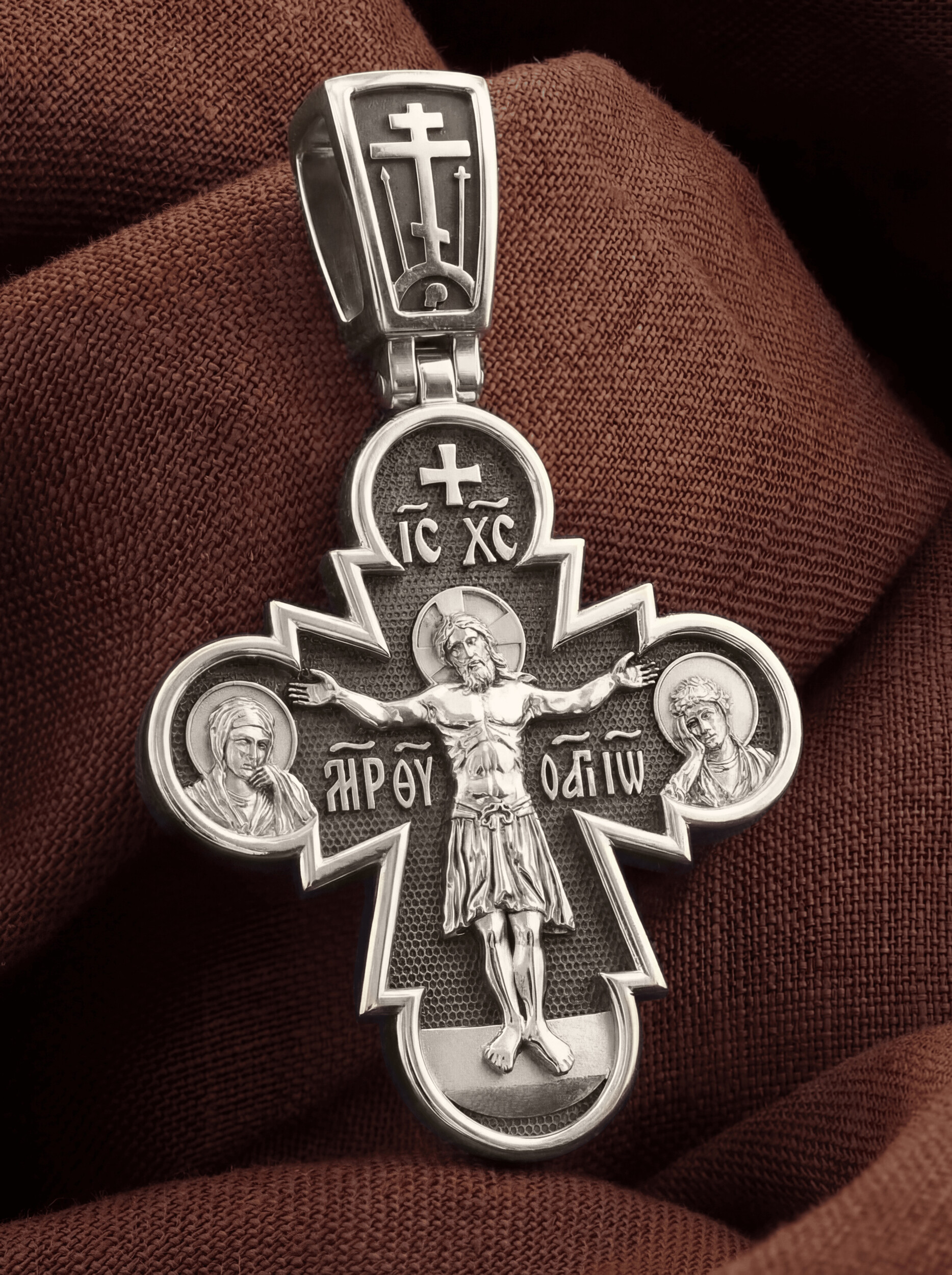 На лицевой стороне этого креста Иисус Христос является как Господь, Творец мира и его Грозный Судия, царящий на Небесах. Православная иконография показывает нам распятого Господа не в виде мучительно умирающего человека, а как величественного и всесильного Бога, который простирает руки, словно обнимает весь мир. Человеческие страдания Господа обычно только обозначаются наклоном Его головы и полузакрытыми глазами. С двух сторон Христу предстоят Пресвятая Богородица и Святой апостол и Евангелист Иоанн Богослов.