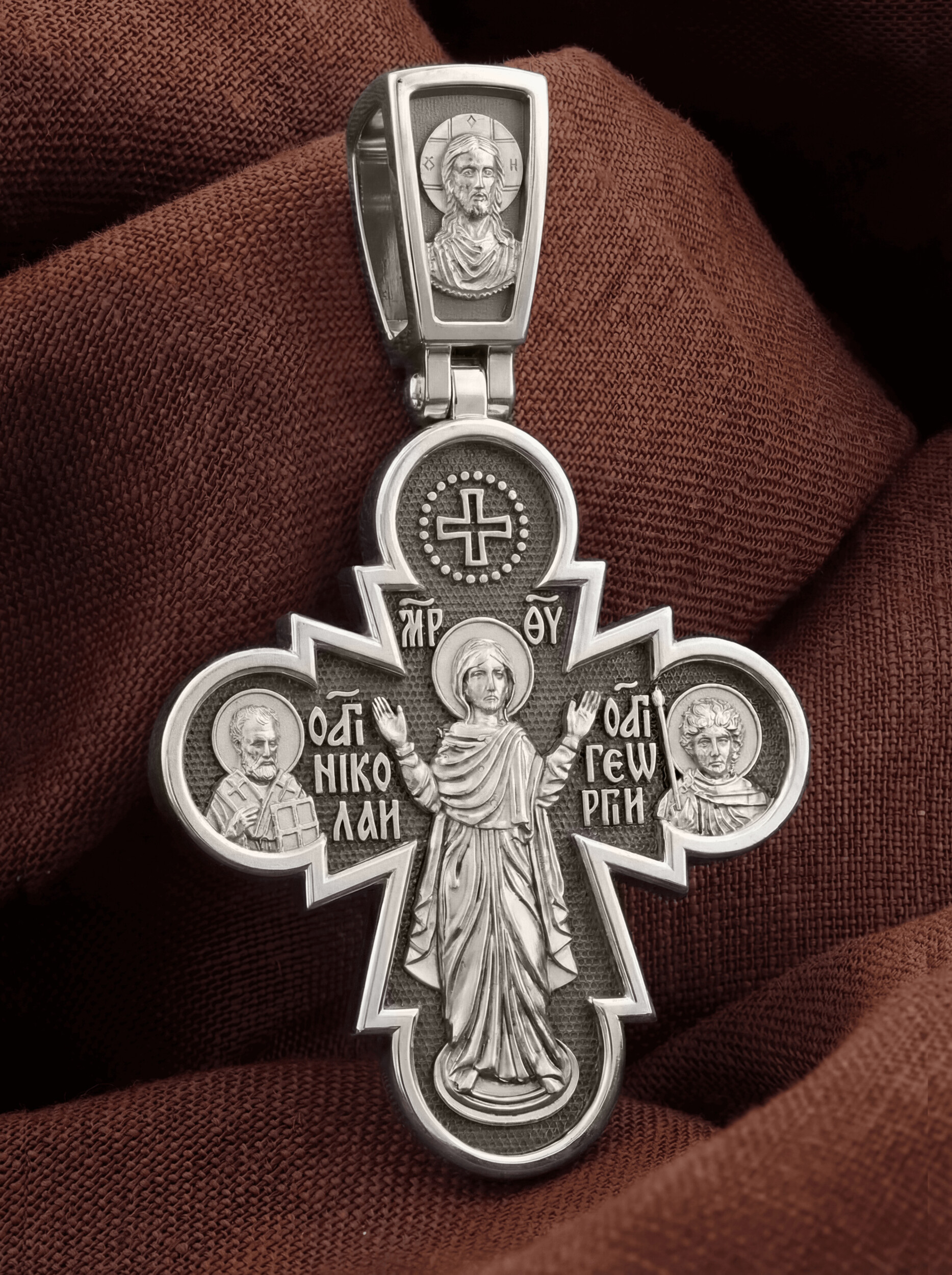 Центральную часть оборота креста занимает икона Божьей Матери «Нерушимая Стена». Особенно почитается эта икона как помощница в тяжелых жизненных ситуациях, как защитница от врагов и спасительница в смертельной опасности. Слева от Божьей Матери расположен образ Святого Николая Чудотворца. Ему молятся, отправляясь в путешествие, особенно по морю, просят исцеления в различных недугах, помощи в торговых делах, учебе и поисках достойного супруга. Справа — святой великомученик Георгий Победоносец († 303), один из наиболее почитаемых святых в Христианской Церкви. Покровитель воинов, помощник в крестьянском труде, защитник в бедах, духовный помощник в невидимой брани с силами зла. Святой Георгий, небесный защитник, который спускается с Небес, чтобы помочь душе избавиться от гибели.