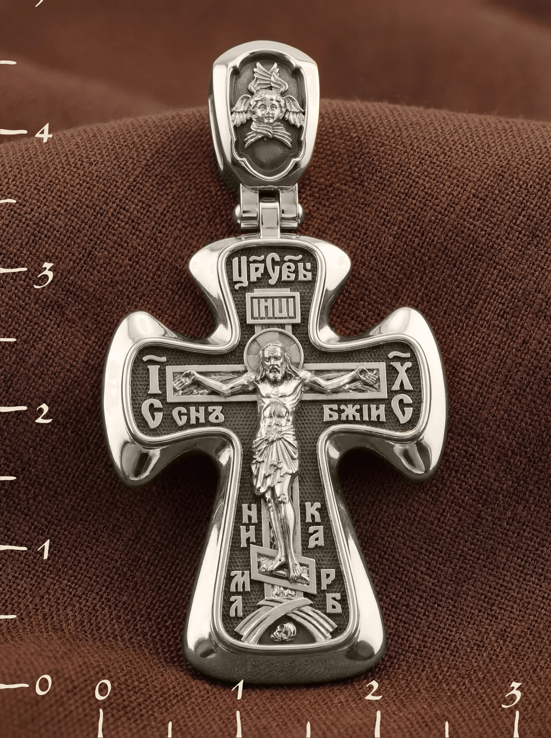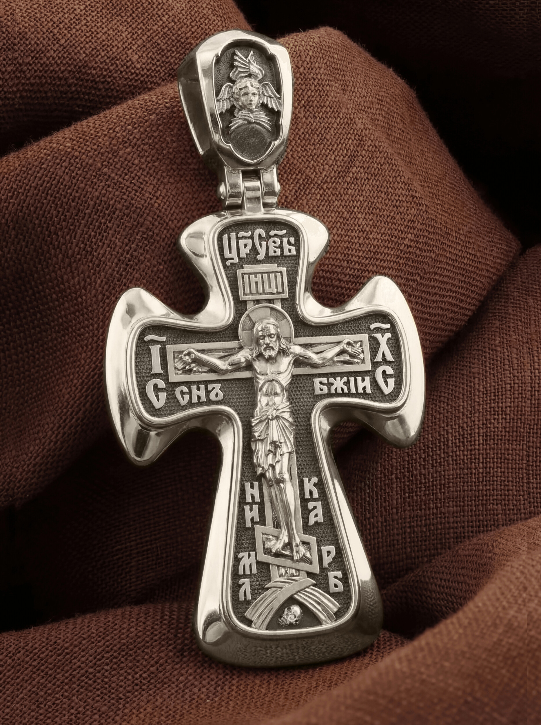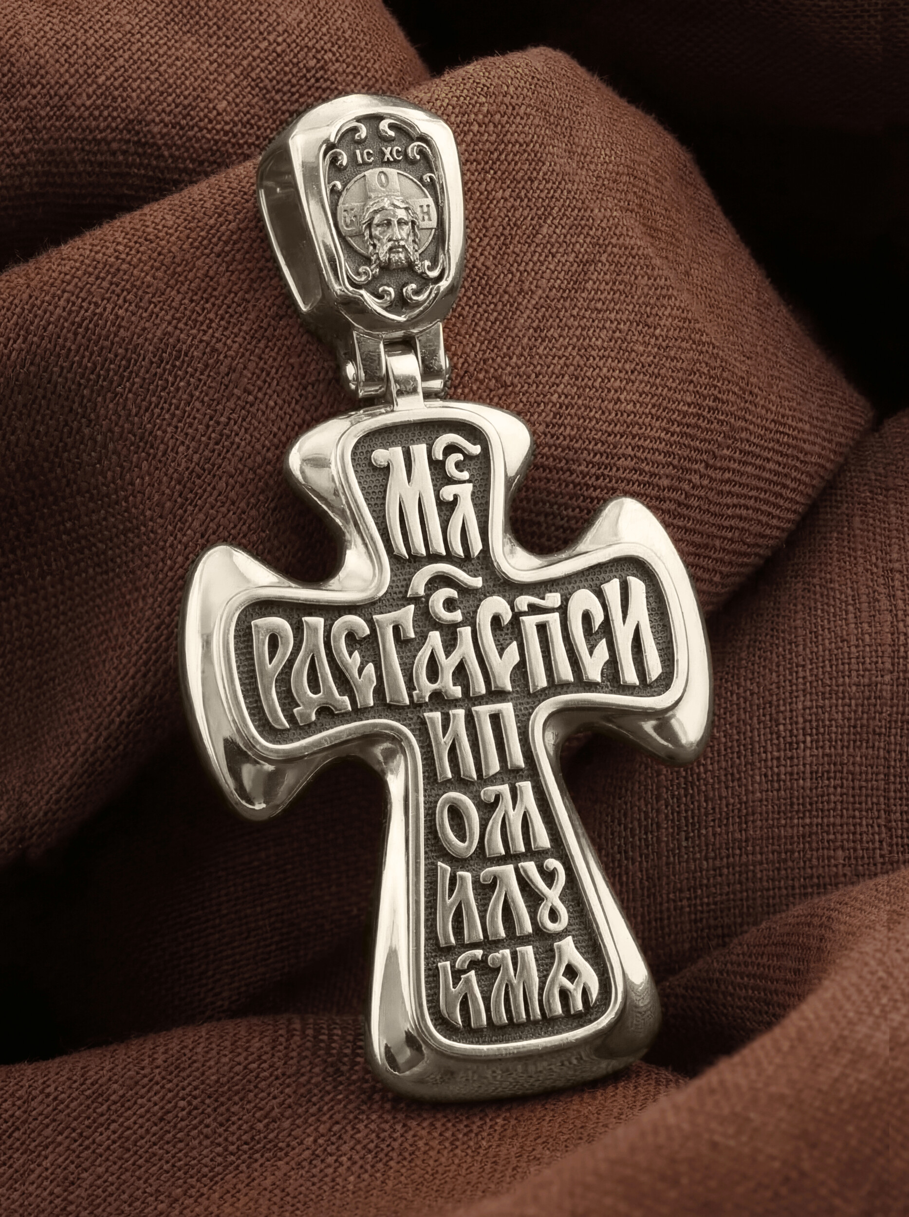 На лицевой стороне креста изображено Распятие Иисуса Христа. Господь представлен свободно покоящимся на кресте с простертыми руками и как бы обнимающим всю Вселенную. Он — Спаситель, искупивший грехи мира, «поправший смертию смерть» и призывающий к Себе «все концы земли». Поэтому рядом с Его образом помещены слова — «НИКА» и «Царь Славы». Эти слова характеризуют Господа как Великого Архиерея, победителя смерти. Также Распятие сопровождается надписями, олицетворяющими Христа. Это святое имя Христа «IC» (Иисус) «ХС» (Христос), и словосочетание «СЫН БОЖИЙ».