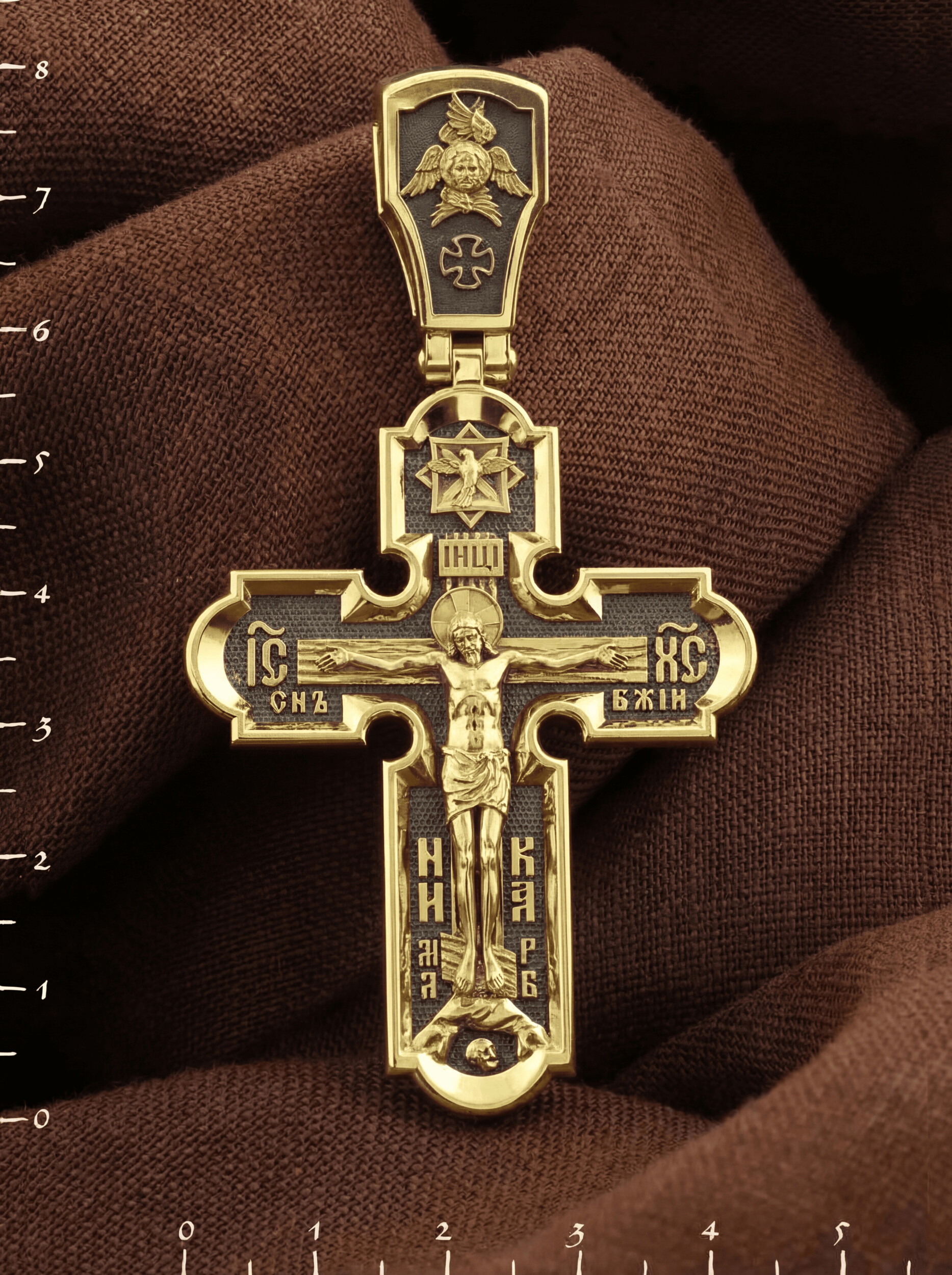 На лицевой стороне креста изображено Распятие Господа и Спасителя нашего Иисуса Христа. Христос, подвергнутый на кресте мучительной казни, своими страданиями искупил нас от древнего греха и даровал нам жизнь вечную. На верхней табличке, выше головы Иисуса, расположена надпись, составленная Понтием Пилатом — «IНЦI». Она означает «Иисус Назорей, Царь Иудейский». Надпись «IС ХС» означает Иисус Христос и словосочетание «СЫН БОЖИЙ», что означает божественную природу Иисуса Христа, помещается на разных сторонах поперечной перекладины креста. В нижней части креста находятся надписи –«НИКА» и «МЛРБ». В переводе с греческого, слово «НИКА» означает «победитель». Именно оно является символом победы Христа над смертью. Надпись «МЛРБ» — «место лобное рай бысть» означает, что место лобное стало раем. Крест стоит на горе камней, символизирующих Голгофу. Под подножием Креста изображена покоящаяся голова (череп) Адама, грехи которого Христос омыл Своею Кровью. Христос в Своей Божественной любви, над которой смерть не властна и которая, страдая, и не страдает в обычном смысле, простирает к людям со Креста Свои объятия, в которые призывается и привлекается весь мир. Поэтому Тело Его не висит, а торжественно покоится на Кресте.