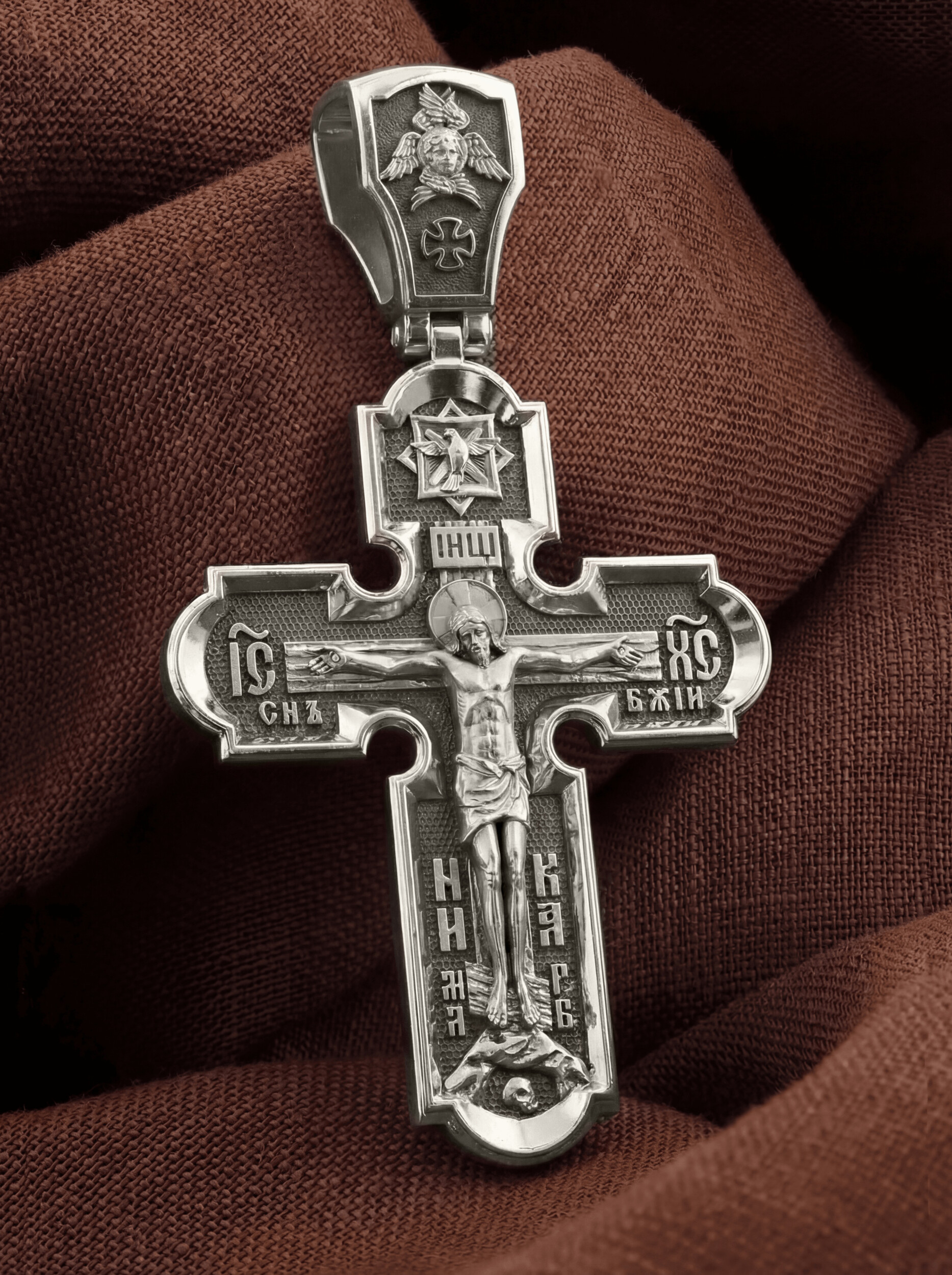 На лицевой стороне креста изображено Распятие Иисуса Христа. Господь представлен свободно покоящимся на кресте с простертыми руками и как бы обнимающим всю Вселенную. Он — Спаситель, искупивший грехи мира, «поправший смертию смерть» и призывающий к Себе «все концы земли». Поэтому рядом с Его образом помещены слова — «НИКА» и «Царь Славы». Эти слова характеризуют Господа как Великого Архиерея, победителя смерти. Верхняя перекладина символизирует титло — табличку, на которой, согласно Евангелию, было начертано: Иисус Назорей Царь Иудейский (IНЦI). Также Распятие сопровождается надписями, олицетворяющими Христа. Это святое имя Христа «IC» (Иисус) «ХС» (Христос), и словосочетание «СЫН БОЖИЙ». Крест стоит на горе камней, символизирующих Голгофу, в основании которой различается череп. Это голова Адама. На кулонном кольце помещено изображение серафима.