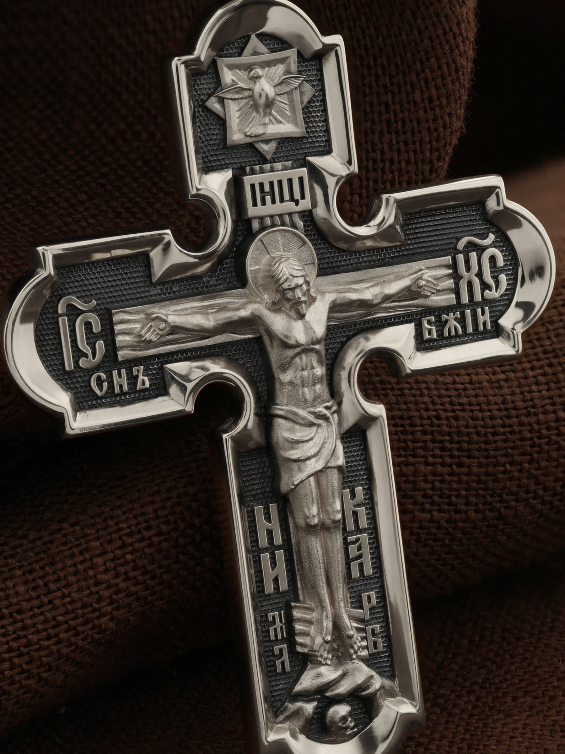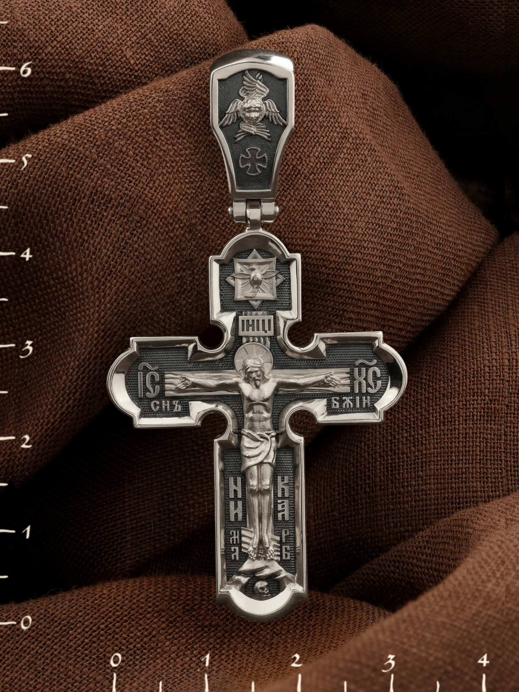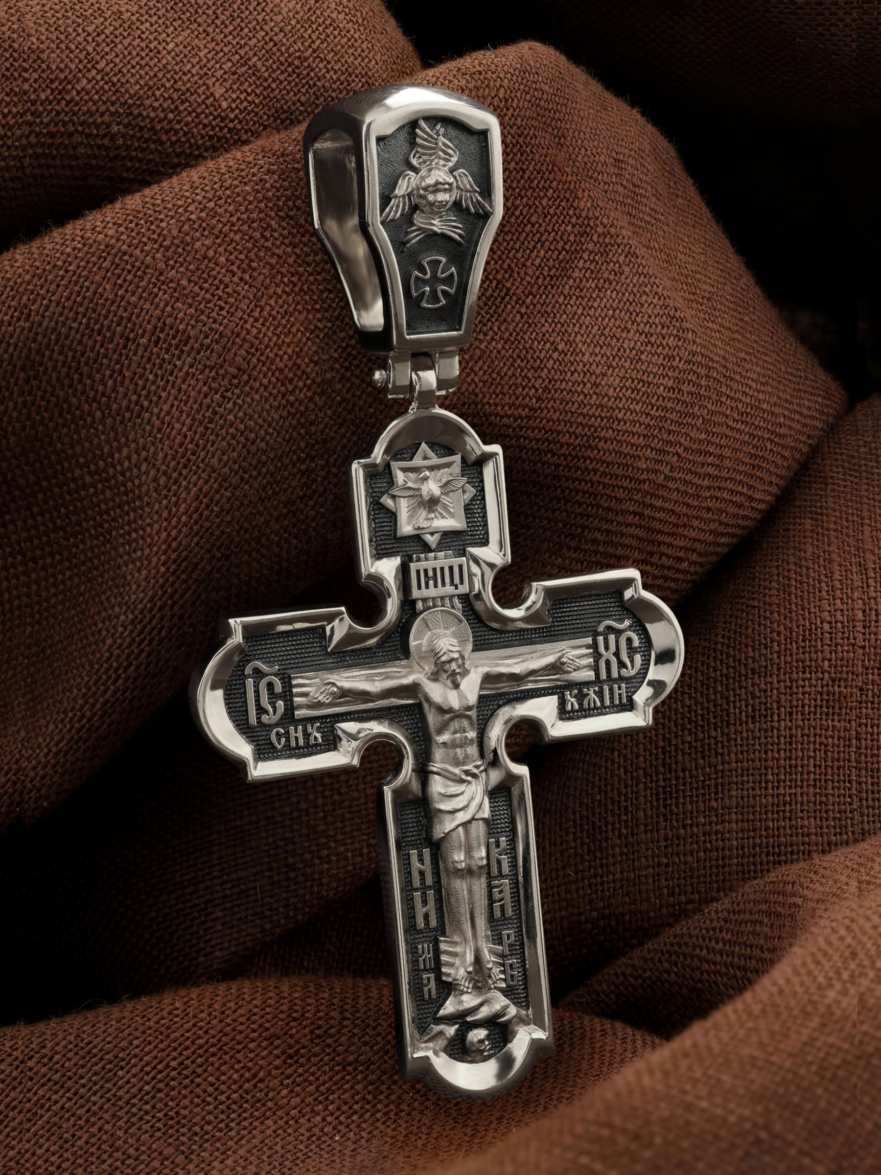 На лицевой стороне креста изображено Распятие Иисуса Христа. Господь представлен свободно покоящимся на кресте с простертыми руками и как бы обнимающим всю Вселенную. Он — Спаситель, искупивший грехи мира, «поправший смертию смерть» и призывающий к Себе «все концы земли». Поэтому рядом с Его образом помещены слова — «НИКА» и «Царь Славы». Эти слова характеризуют Господа как Великого Архиерея, победителя смерти. Верхняя перекладина символизирует титло — табличку, на которой, согласно Евангелию, было начертано: Иисус Назорей Царь Иудейский (IНЦI). Также Распятие сопровождается надписями, олицетворяющими Христа. Это святое имя Христа «IC» (Иисус) «ХС» (Христос), и словосочетание «СЫН БОЖИЙ». Крест стоит на горе камней, символизирующих Голгофу, в основании которой различается череп. Это голова Адама. На кулонном кольце помещено изображение серафима.