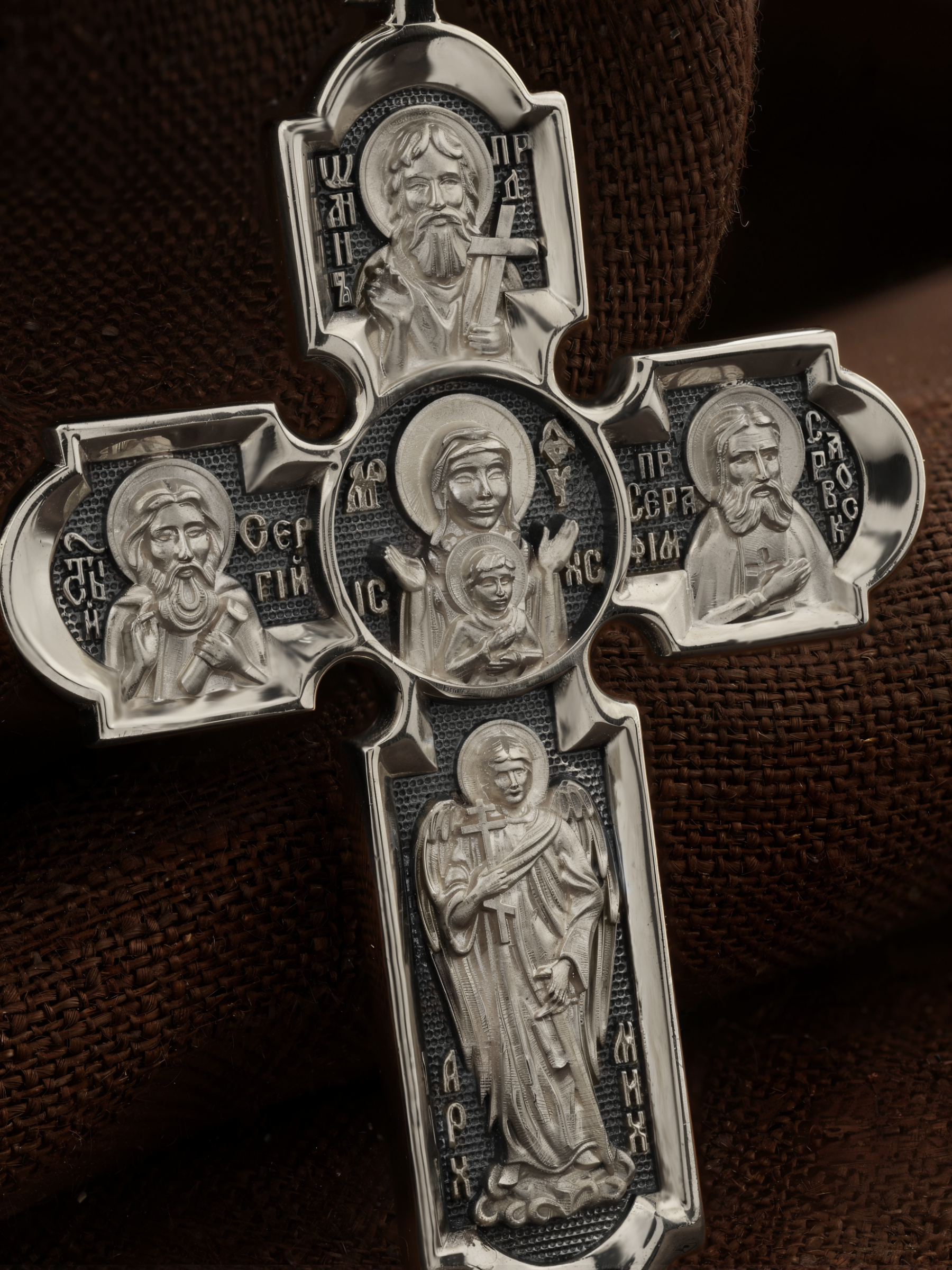 Центральную часть оборота креста украшает икона Божией Матери «Знамение». Икона «Знамение» написана по пророчеству пророка Исайи, предрекшего, что Господь Иисус Христос родится от Девы. На кресте внизу изображен Архангел Михаил, слева — прп. Сергий Радонежский, справа — образ Преподобного Серафима Саровского, вверху — последний пророк, почитающийся в христианстве, Предтеча Господень Иоанн Креститель. На кулонном кольце помещено изображение Спаса Нерукотворного — образ Спасителя, который Он запечатлел на плате и передал для исцеления больному проказой царю Эдессы. Ему придается победное и защитное значение.