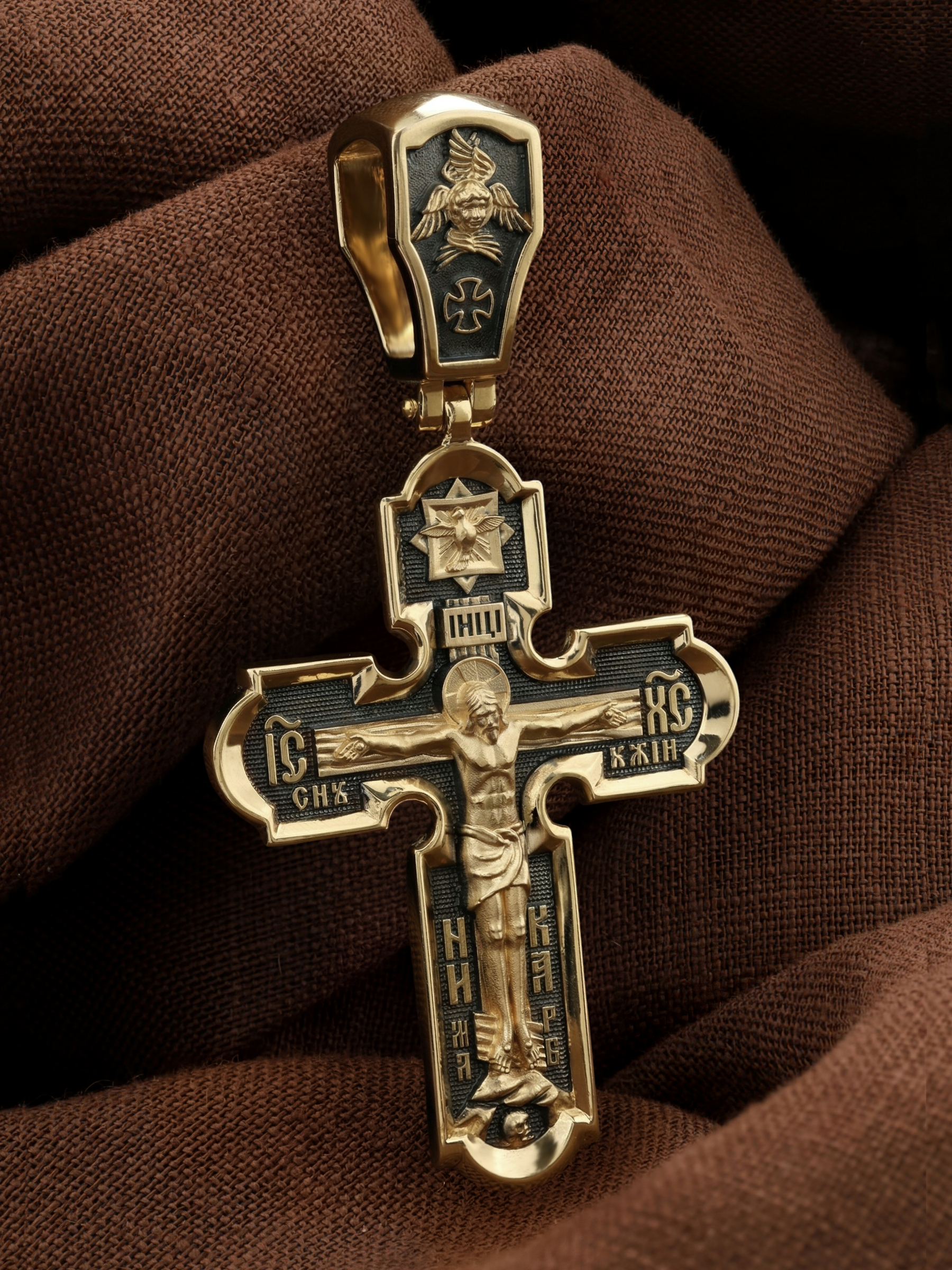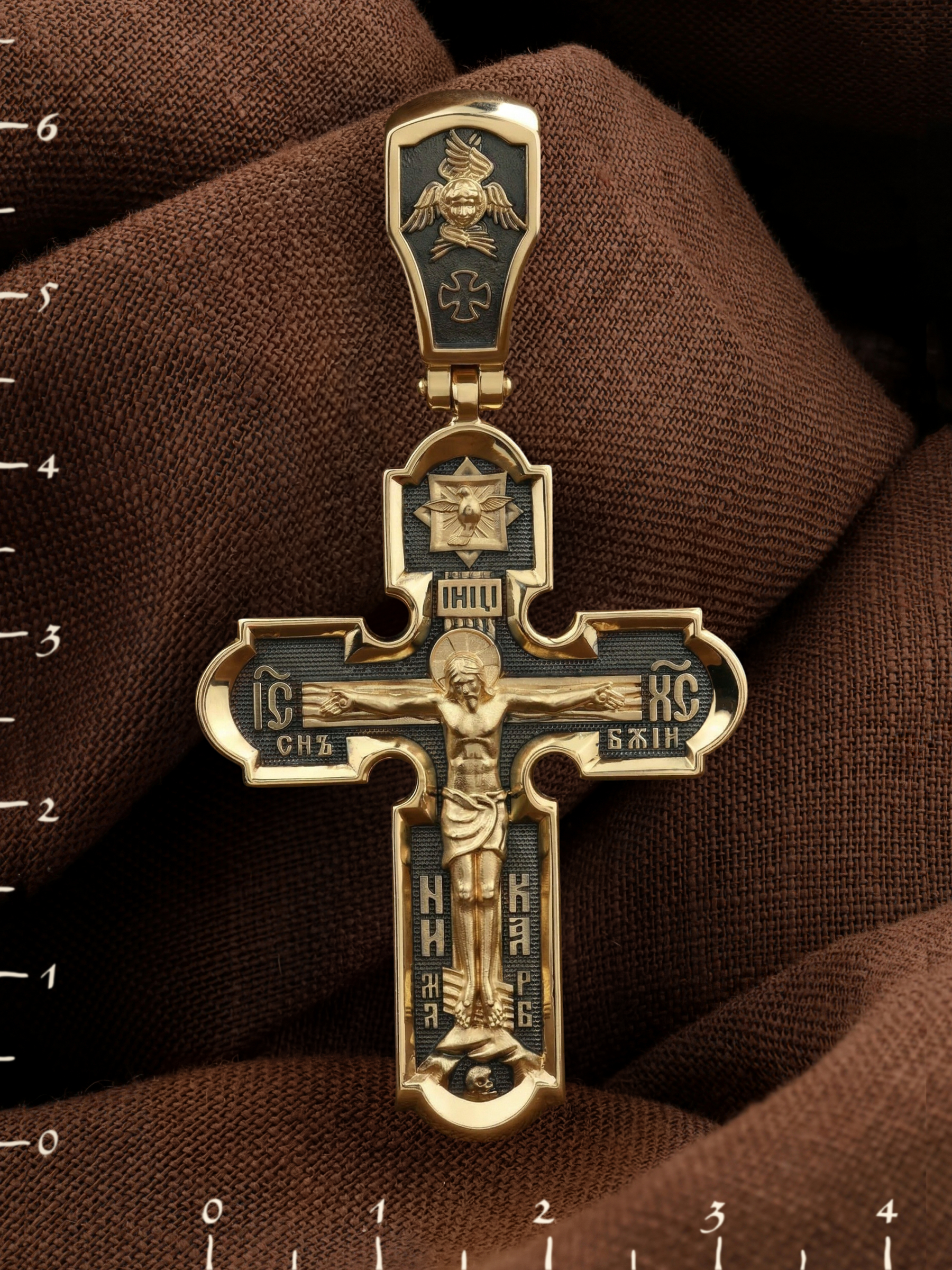 На лицевой стороне креста изображено Распятие Иисуса Христа. Господь представлен свободно покоящимся на кресте с простертыми руками и как бы обнимающим всю Вселенную. Он — Спаситель, искупивший грехи мира, «поправший смертию смерть» и призывающий к Себе «все концы земли». Поэтому рядом с Его образом помещены слова — «НИКА» и «Царь Славы». Эти слова характеризуют Господа как Великого Архиерея, победителя смерти. Верхняя перекладина символизирует титло — табличку, на которой, согласно Евангелию, было начертано: Иисус Назорей Царь Иудейский (IНЦI). Также Распятие сопровождается надписями, олицетворяющими Христа. Это святое имя Христа «IC» (Иисус) «ХС» (Христос), и словосочетание «СЫН БОЖИЙ». Крест стоит на горе камней, символизирующих Голгофу, в основании которой различается череп. Это голова Адама. На кулонном кольце помещено изображение серафима.