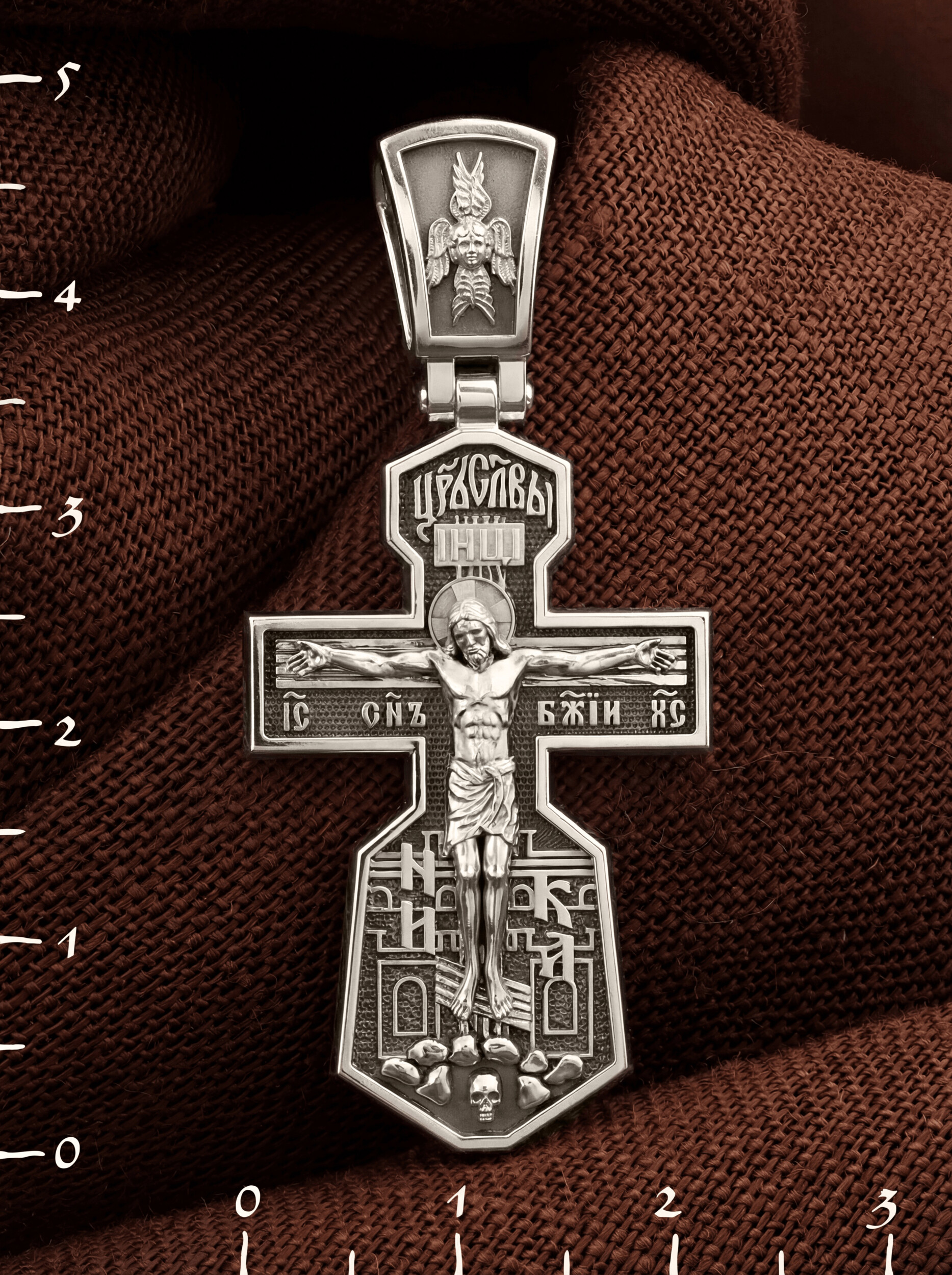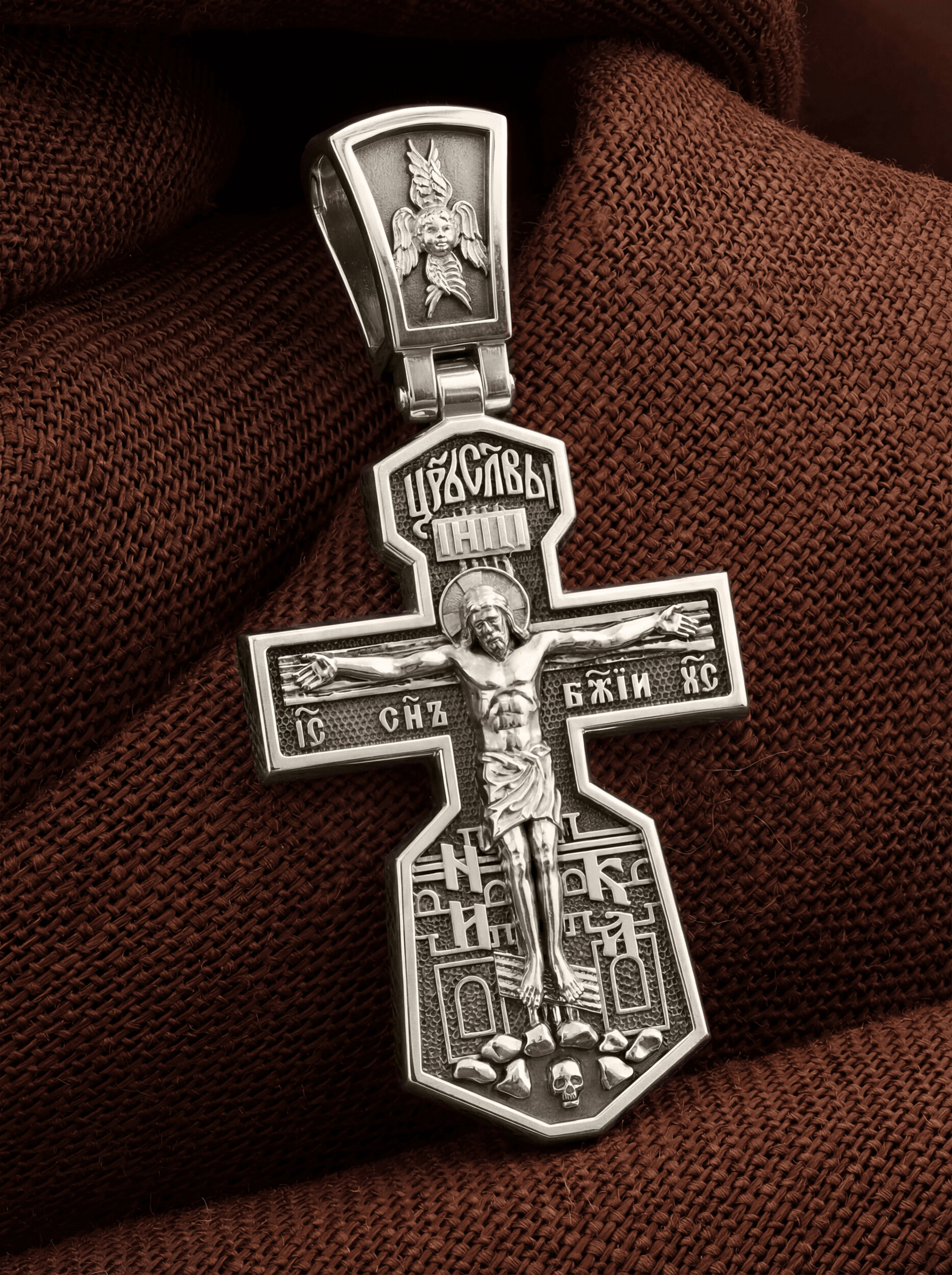 На лицевой стороне креста изображено Распятие Иисуса Христа. Господь представлен свободно покоящимся на кресте с простертыми руками и как бы обнимающим всю Вселенную. Он — Спаситель, искупивший грехи мира, «поправший смертию смерть» и призывающий к Себе «все концы земли». Поэтому рядом с Его образом помещены слова — «НИКА» и «Царь Славы». Эти слова характеризуют Господа как Великого Архиерея, победителя смерти. Верхняя перекладина символизирует титло — табличку, на которой, согласно Евангелию, было начертано: Иисус Назорей Царь Иудейский (IНЦI). Также Распятие сопровождается надписями, олицетворяющими Христа. Это святое имя Христа «IC» (Иисус) «ХС» (Христос), и словосочетание «СЫН БОЖИЙ».
