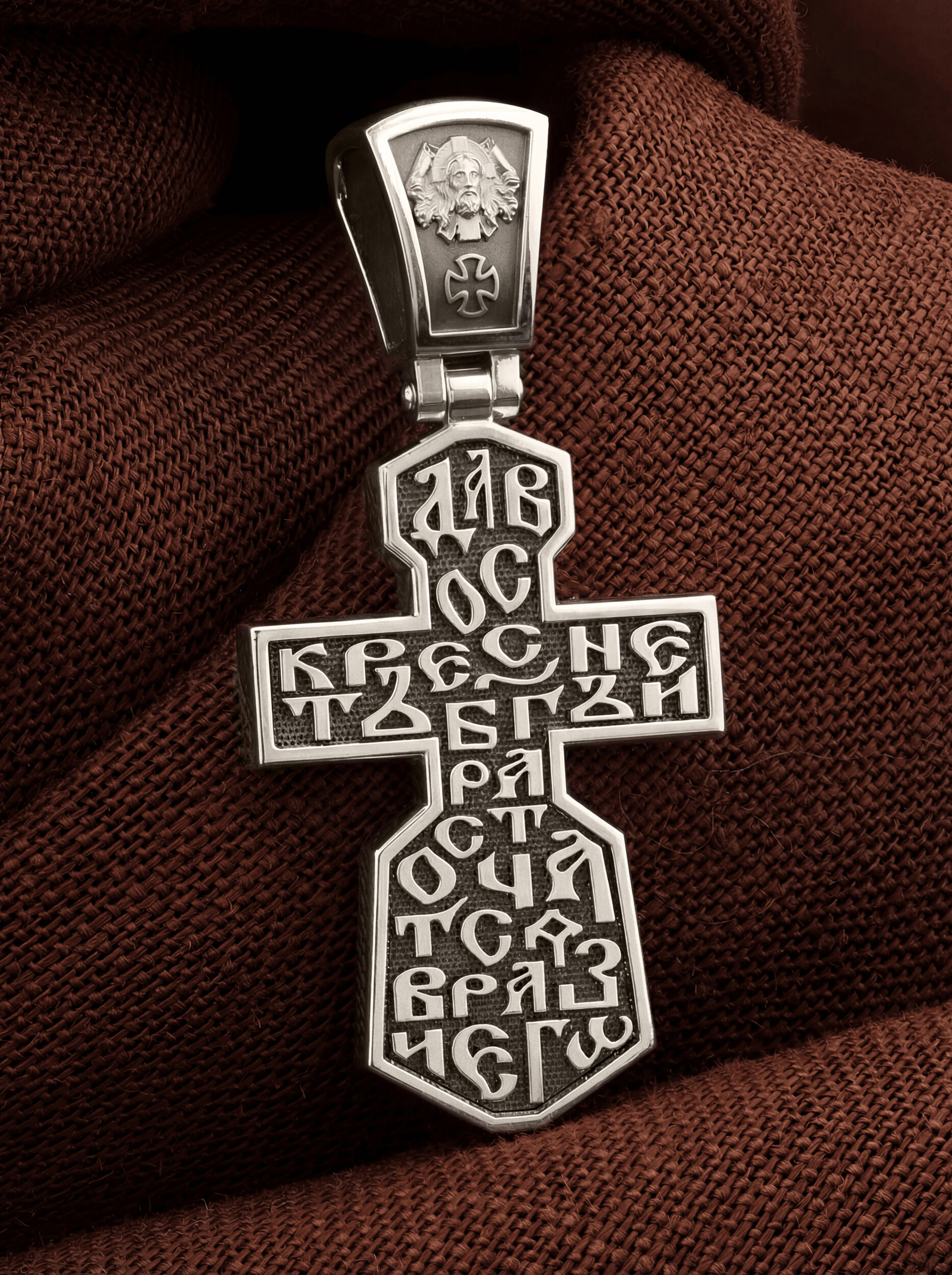 Всю оборотную часть креста занимает начальный стих оградительной молитвы Честному Кресту Господню: «Да воскреснет Бог, и расточатся врази Его».