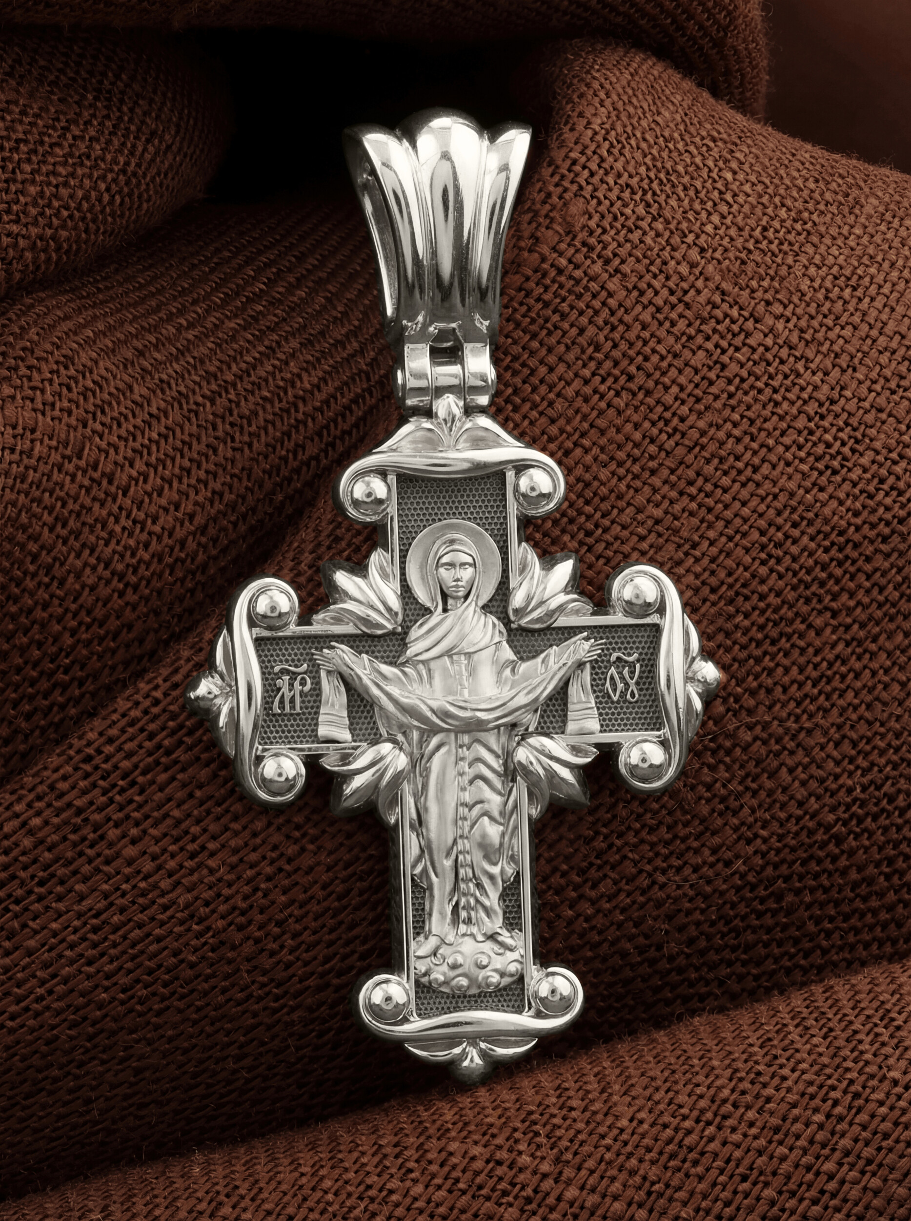 На оборотной стороне креста изображена икона Божией Матери «Покров Пресвятой Богородицы». Праздник Покрова Пресвятой Богородицы пришел на Русь в XII веке из Византии и стал одним из самых почитаемых. В 910 году Византийской Империи угрожали нападением сарацины. Не видя ниоткуда помощи, в те дни греки во множестве стекались в Константинополь, во Влахернский храм, в котором хранились риза Богоматери и Ее головной покров, и молились. 1 (14) октября 910 года Святому Андрею Юродивому и его ученику Епифанию было видение Покрова Божией Матери. Пресвятая Богородица, в окружении Святых, явилась над алтарем Храма и слезно молилась. По окончании молитвы сняла с Себя блистающее великое и страшное покрывало, которое носила на Пречистой главе Своей и, держа его с великой торжественностью, распростерла над всем стоящим народом. Вскоре враги без всякого кровопролития отступили от города. Богородица простирает Свой молитвенный покров над всеми православными христианами и умоляет Сына своего о даровании вечного спасения каждому человеку.
