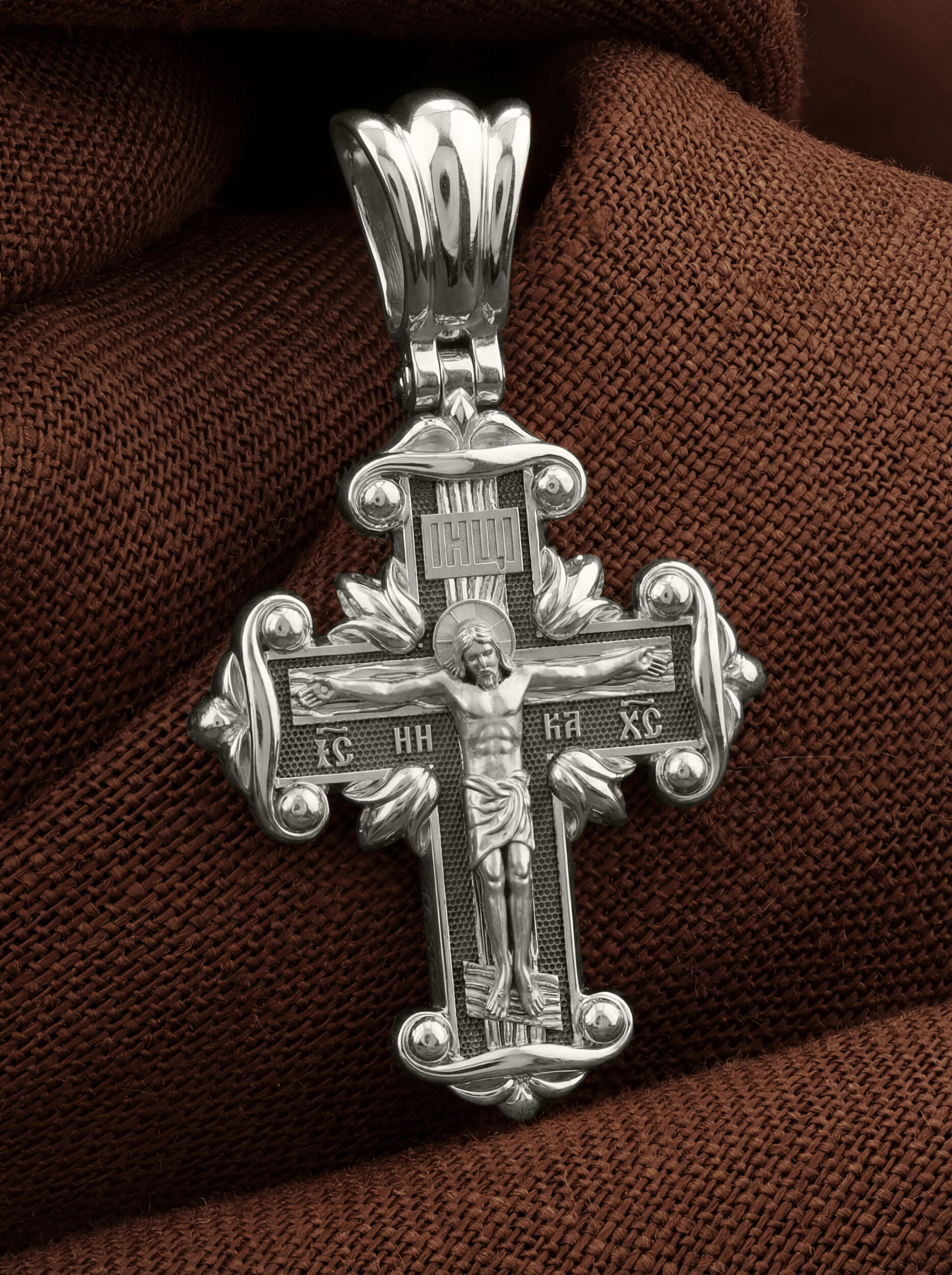 На лицевой стороне креста изображено Распятие Господа и Спасителя нашего Иисуса Христа, отдавшего Себя на смерть, для искупления грехов мира. Крест является символом жертвенной любви Всеблагого Бога к падшим людям, всепобеждающим духовным оружием христиан, основанием и средоточием церковной жизни. Господь сказал: кто хочет идти за Мною, отвергнись себя, и возьми крест свой, и следуй за Мною. (Мк. 8: 34). На верхней табличке, выше головы Иисуса, расположена надпись, составленная Понтием Пилатом — «IНЦI». Она означает «Иисус Назорей, Царь Иудейский». Надпись «IC» «ХC», означает Иисус Христос, помещается на разных сторонах поперечной перекладины креста. Рядом — слово «НИКА», что означает «победитель». На православном кресте Христос не умирает, а свободно простирает руки, ладони Иисуса открыты, будто он хочет обнять все человечество, даря им свою любовь и открывая путь к вечной жизни.
