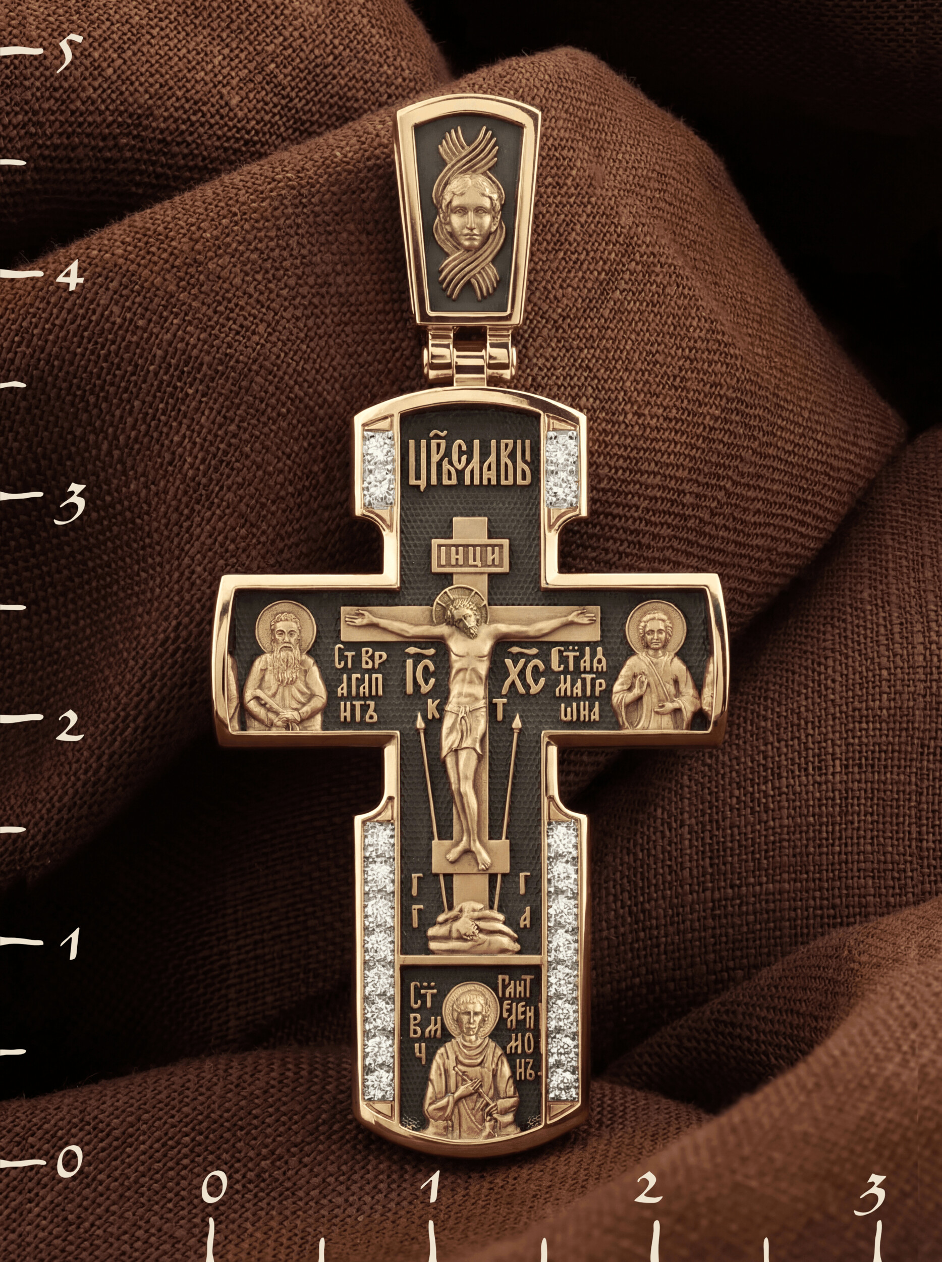 На лицевой стороне креста изображено Распятие Иисуса Христа на Голгофском Кресте, над вершиной которого помещена надпись «Царь Славы». Справа от Распятия помещен образ прославленной святой блаженной Матроны. «Матронушка», — ласково называют эту святую православные за удивительную любовь и помощь, которую она подает всем нуждающимся в ее поддержке. Слева — икона прп. Агапита. Этот святой жил в пещерах Киево-Печерского монастыря в XI веке и бескорыстно врачевал мирян и монахов.