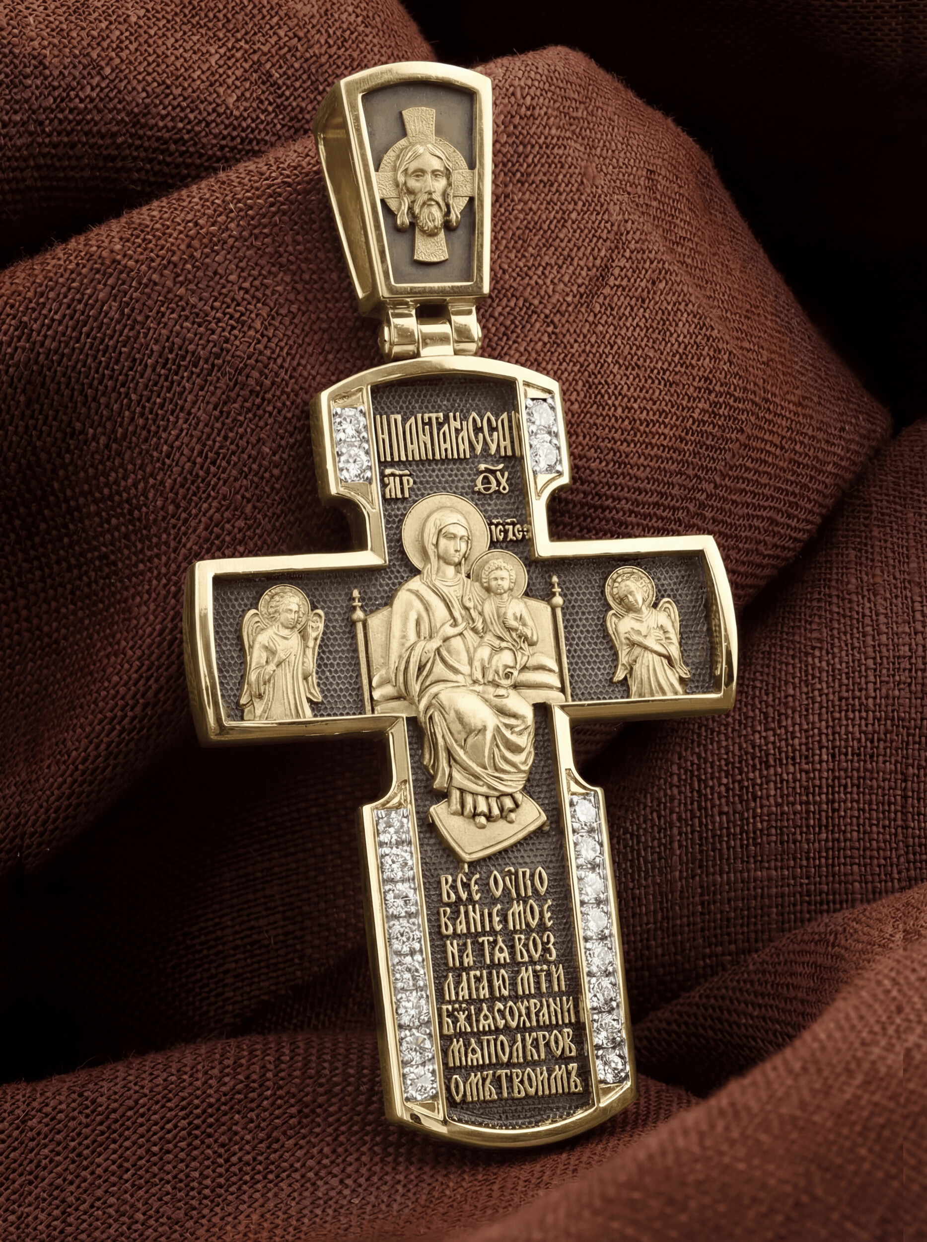 Внизу креста написана молитва обращенная к Божией Матери «Все упование мое на Тя возлагаю, Мати Божия, сохрани мя под кровом Твоим».