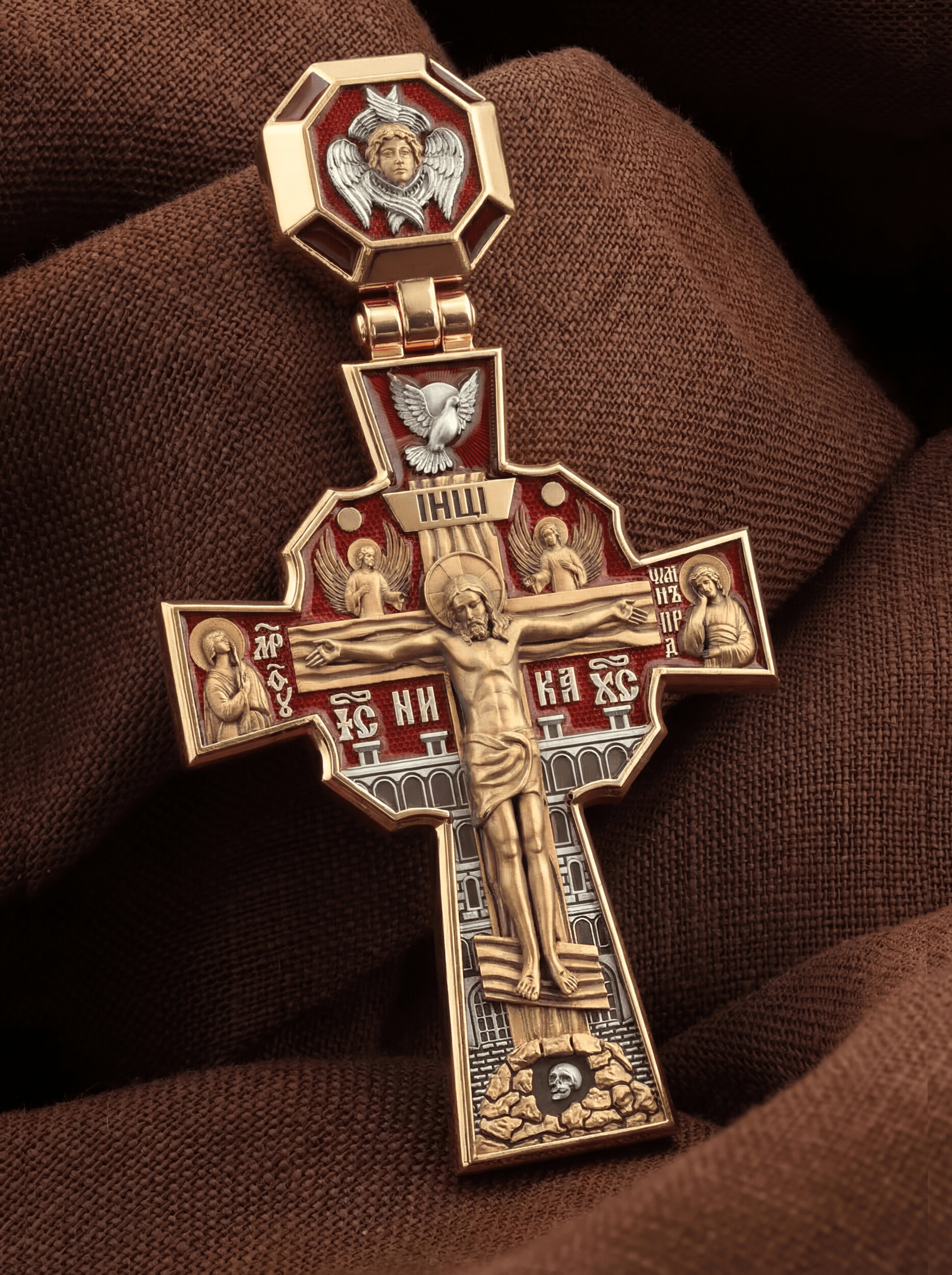 Над Распятием изображен парящий голубь — символ Святого Духа и Его благодати. На кулонном кольце изображен шестикрылый Серафим — самый приближенный к Господу Ангел.