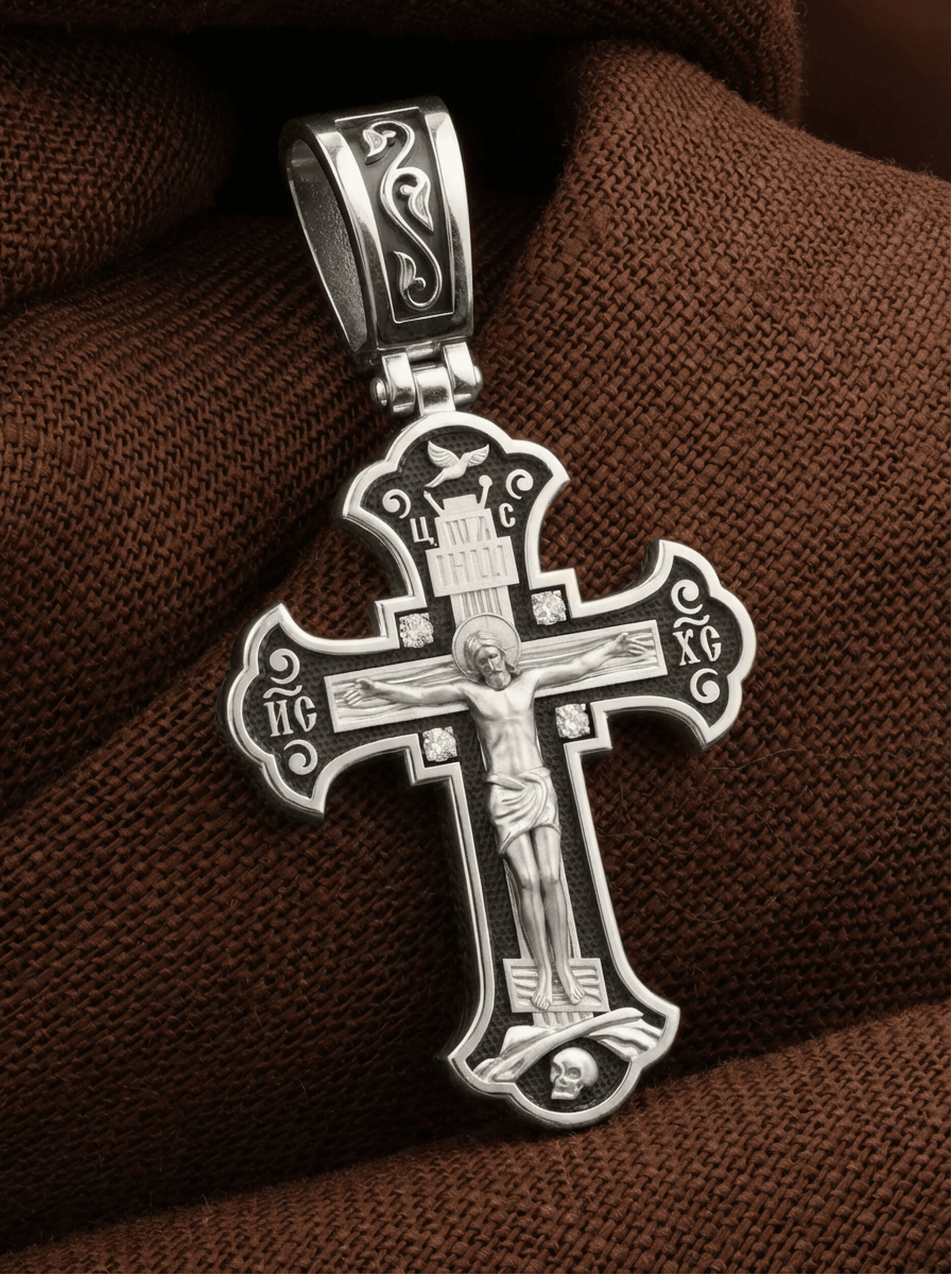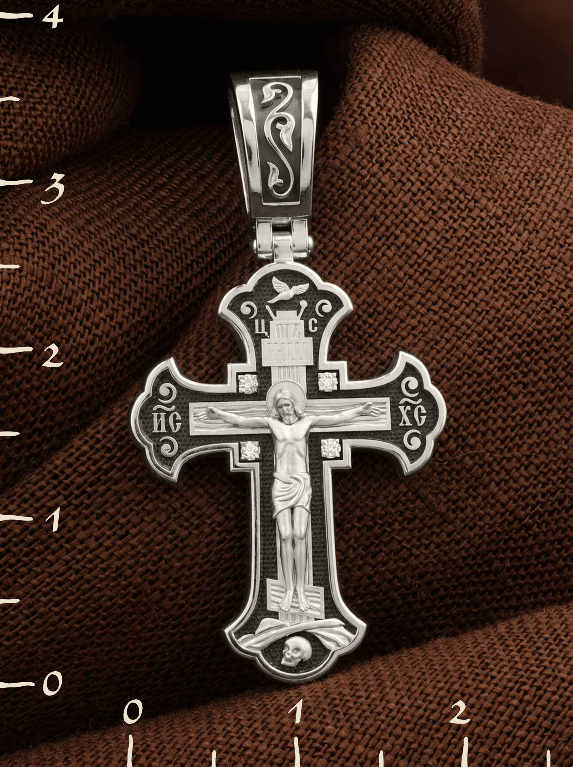 На лицевой стороне этого креста центральную часть занимает икона Распятия Христа — образ жертвы, принесенной Господом за грехи людей. Именно ко Христу, сошедшему на землю ради нашего спасения, возносятся все молитвы. Пресвятая Богородица, ангелы и святые — помощники Господа в деле спасения и заступники за людей перед Богом. «Оружием великим Христовым» именует Церковь крест, потому что, претерпев страдания и умерев, Господь победил смерть и лишил дьявола его власти над миром. Поэтому рядом с титлами Святого имени Христа написано «НИКА», что значит «победитель».