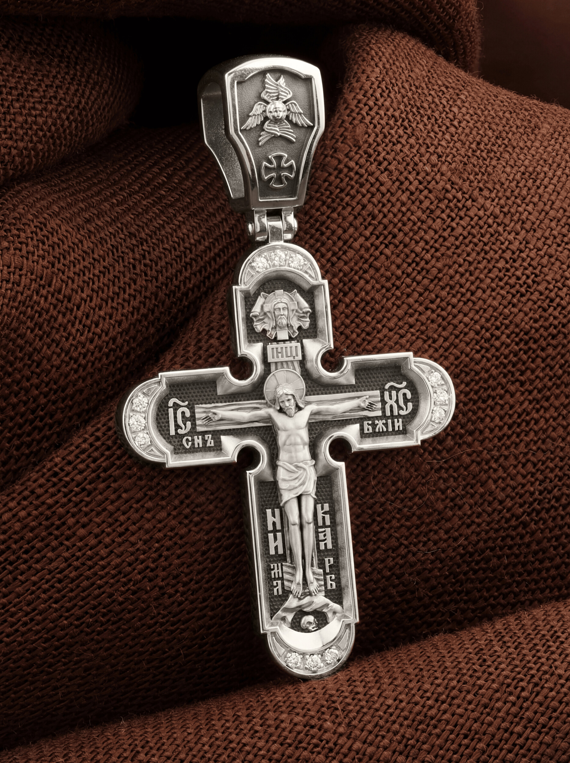 На лицевой стороне нательного креста по традиции изображено Распятие Господа нашего Иисуса Христа. Крест Господень стоит на небольшом каменистом возвышении, символизирующем гору Голгофу, которая обозначена буквами МЛРБ (Место Лобное Рай Бысть). Над головой Господа на поперечной перекладине написано «ИНЦИ», что символизирует табличку, которая была прибита к Кресту, с надписью «Иисус Назорей Царь Иудейский». Этим иудеи хотели посмеяться над Христом, не зная, что распинают истинного Царя всех царей. По сторонам основной перекладины расположены позолоченные рельефные инициалы Христа «ИС ХС». Под перекладиной, по сторонам древа, находится надпись «СЫН БОЖИЙ», а в основании креста — надпись «НИКА» (Победитель).